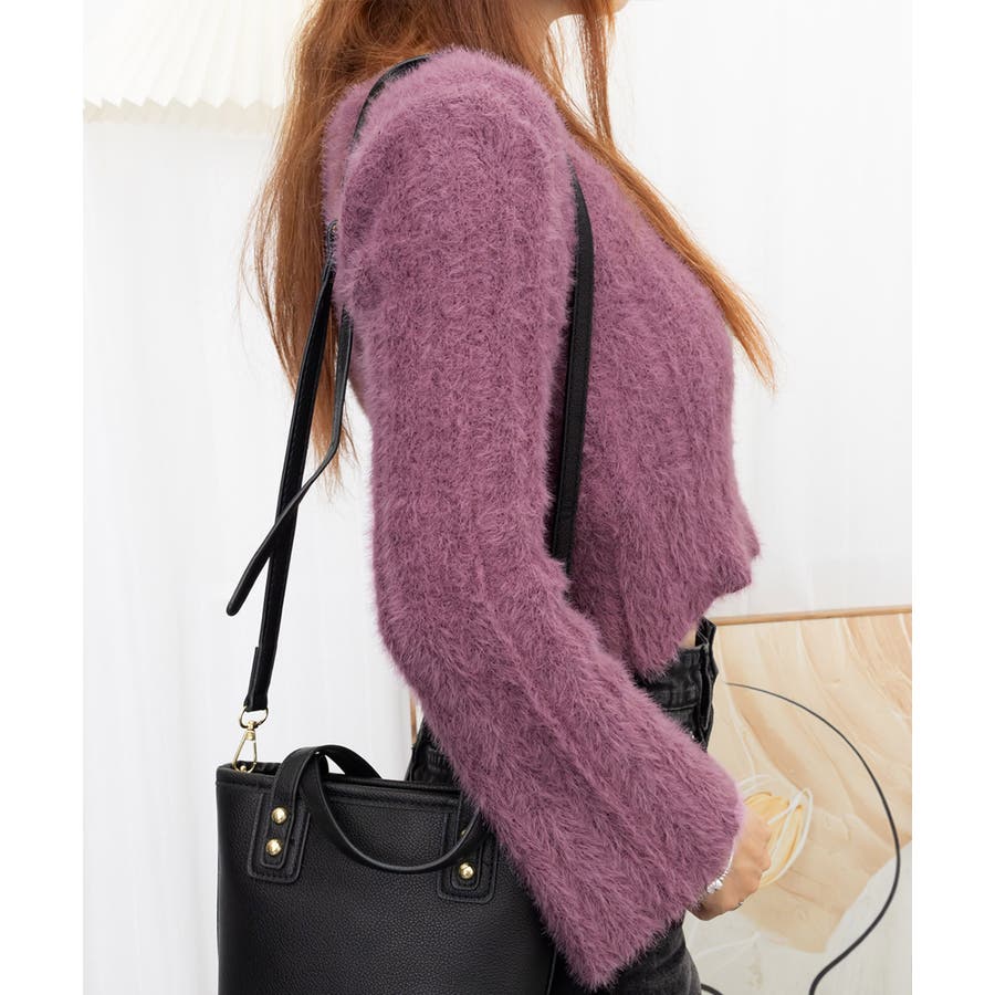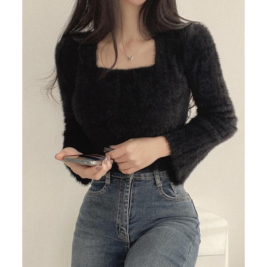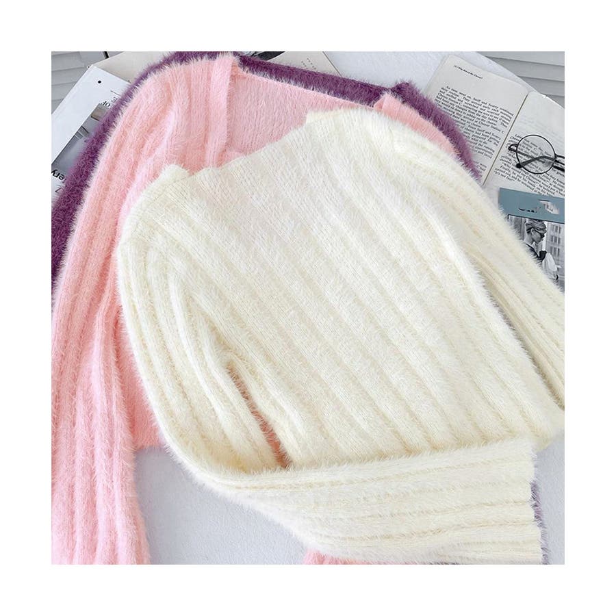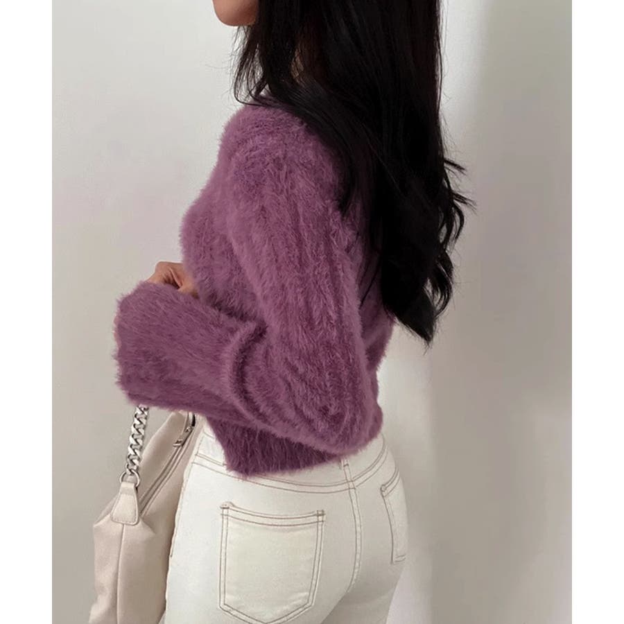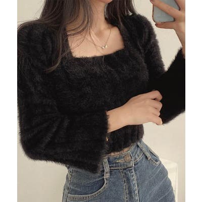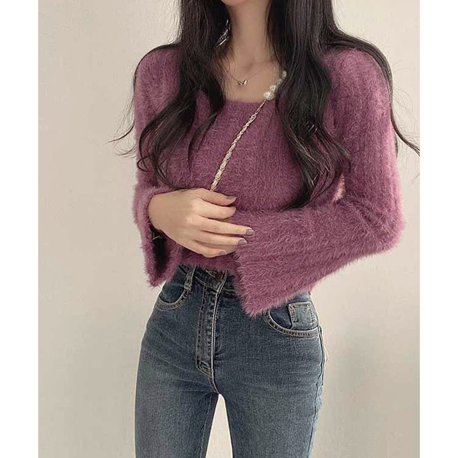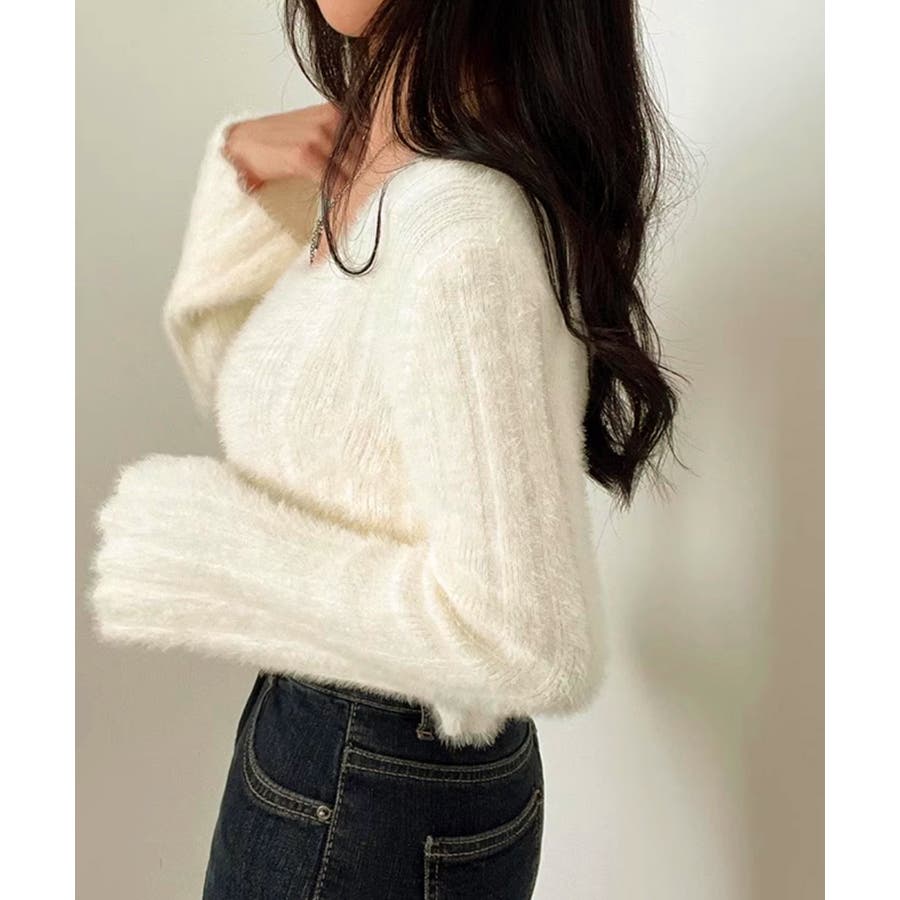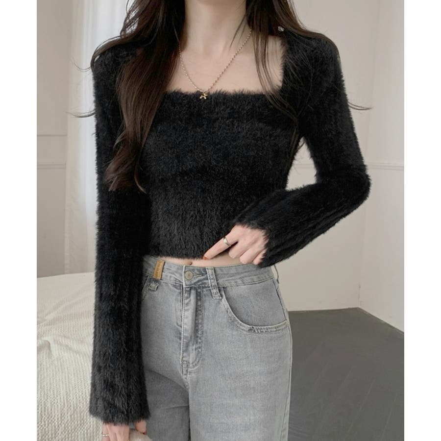 きれいめニット長袖 ショート丈トップス モヘア調ニット起毛