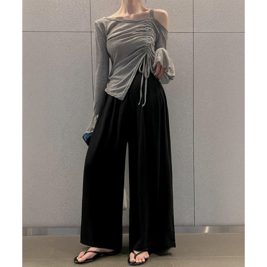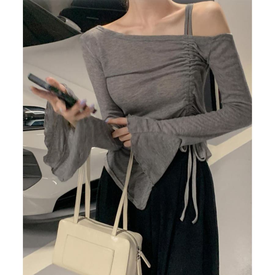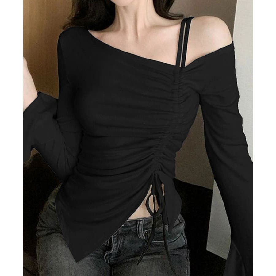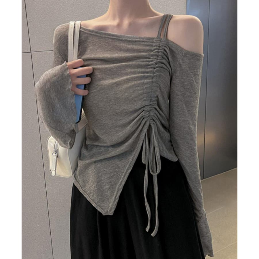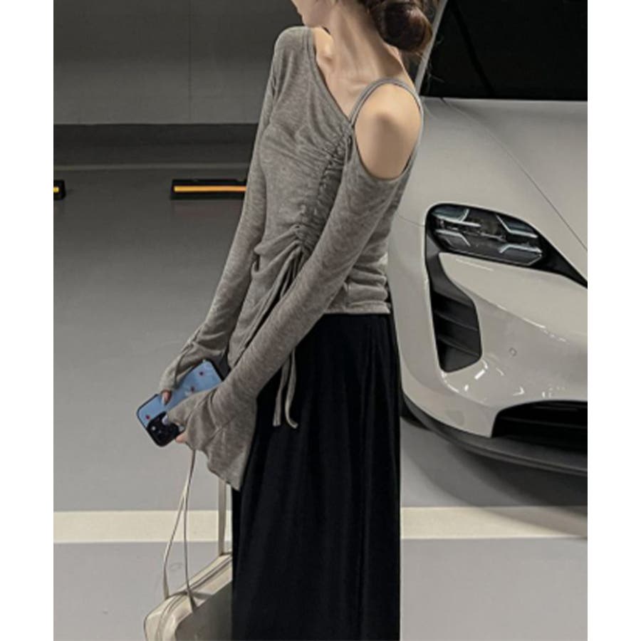 片肩のオフショルダーとドローストリングが魅力のトレンド感あふれる韓国風新作長袖Tシャツ。