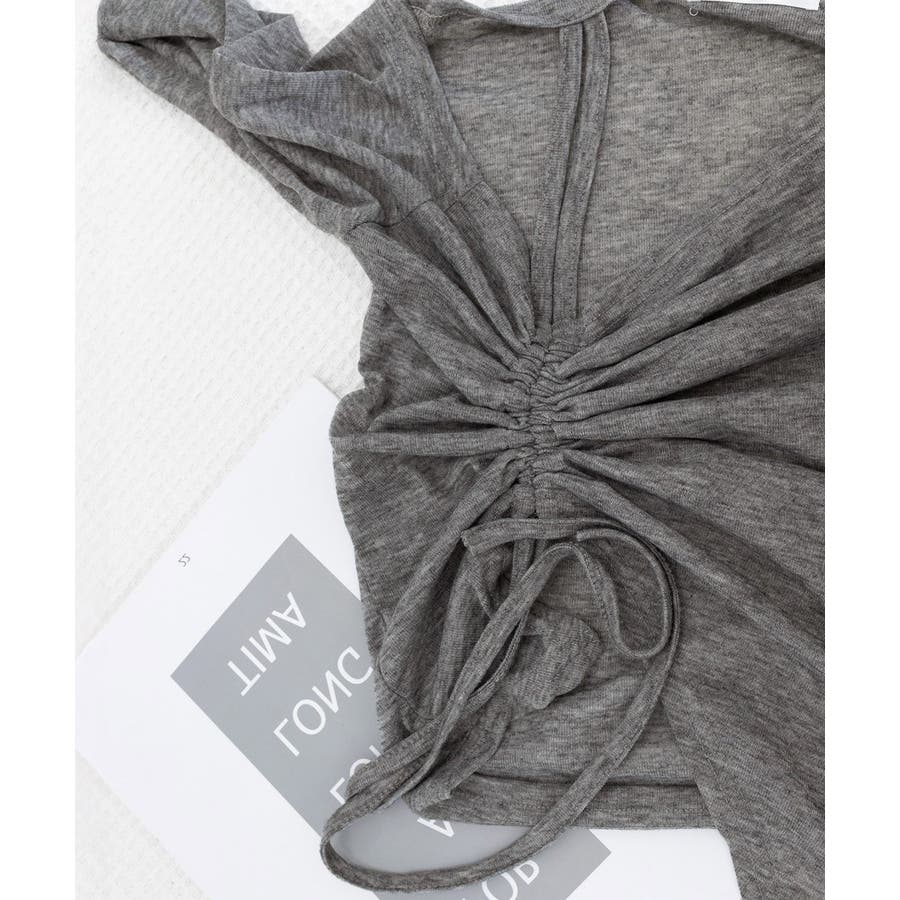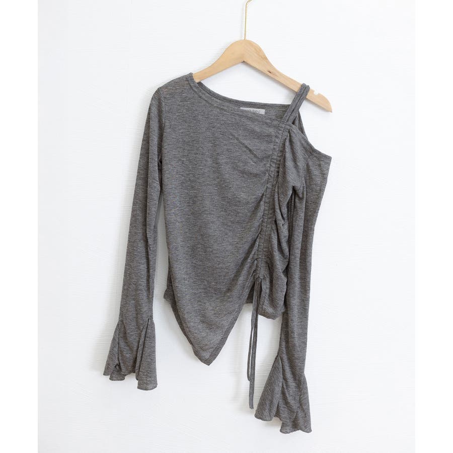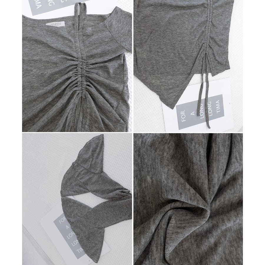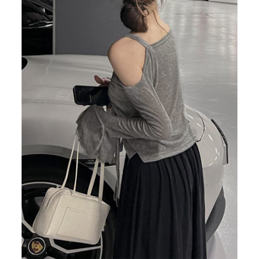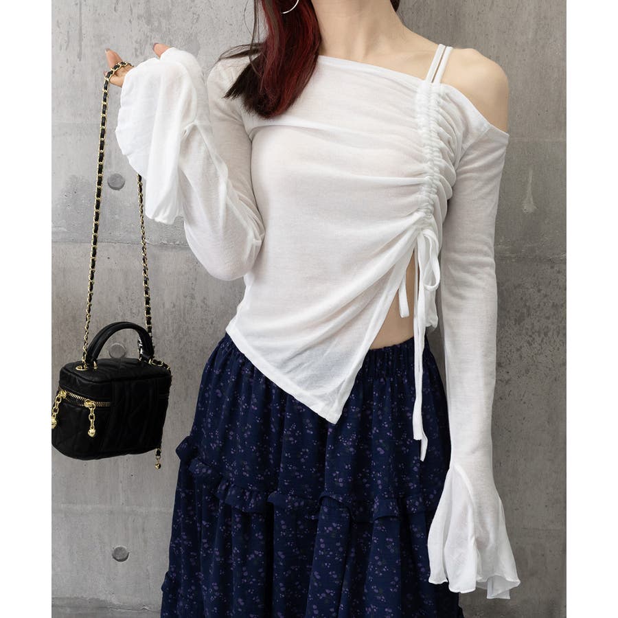片肩のオフショルダーとドローストリングが魅力のトレンド感あふれる韓国風新作長袖Tシャツ。