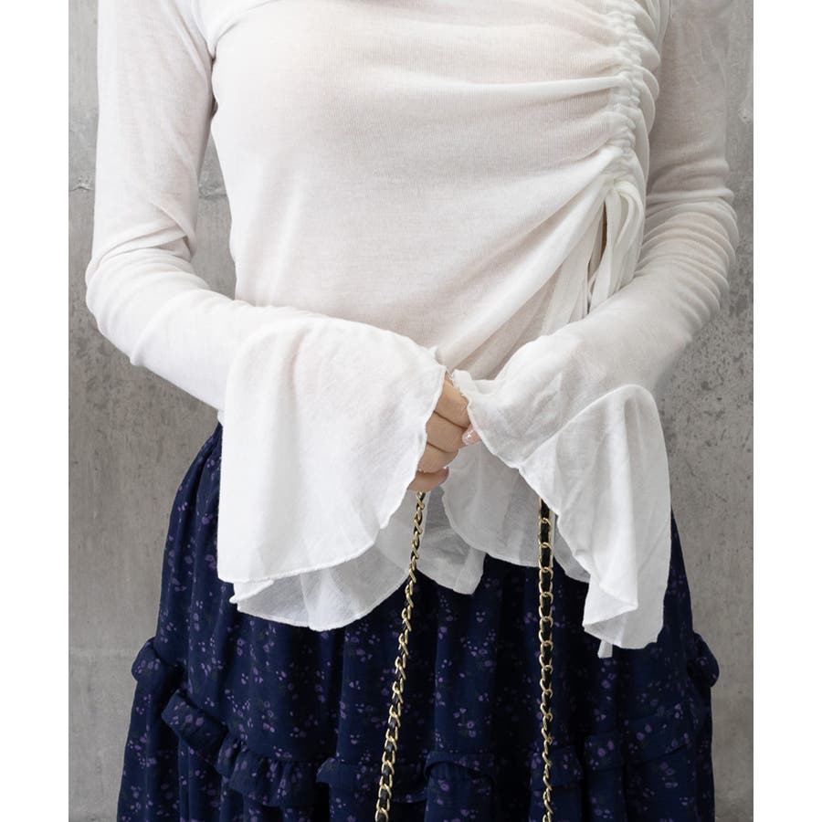 袖口のフレアスリーブが華やかな印象を添え、手元まで女性らしさを演出する一枚。