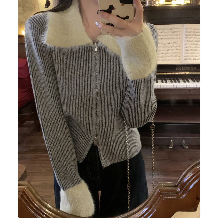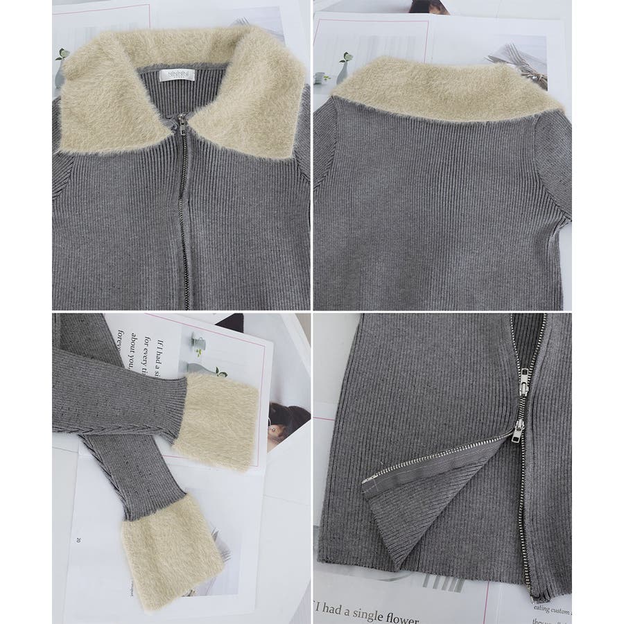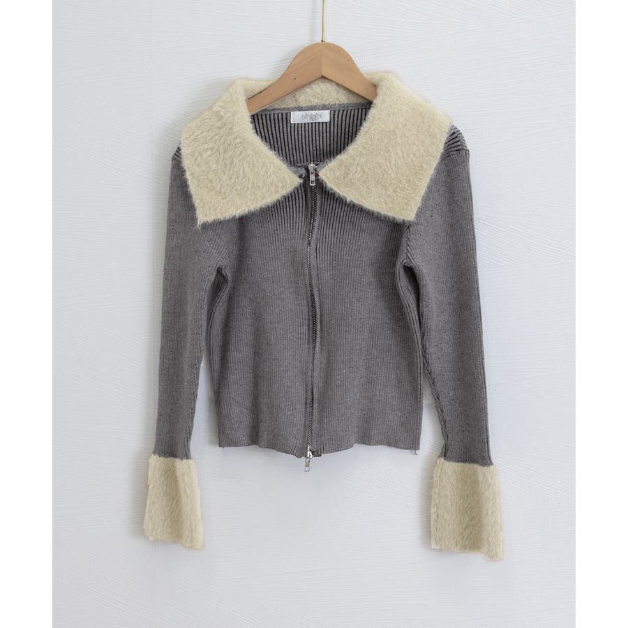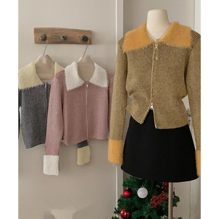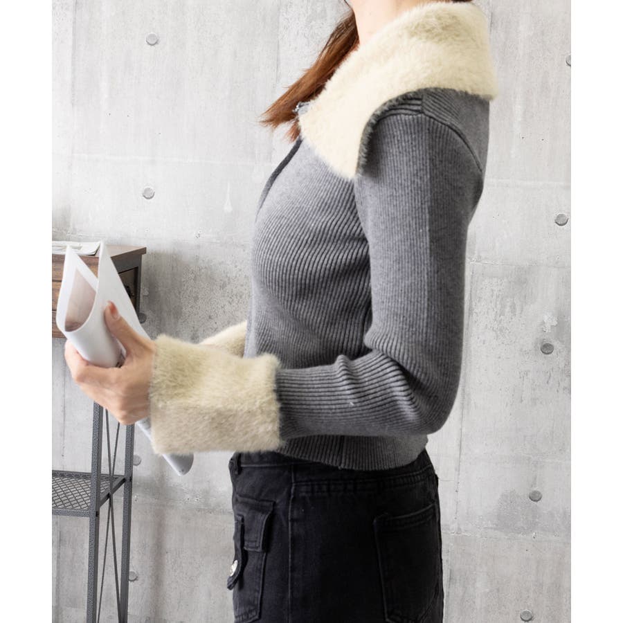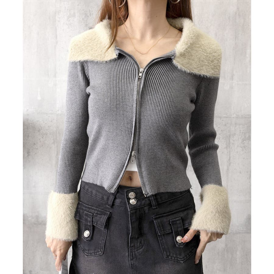 上品なフェイクファーをあしらったダブルジップアップ仕様のニットカーディガン。
