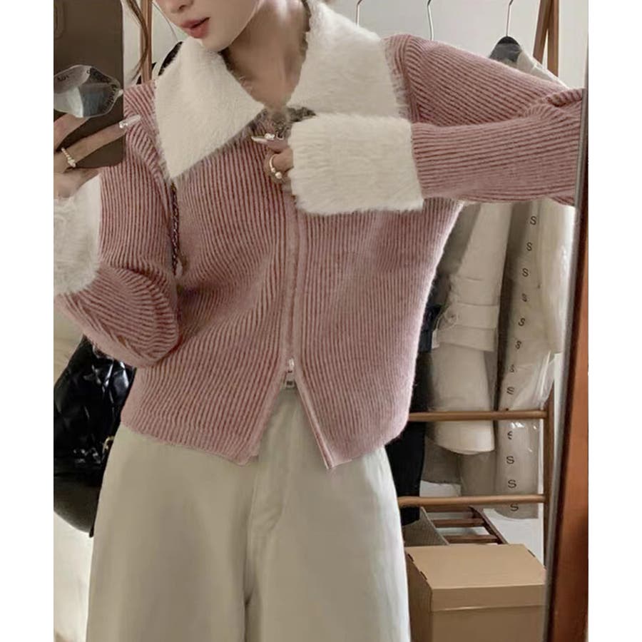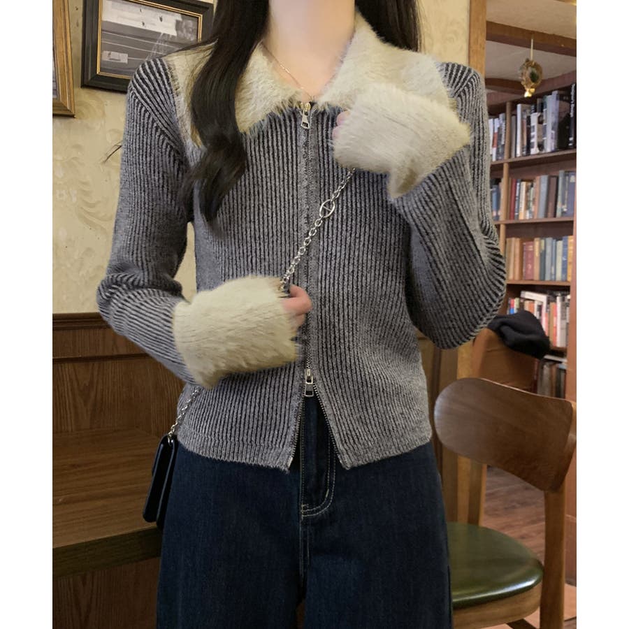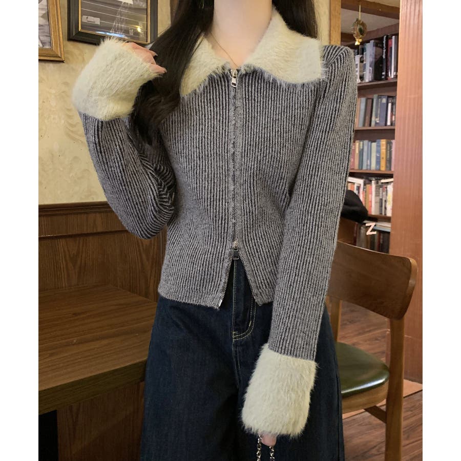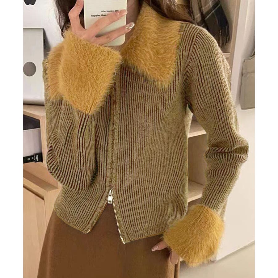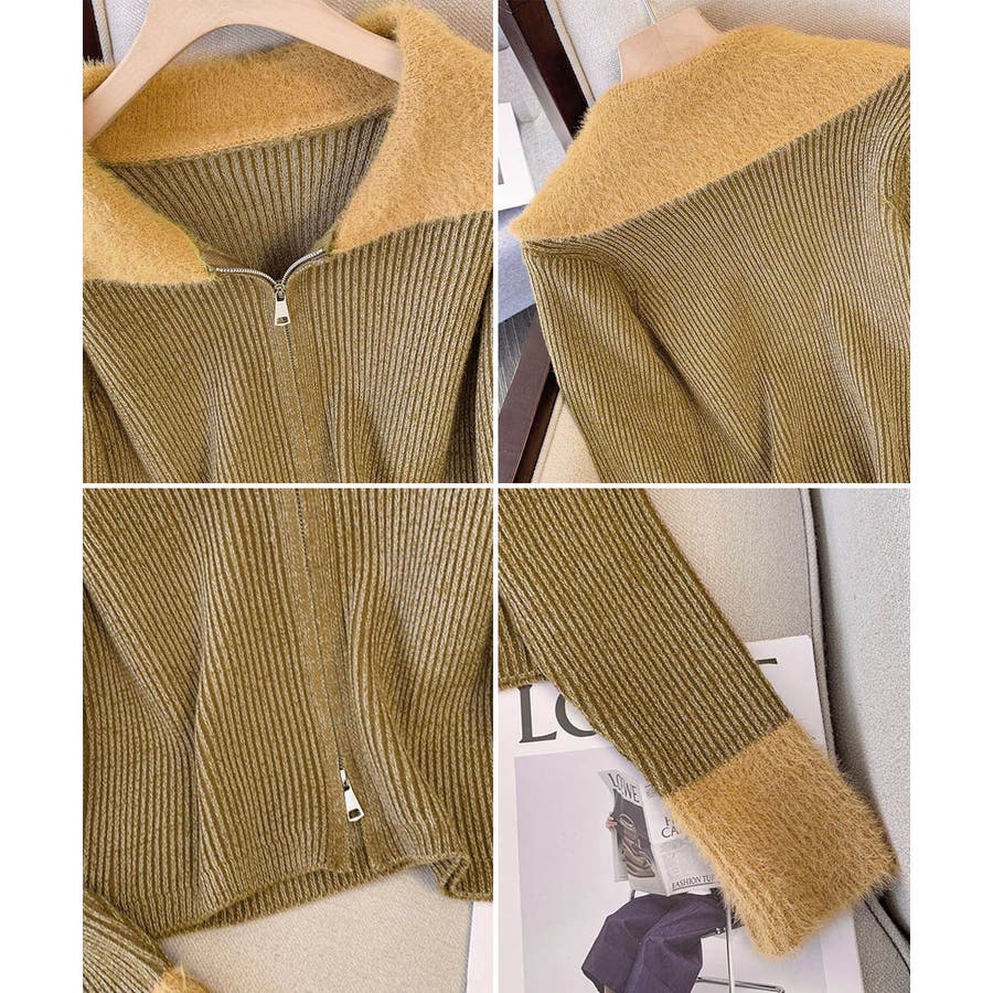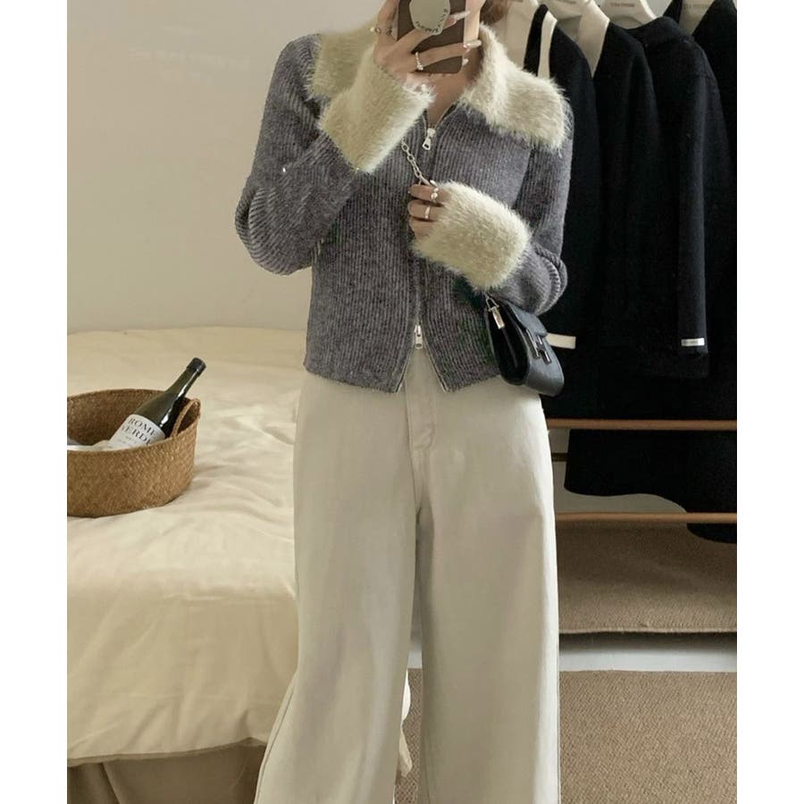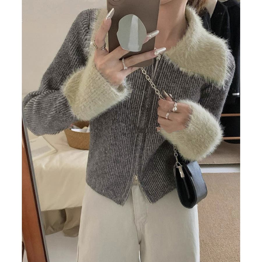 上品なフェイクファーをあしらったダブルジップアップ仕様のニットカーディガン。