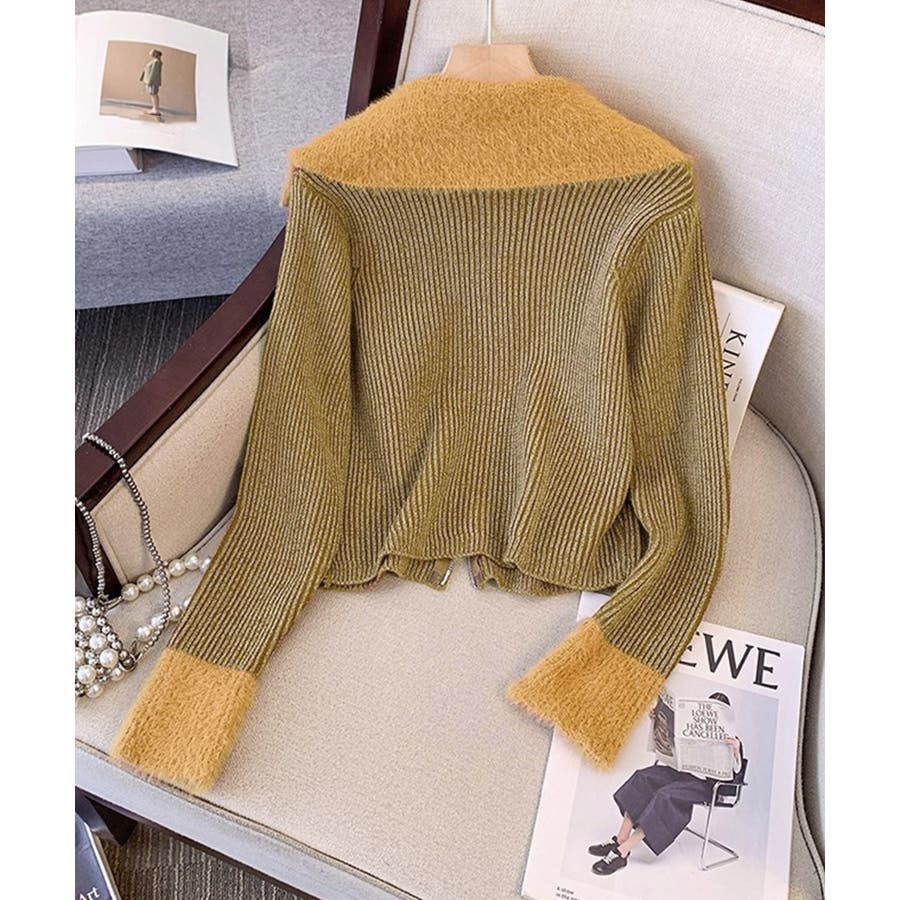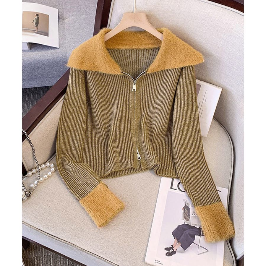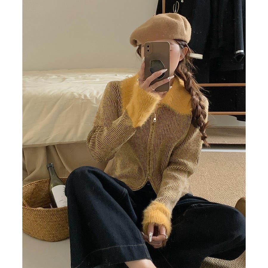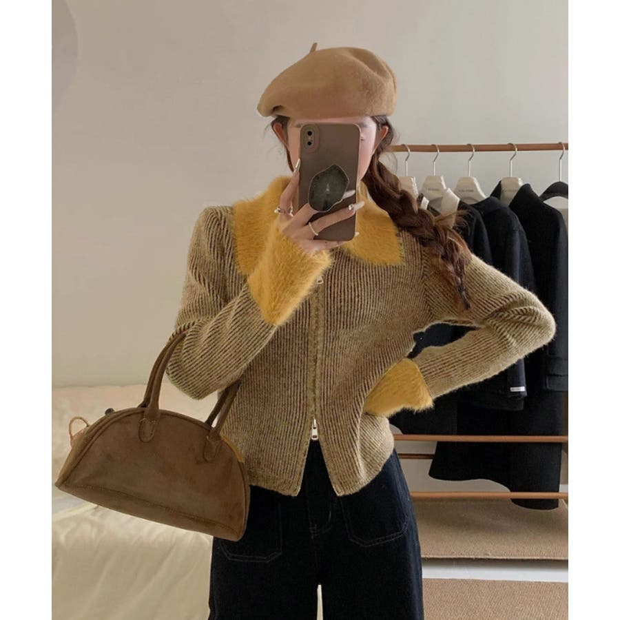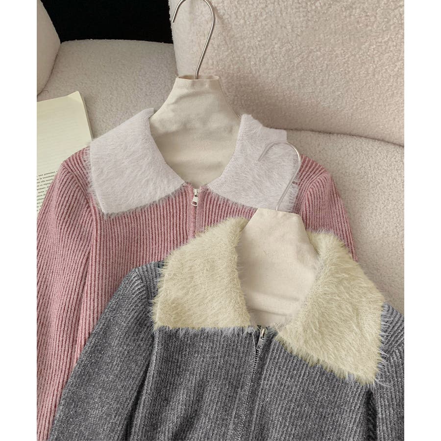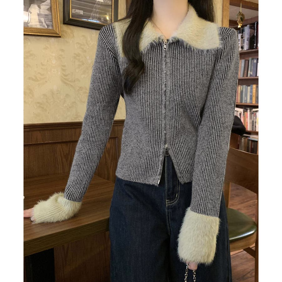 上品なフェイクファーをあしらったダブルジップアップ仕様のニットカーディガン。