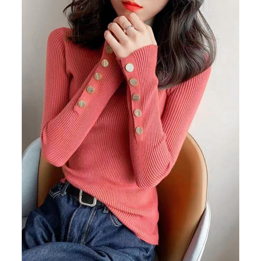 細身トップス着やせ ゴールドボタン長袖 韓国風ニット 無地