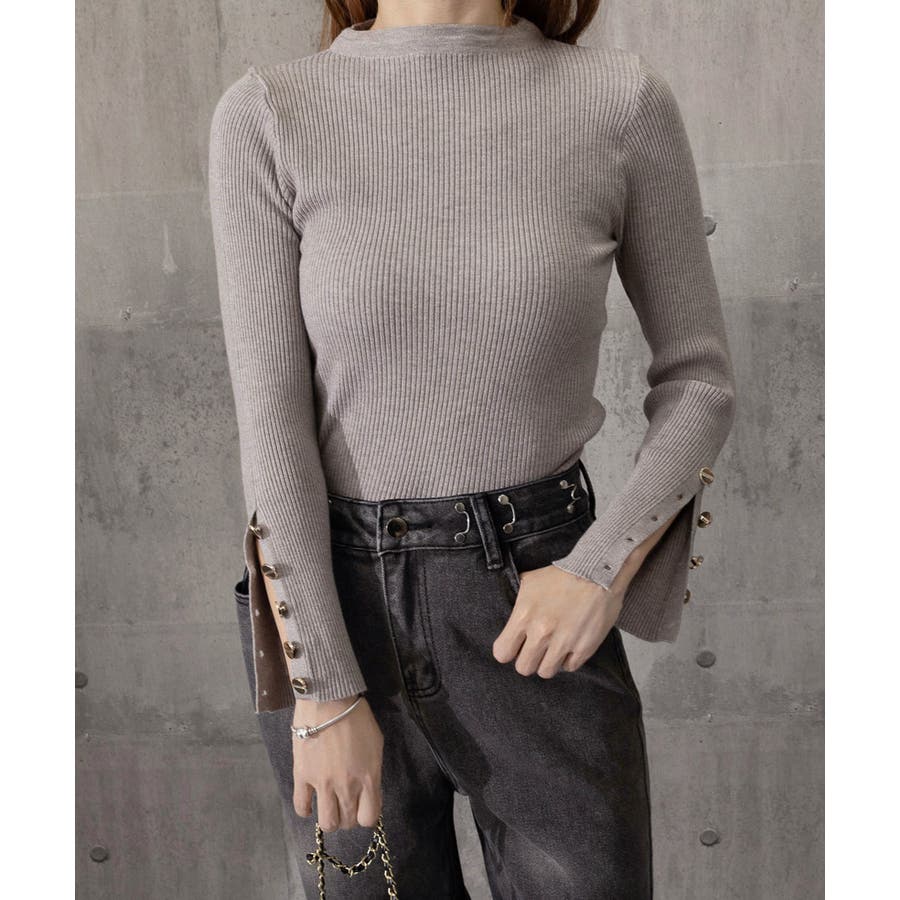 袖口に開閉可能なゴールドボタンがあしらわれた、リブ編みのニットトップス。