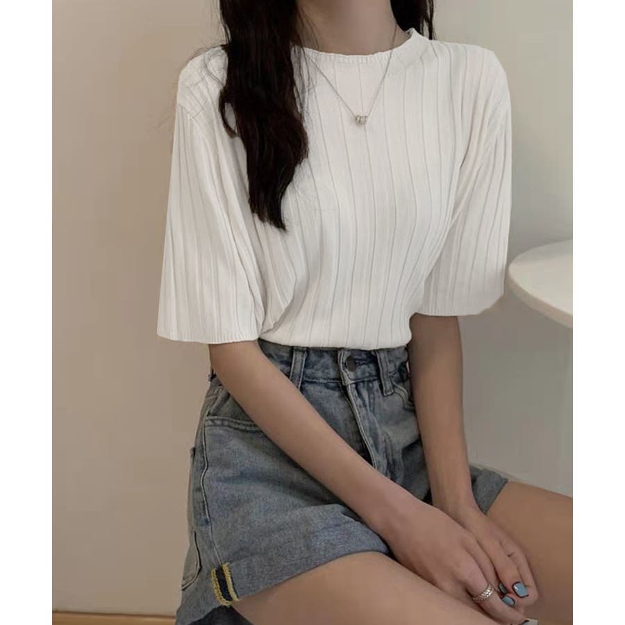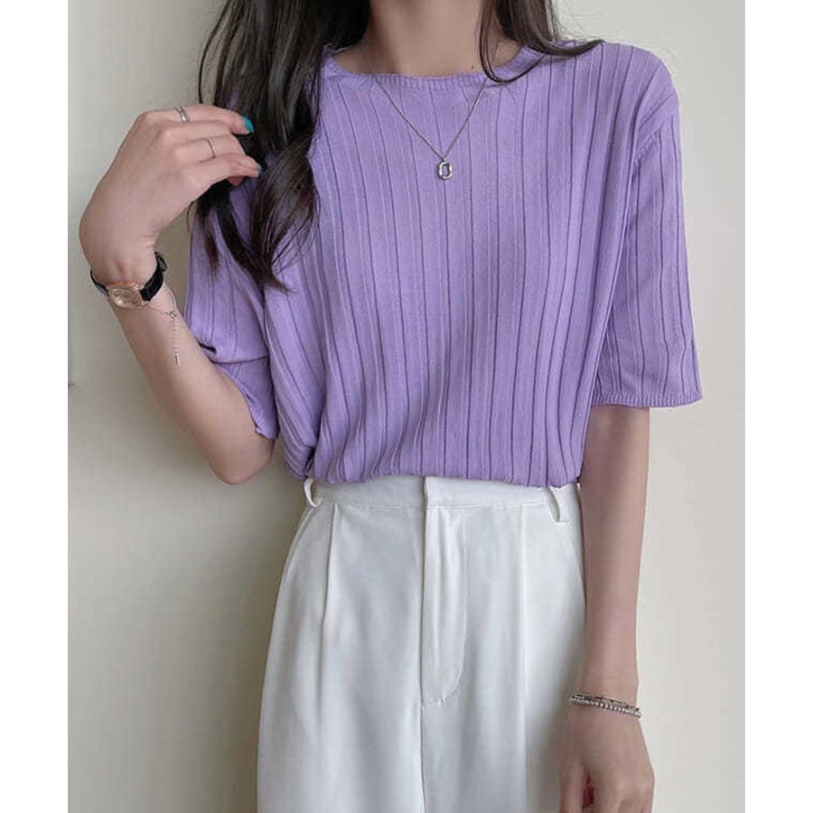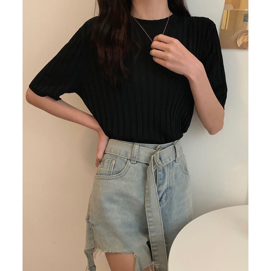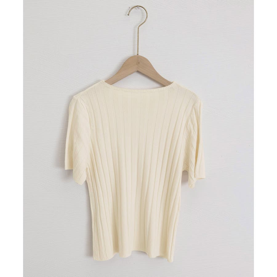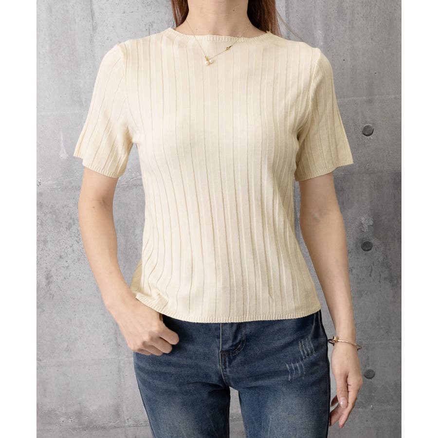 太めのリブデザインが上品な印象を与える半袖サマーニットトップス。