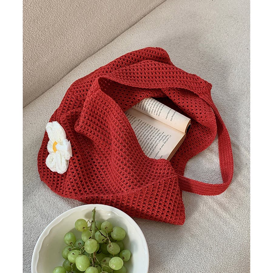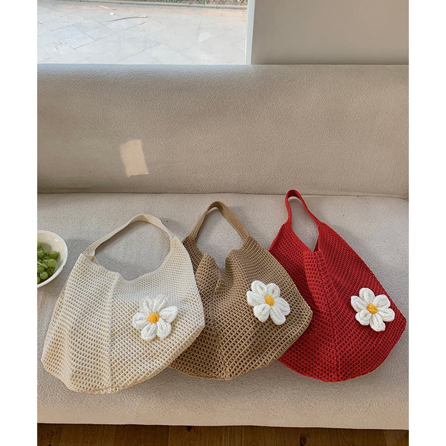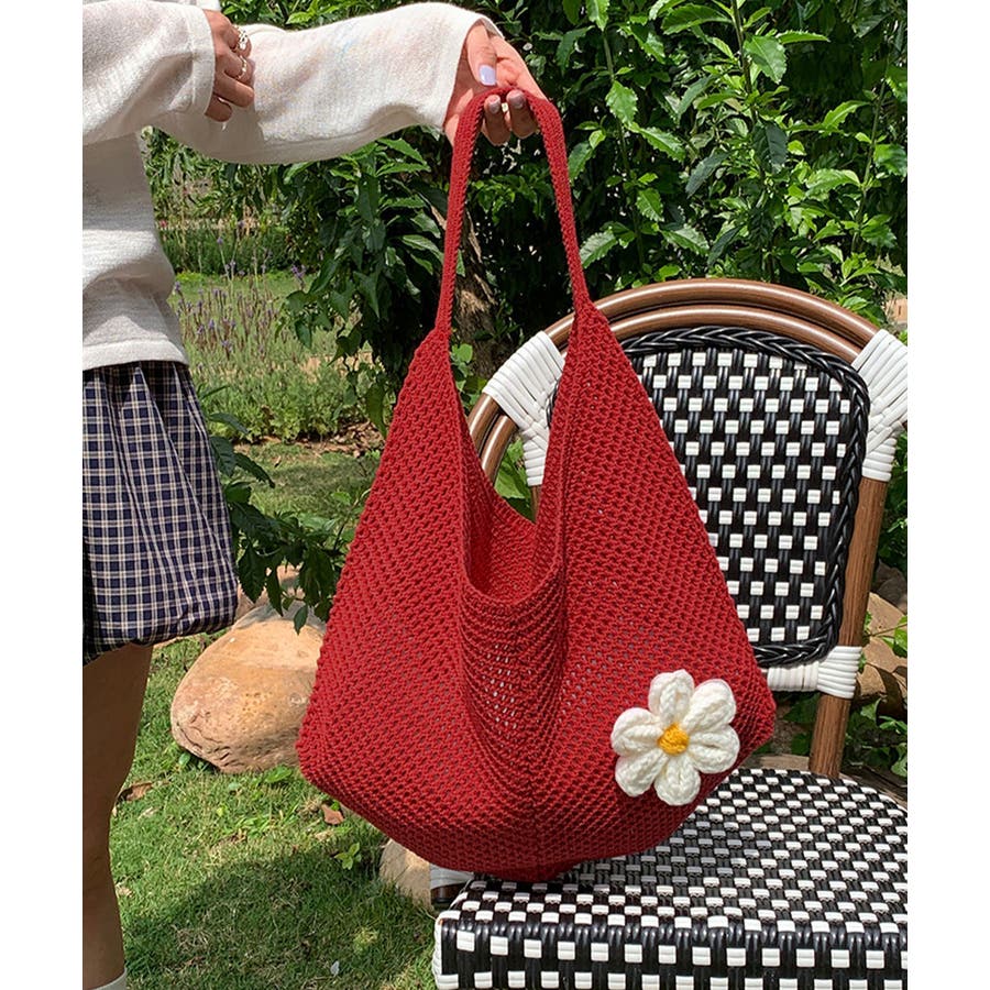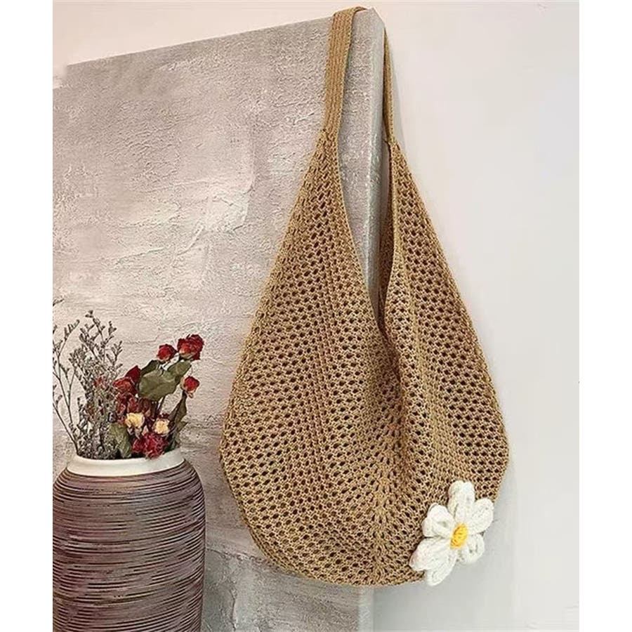 トートバッグ花モチーフ付き編みバッグ軽量