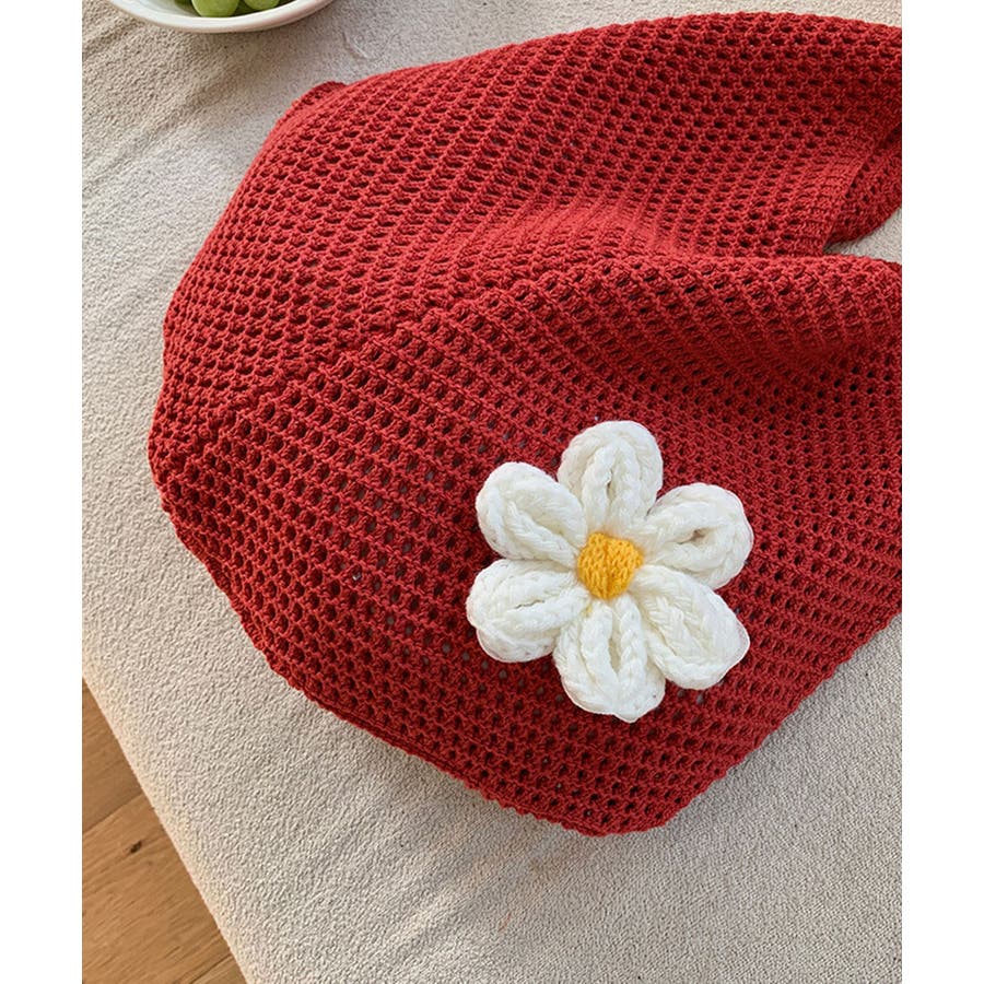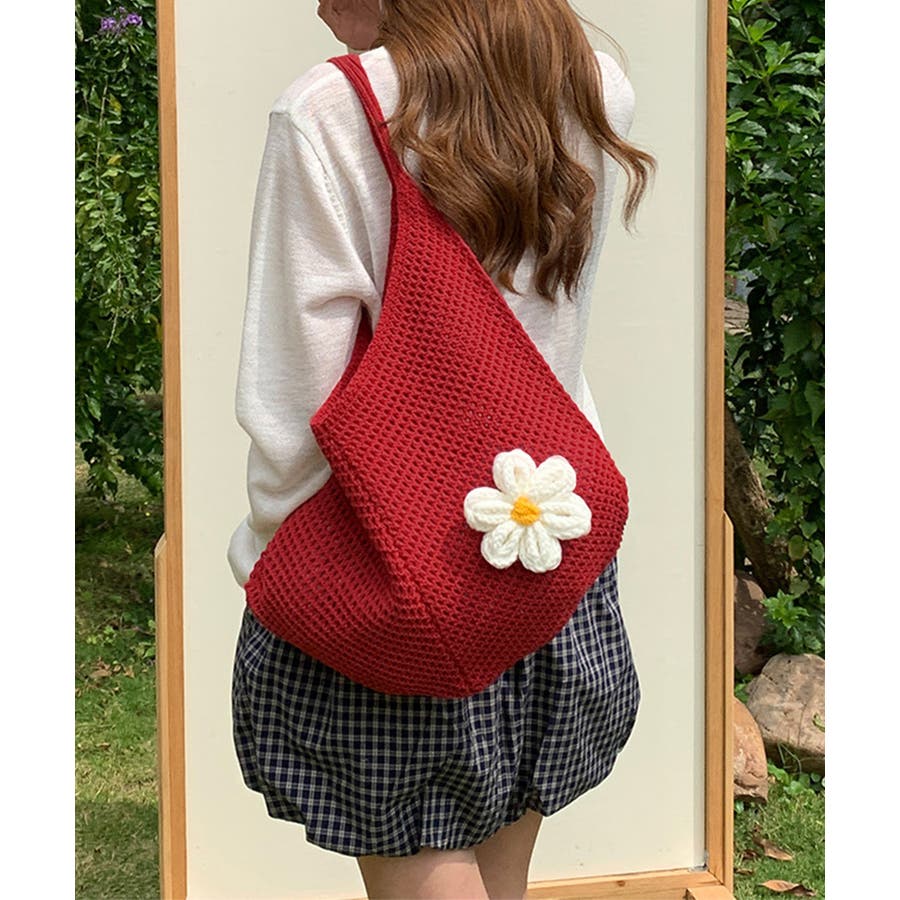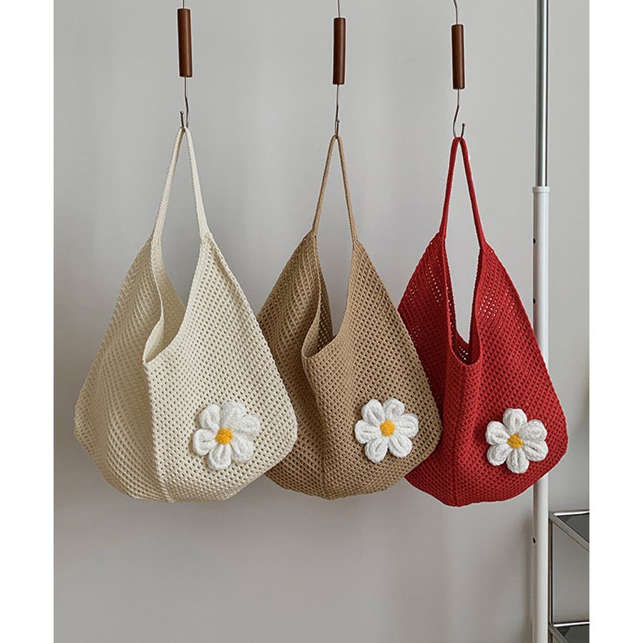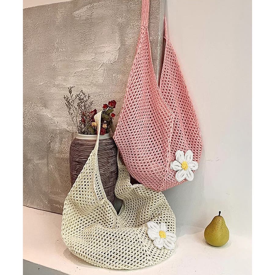 トートバッグ花モチーフ付き編みバッグ軽量