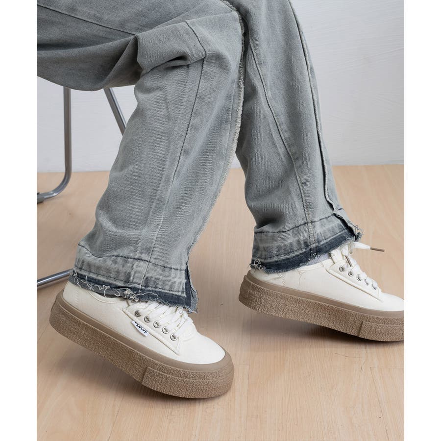 フロントの縦ラインのカットオフデザインが、脚を長く細く見せるシルエットに。