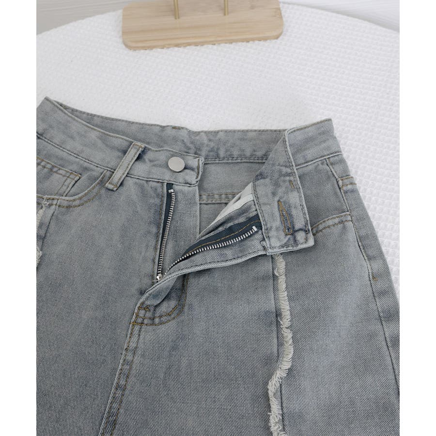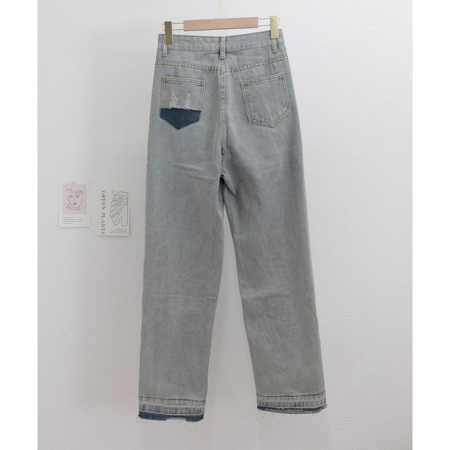 ユニークなダメージ加工が施されたストレートデニムパンツ。