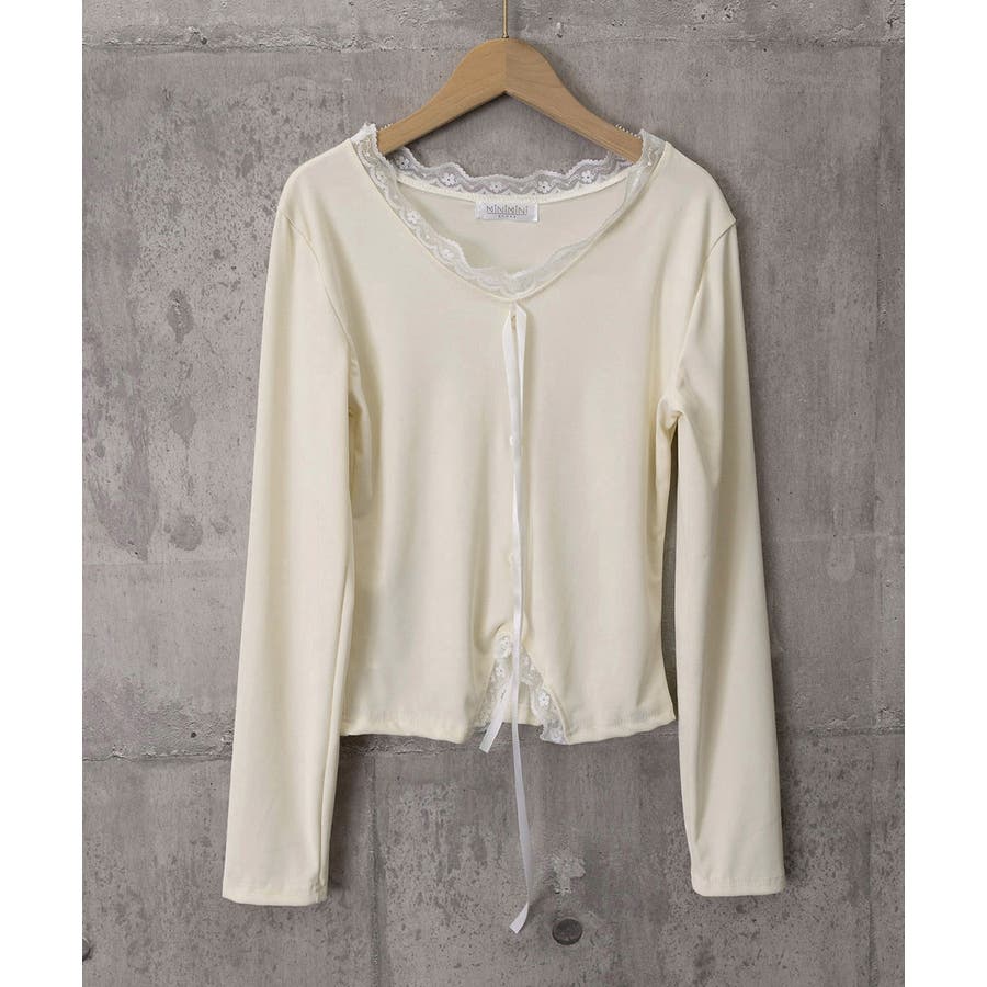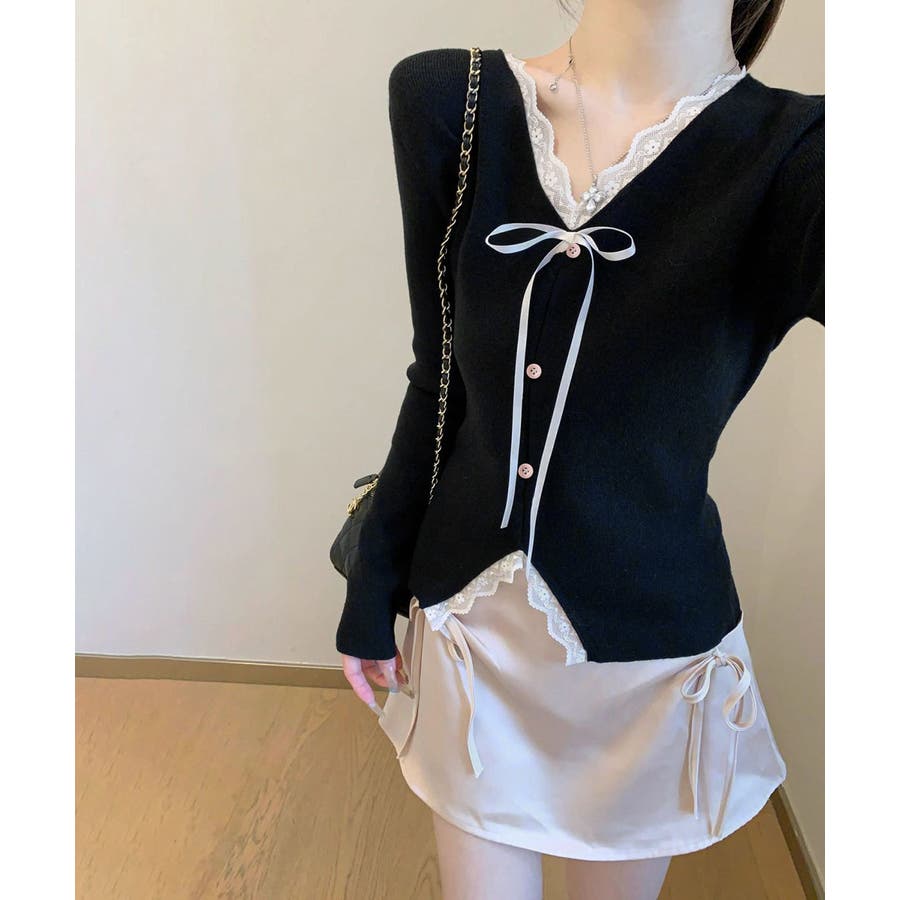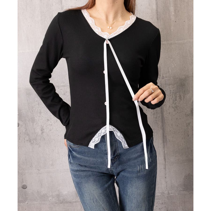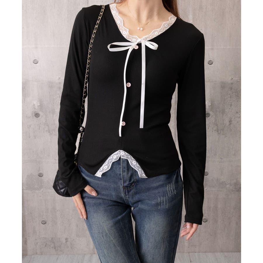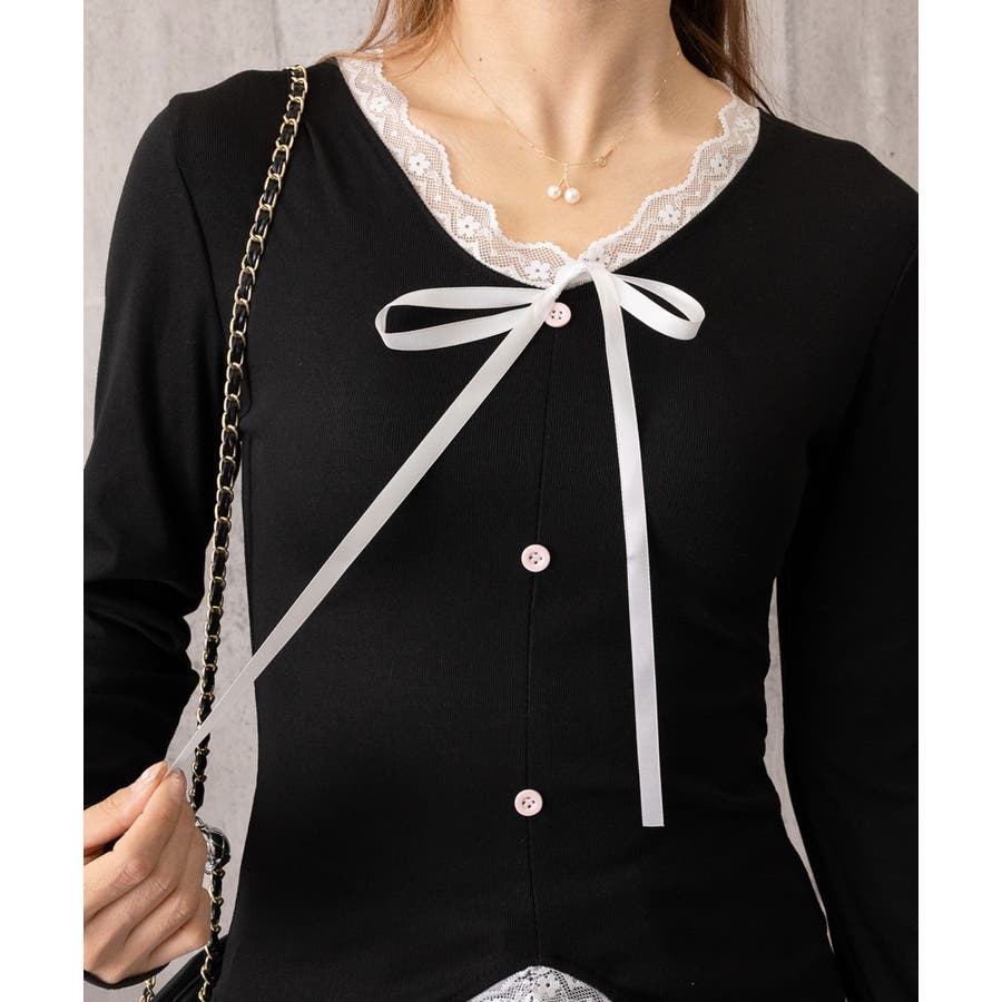 Vネックにあしらったレースとリボンが、上品な甘さをプラス。