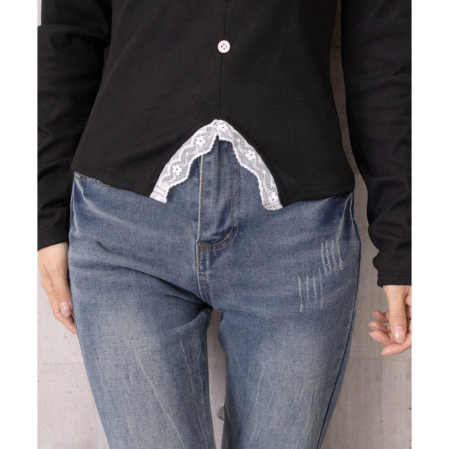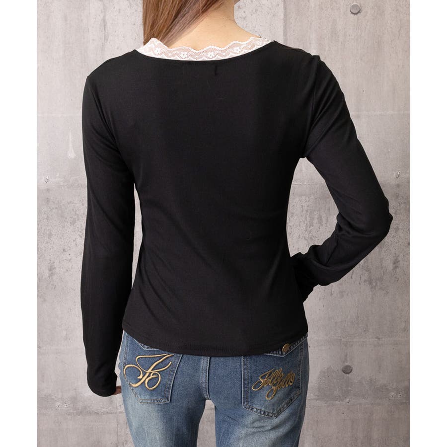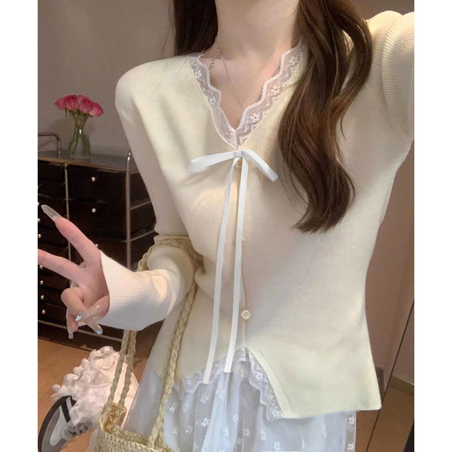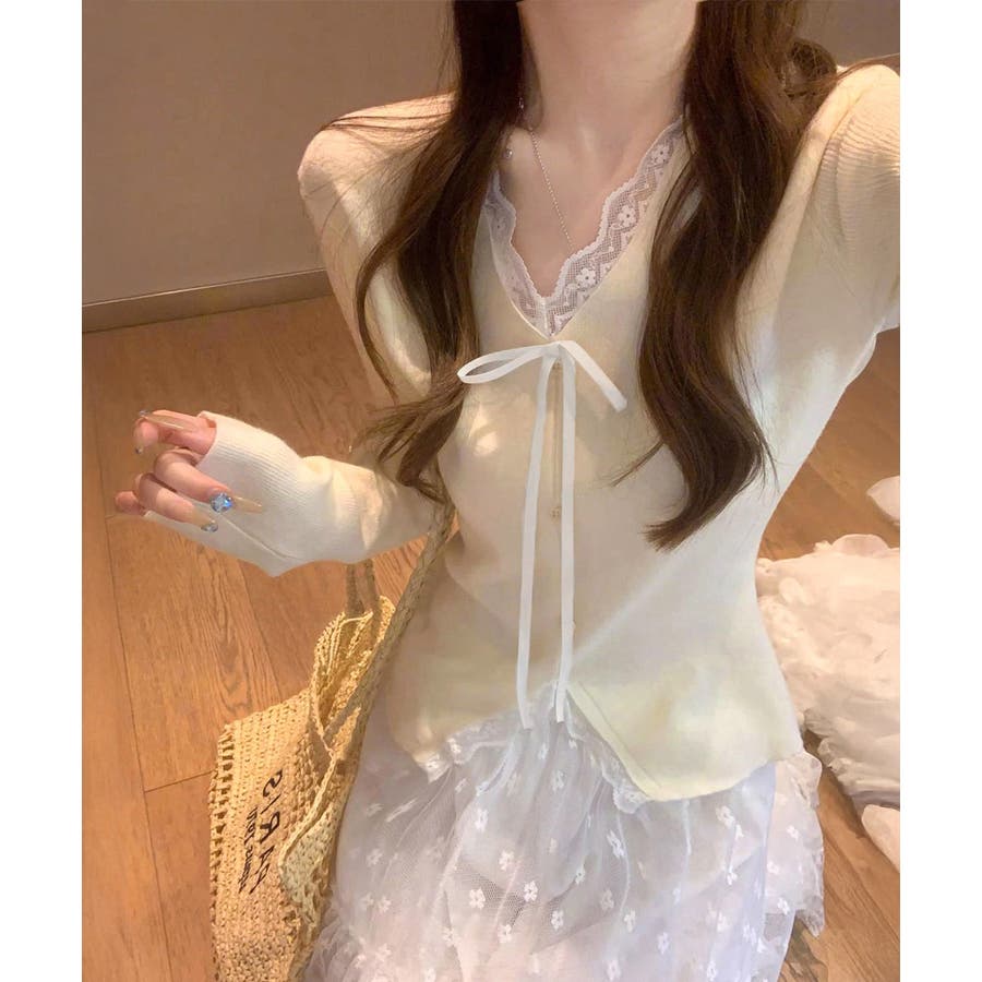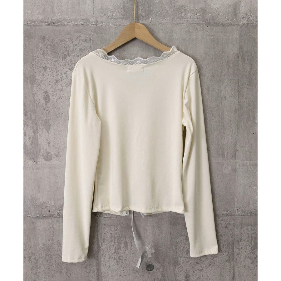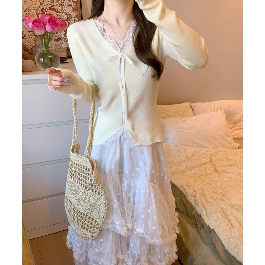 Vネックにあしらったレースとリボンが、上品な甘さをプラス。