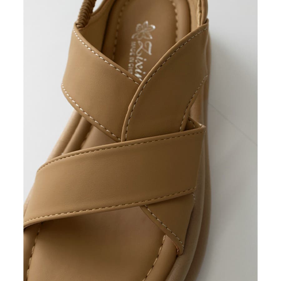 クロスしたアッパーデザイン、側面のストラップはゴムになって、さっと履き脱ぎラクラク