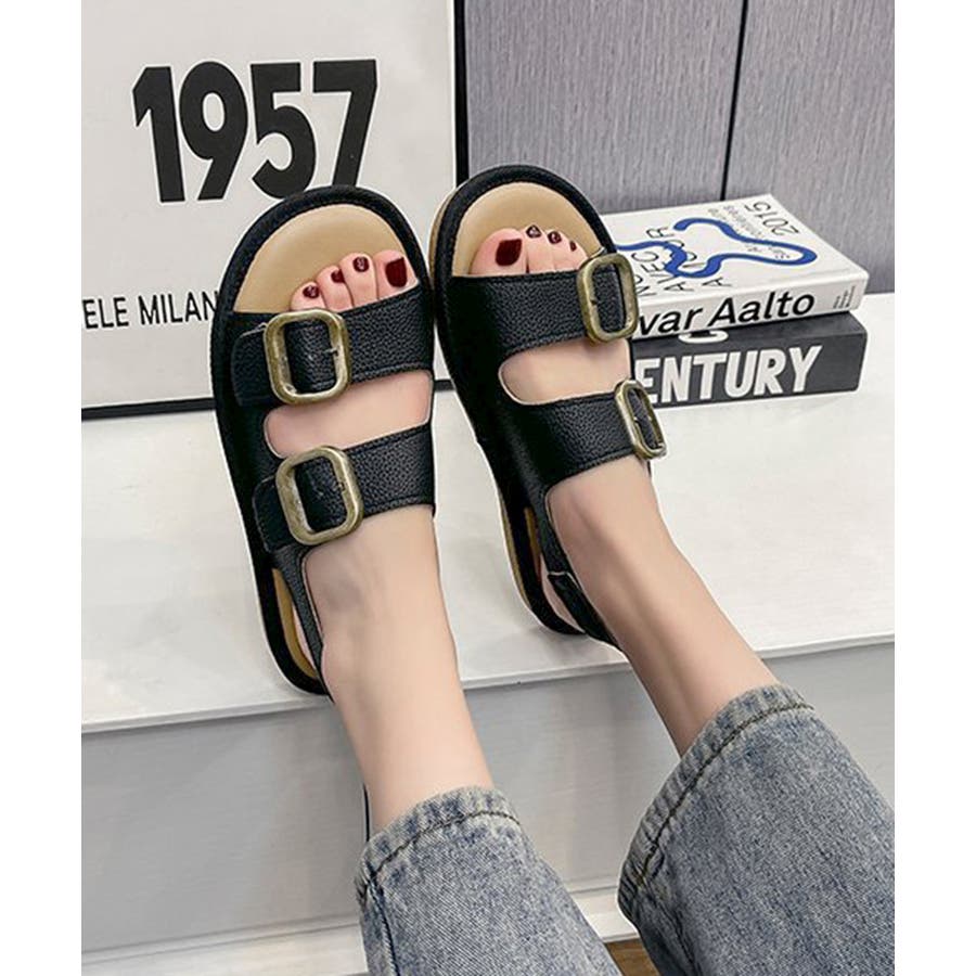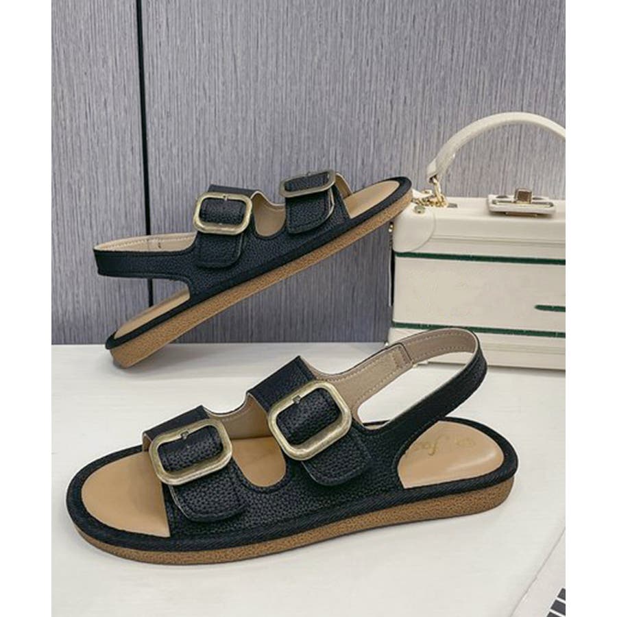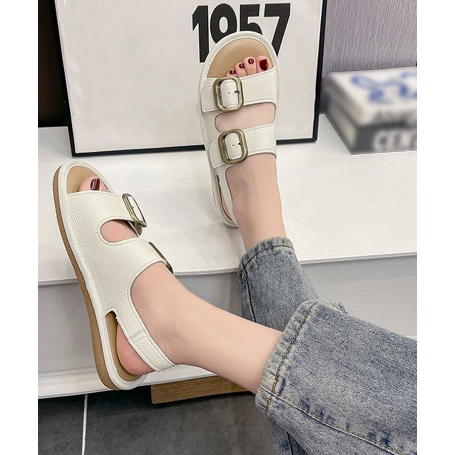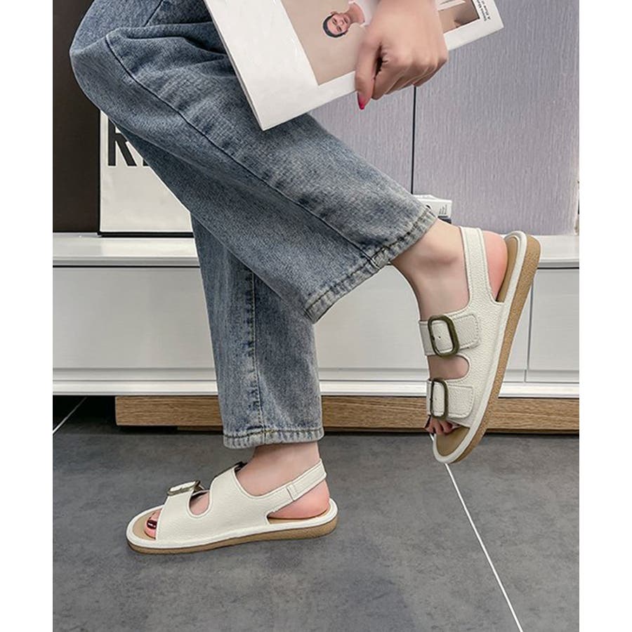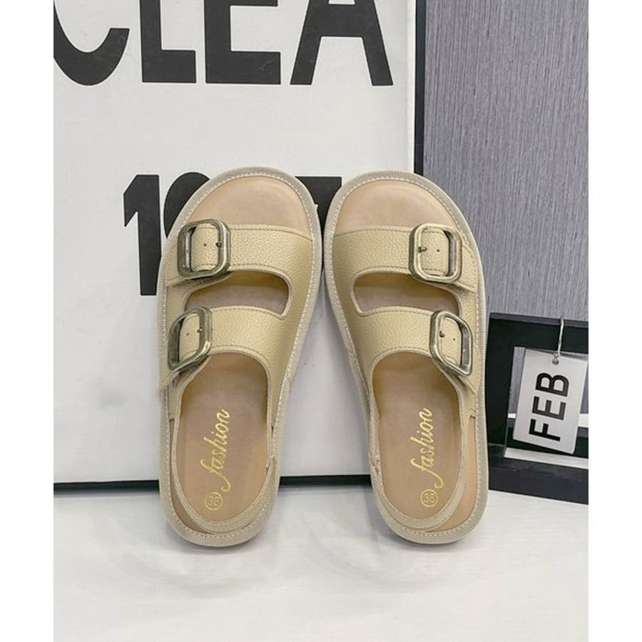 大きめのバックルがアクセントになった、トレンド感溢れるダブルベルトサンダル