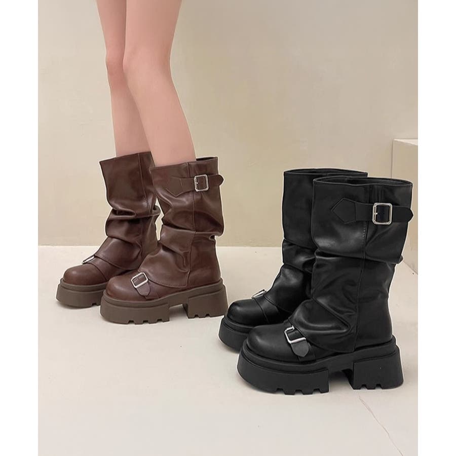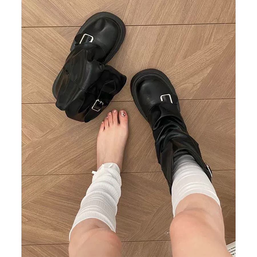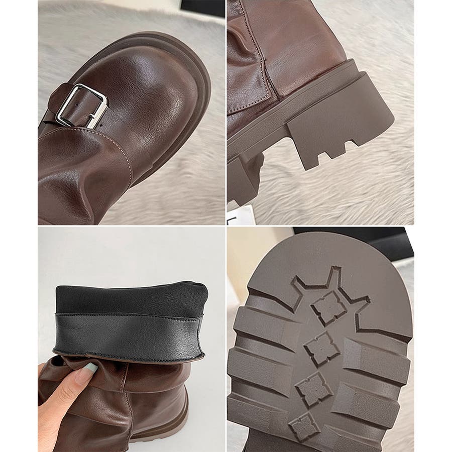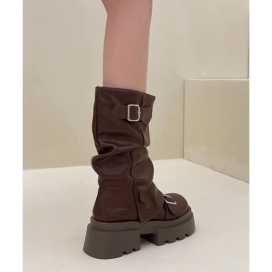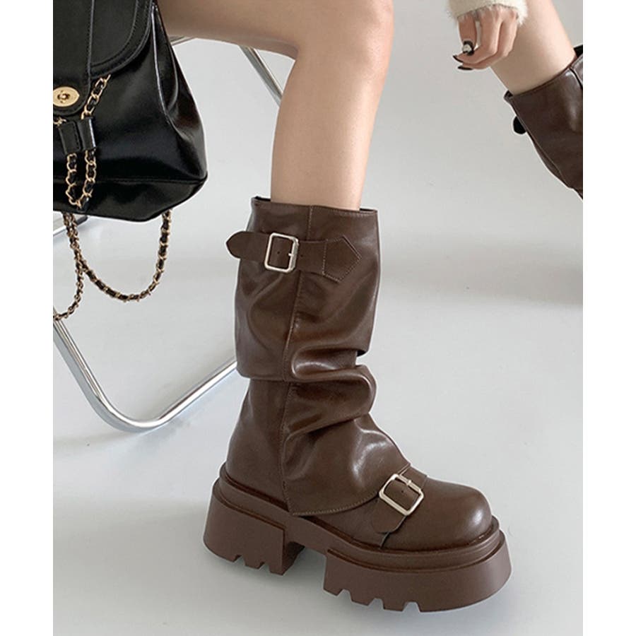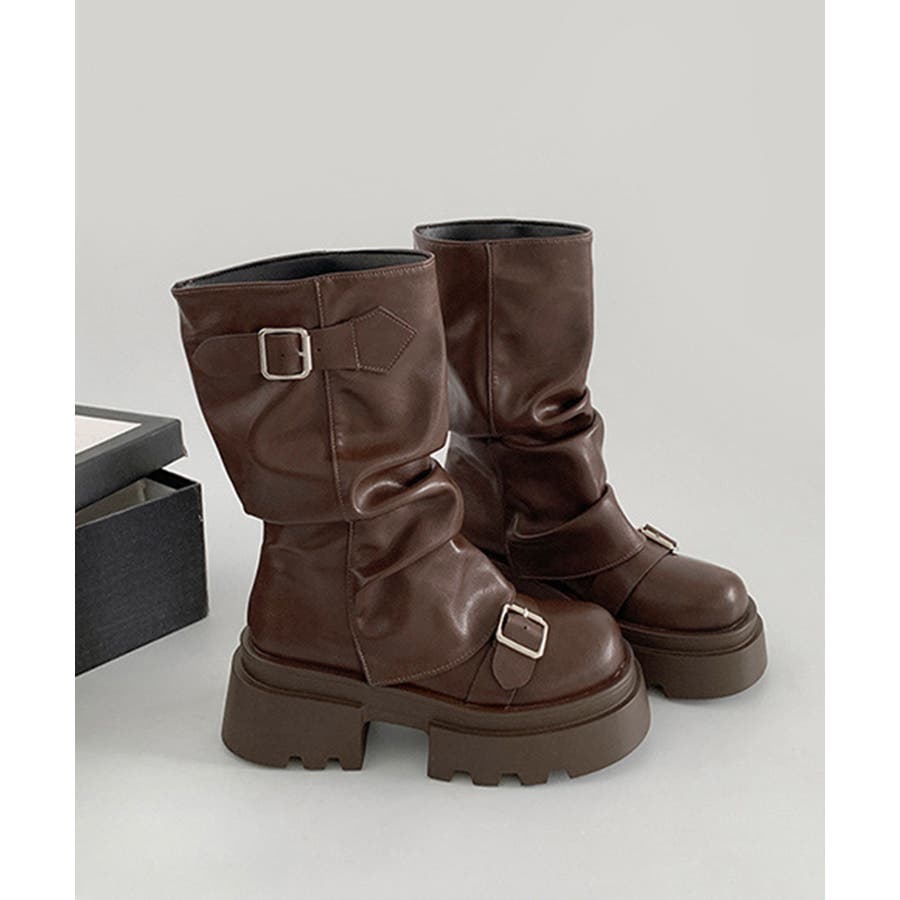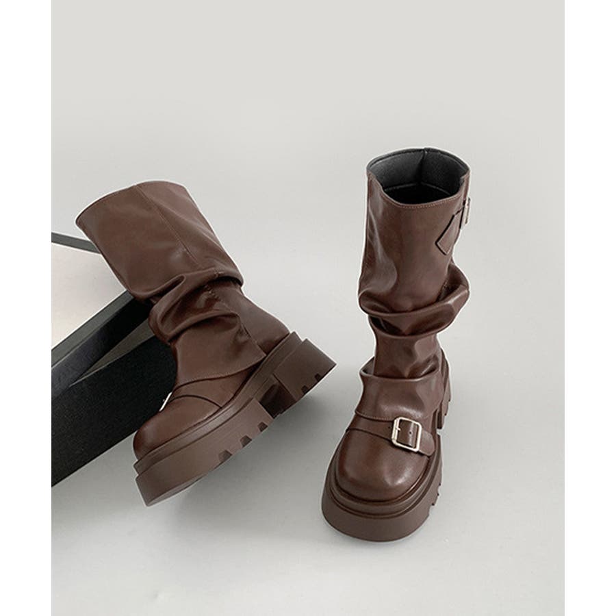 ルーズな履き口デザインがカジュアルでありながら、こなれ感のある印象を演出するベルト付き厚底カバーブーツ。