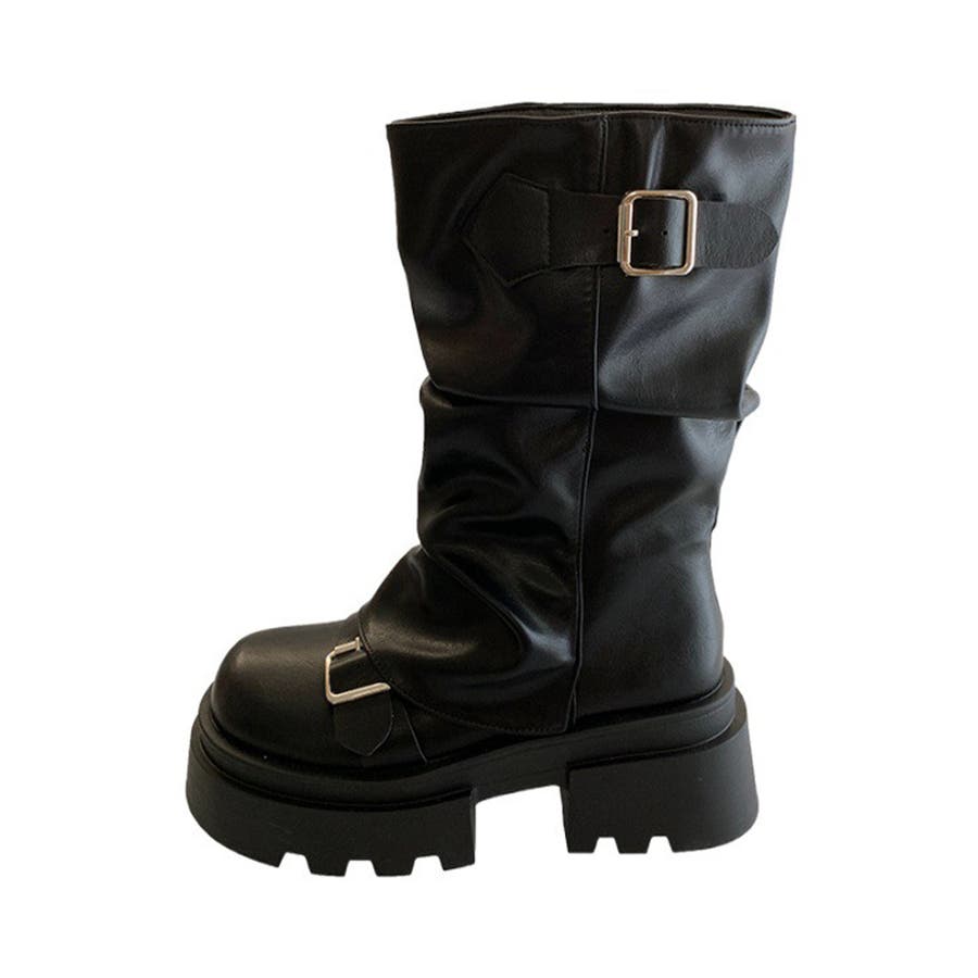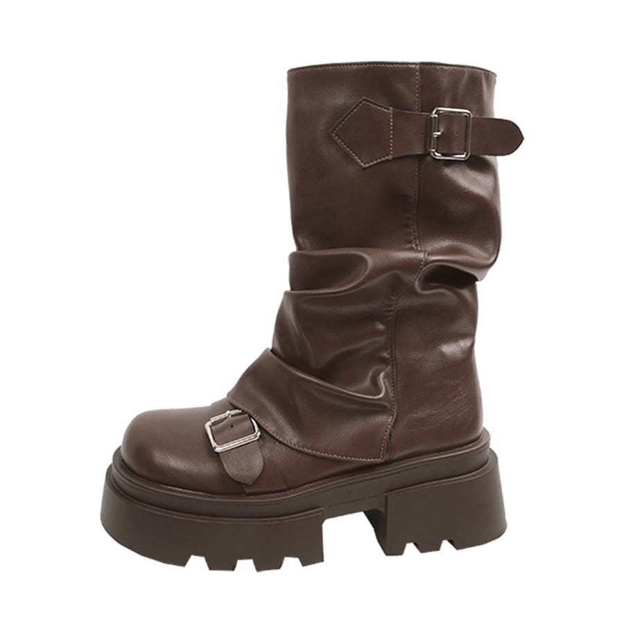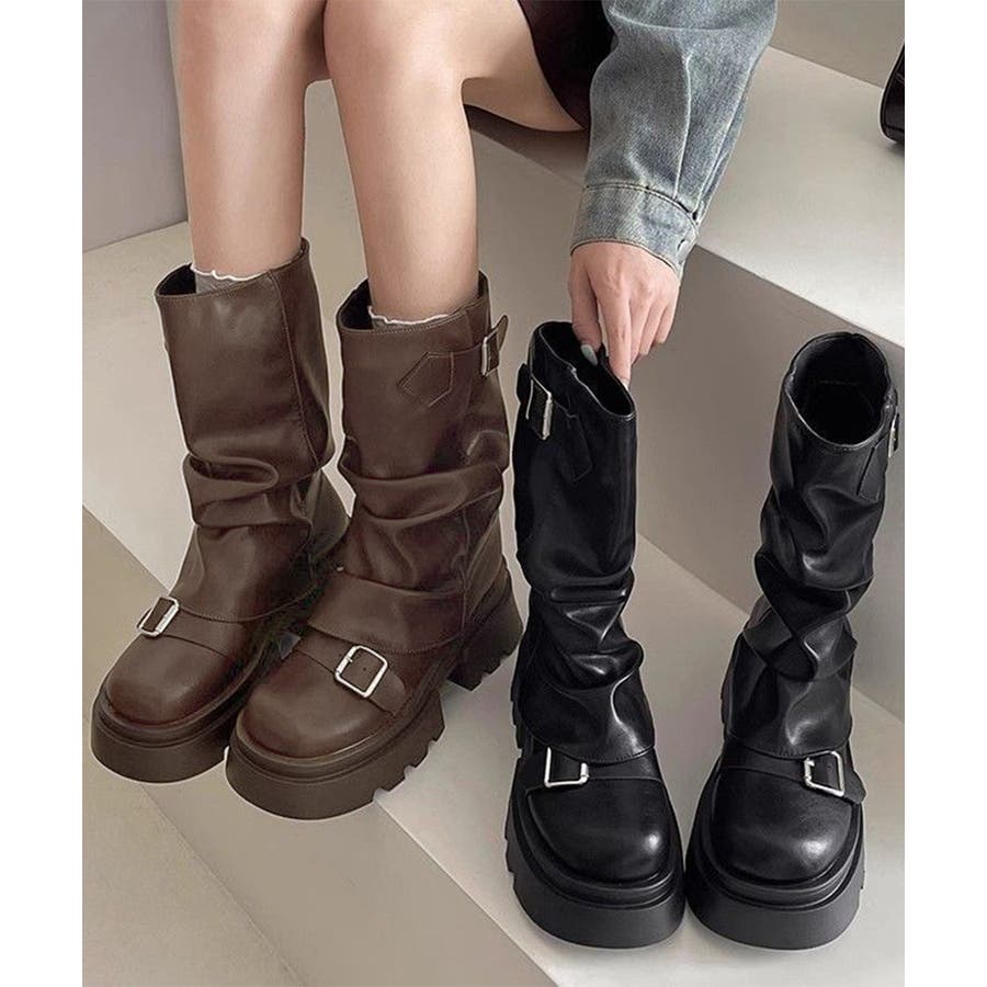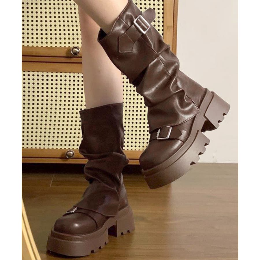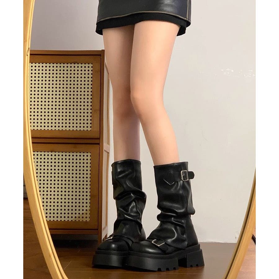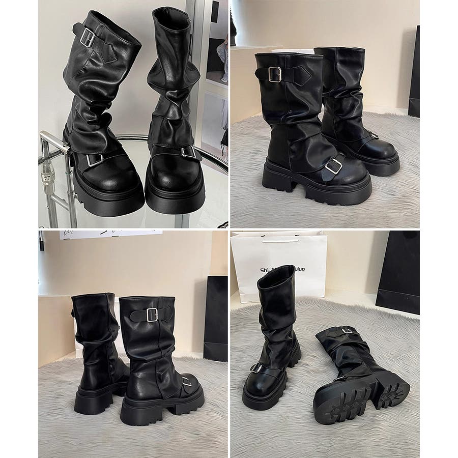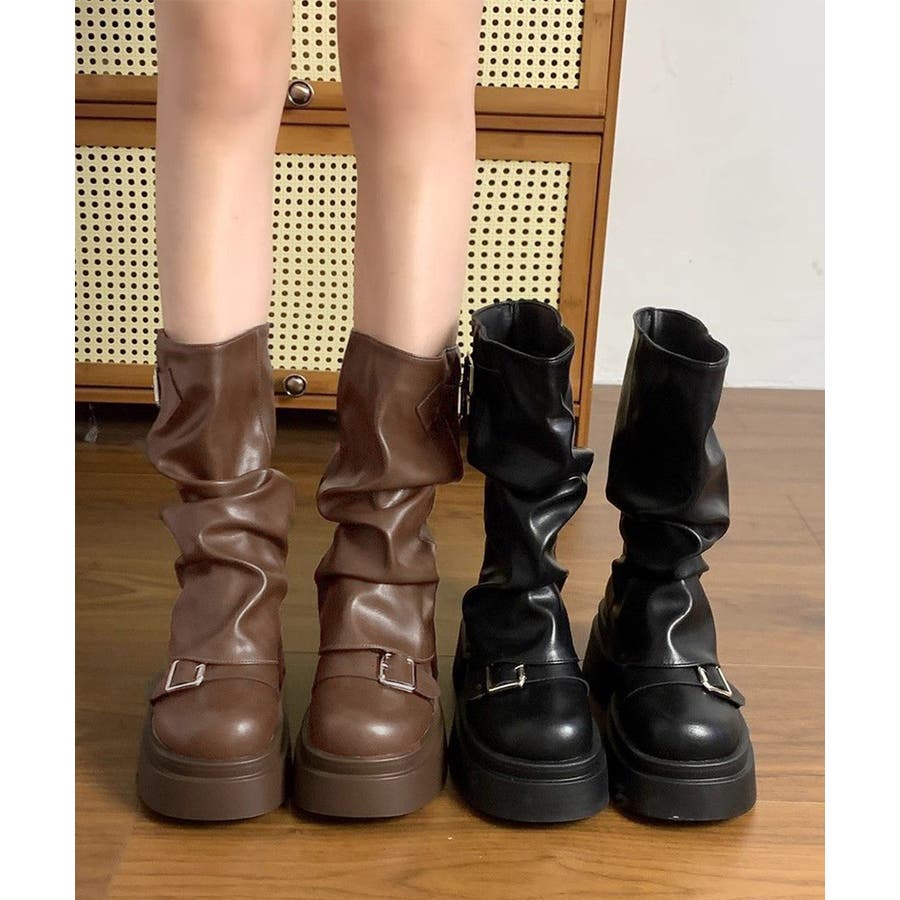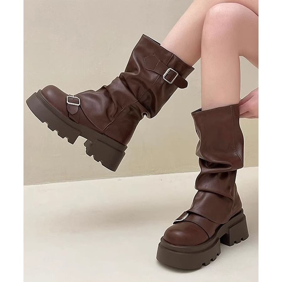 ルーズな履き口デザインがカジュアルでありながら、こなれ感のある印象を演出するベルト付き厚底カバーブーツ。