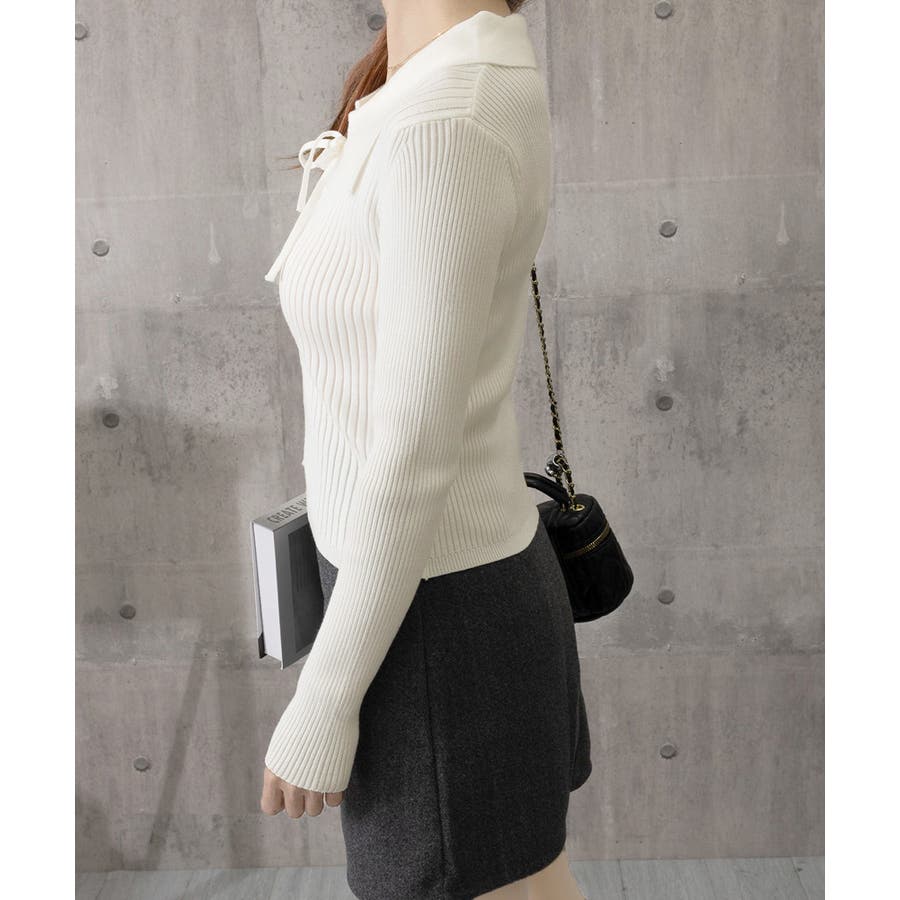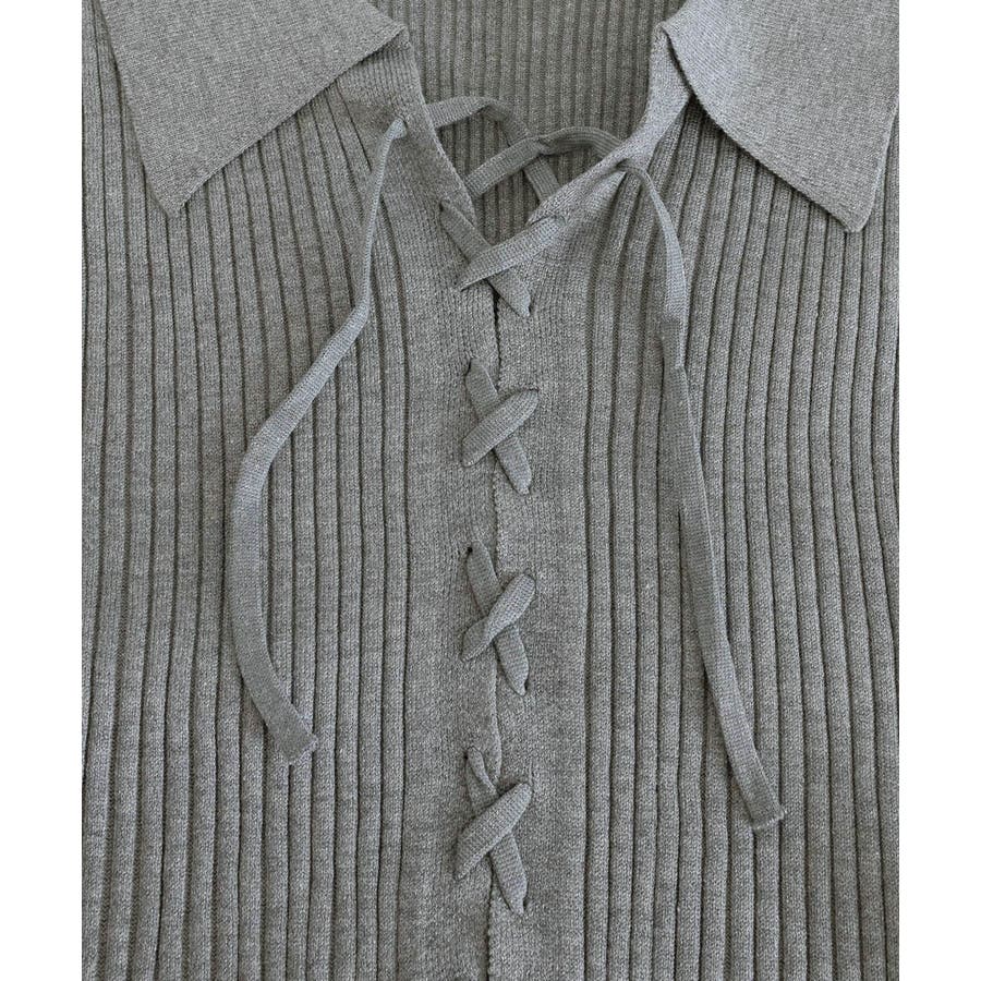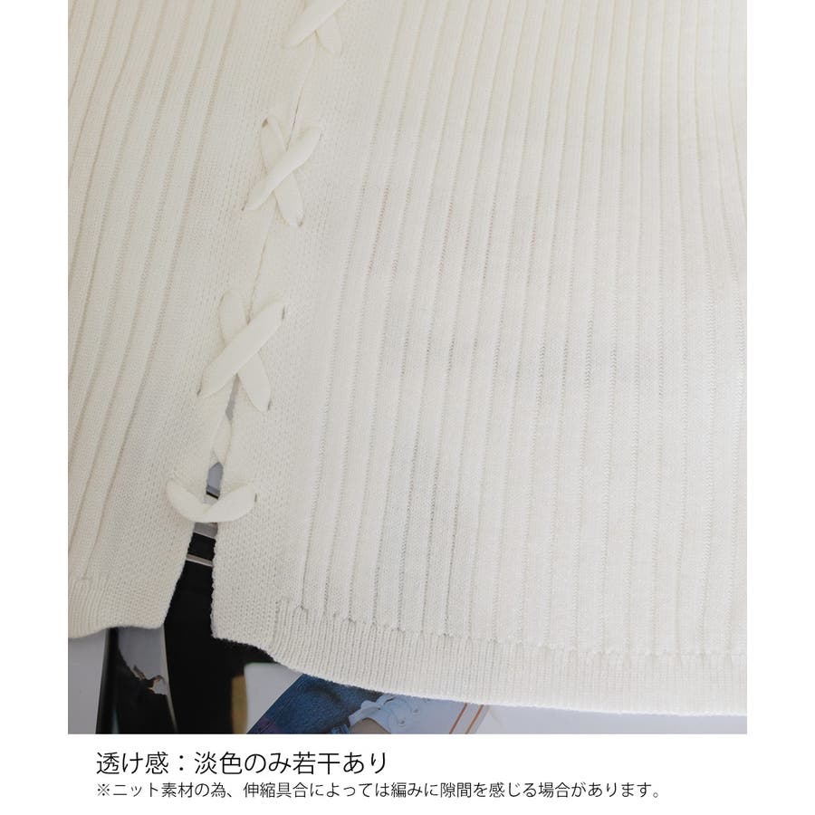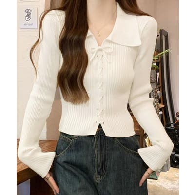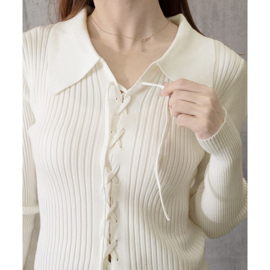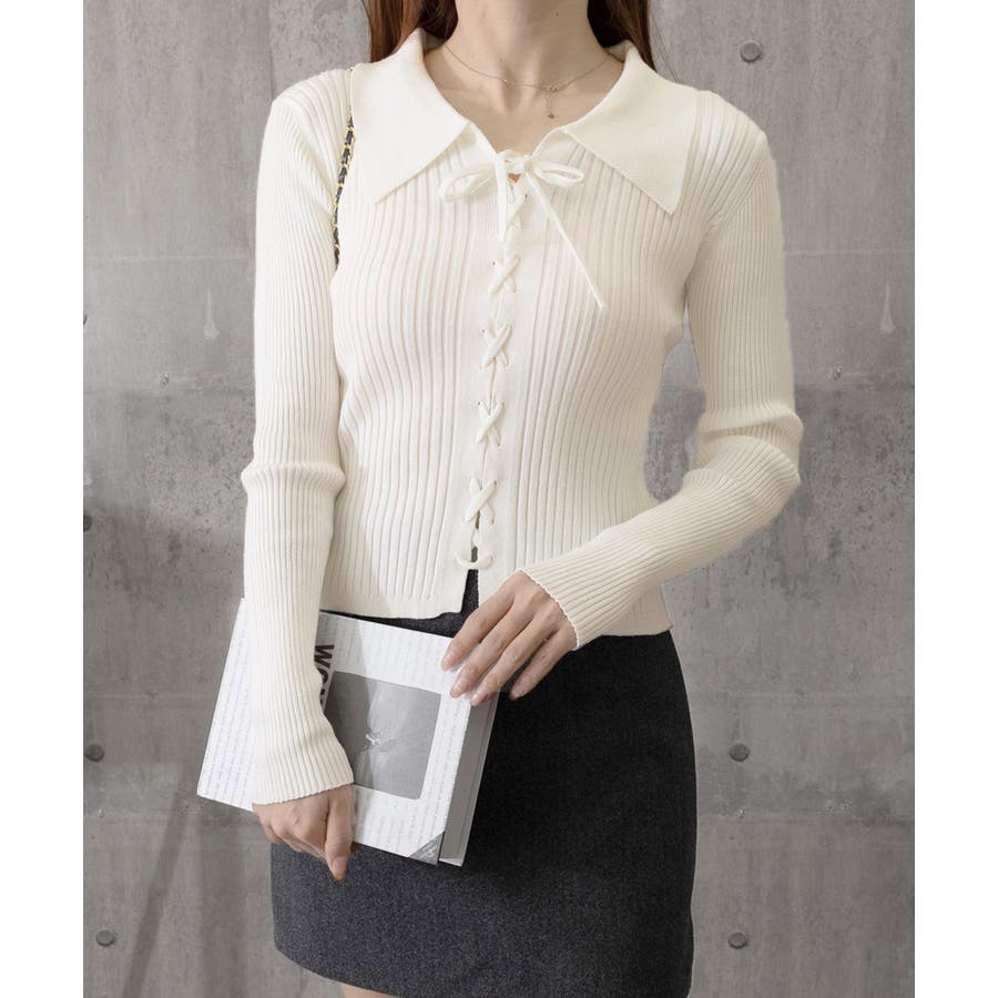 リボン編み上げが目を惹く、フェミニンムードのリブニットトップス。