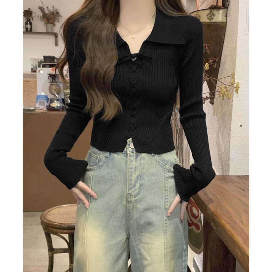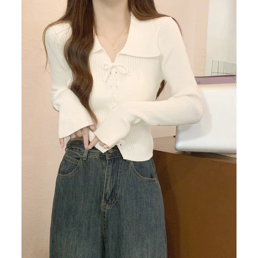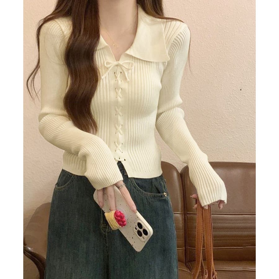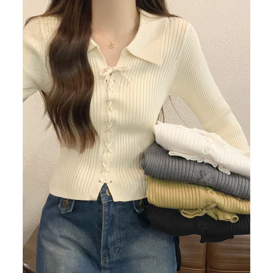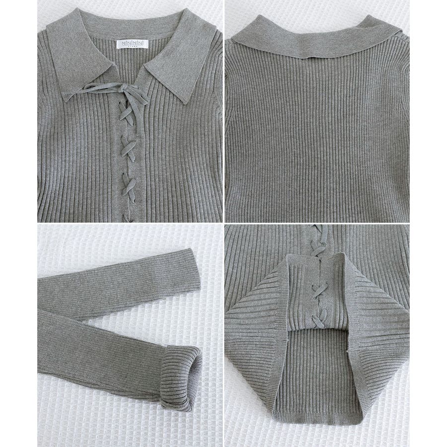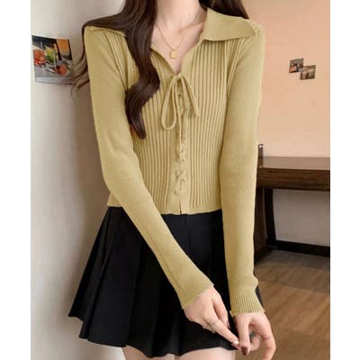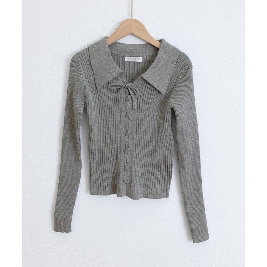 リボン編み上げが目を惹く、フェミニンムードのリブニットトップス。