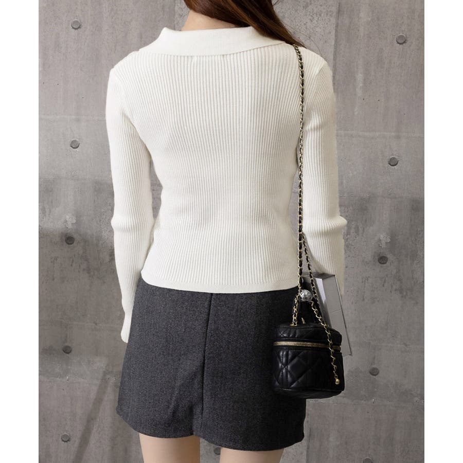 広めの襟デザインが顔まわりに抜け感をプラスし、甘さの中に大人っぽさを添える。