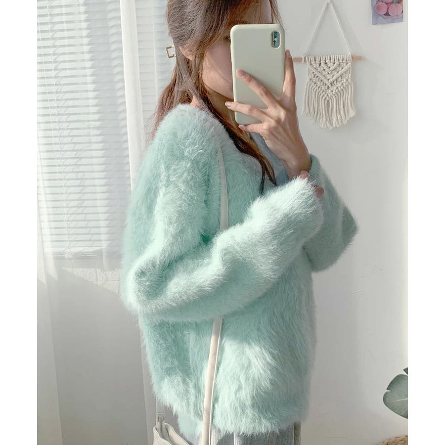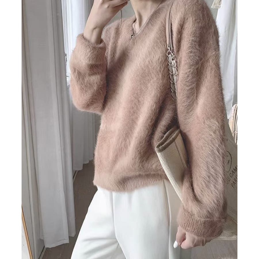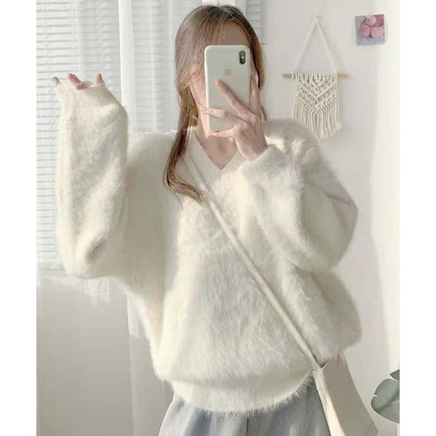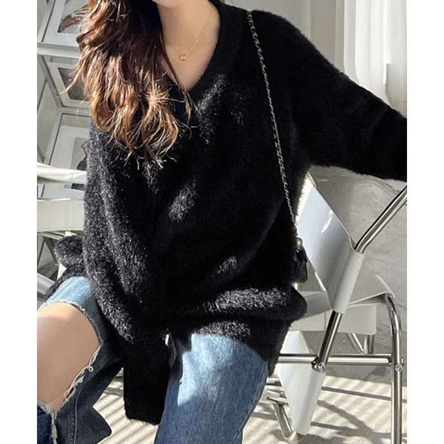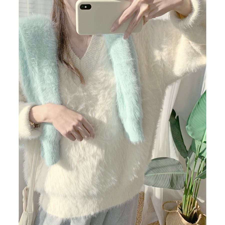柔らかく毛足の長い上質な素材を使用したVネックニットトップス。