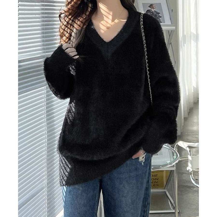 レディース Vネック もこもこニットプルオーバー 長袖無地 柔らかいニット きれいめ ゆったりトップス あたたかセーター