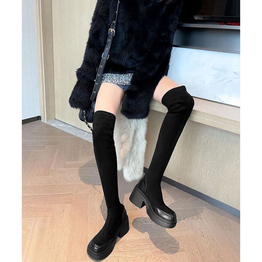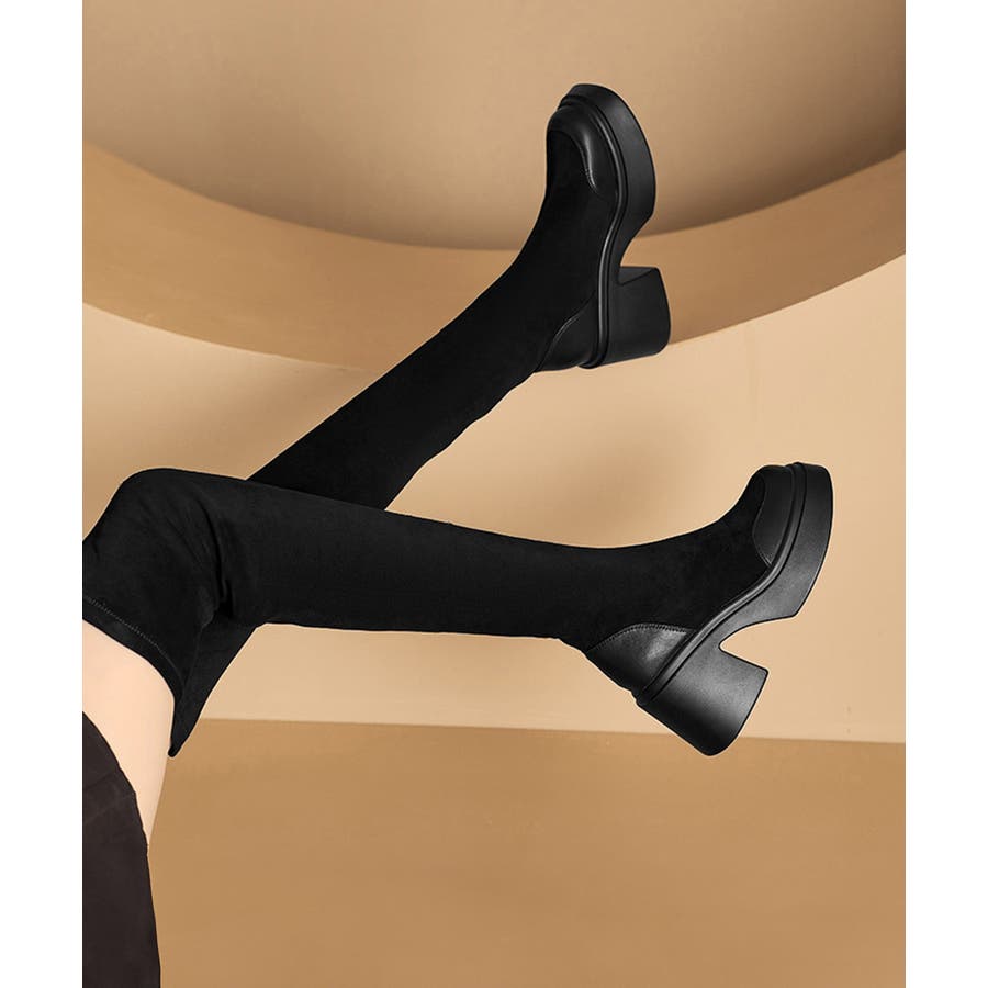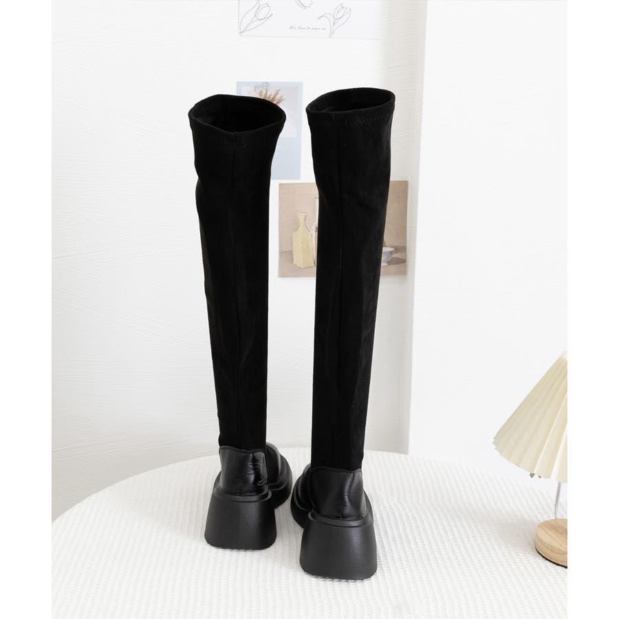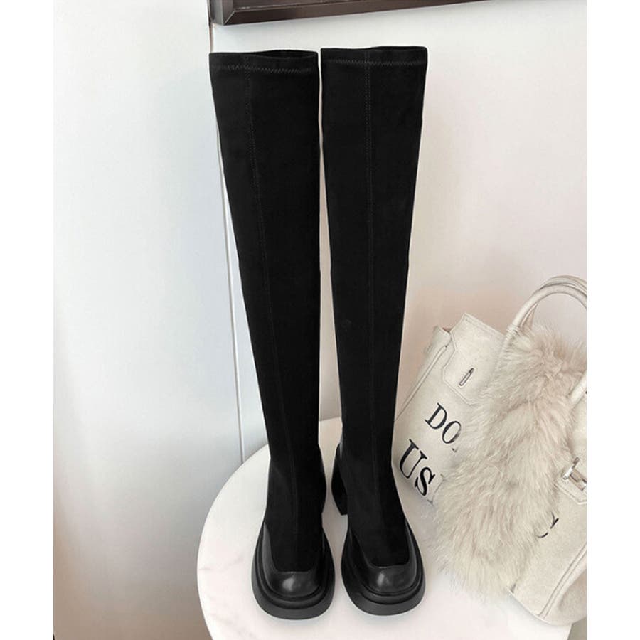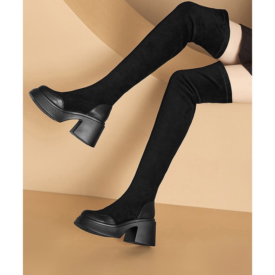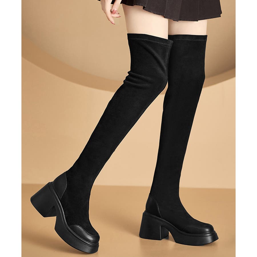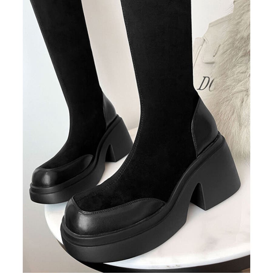 スクエアトゥ 厚底 ジョッキーブーツ 履きやすい膝上ブーツ 美脚脚長ストレッチブーツ大人きれいめ 太ヒールフィットブーツ