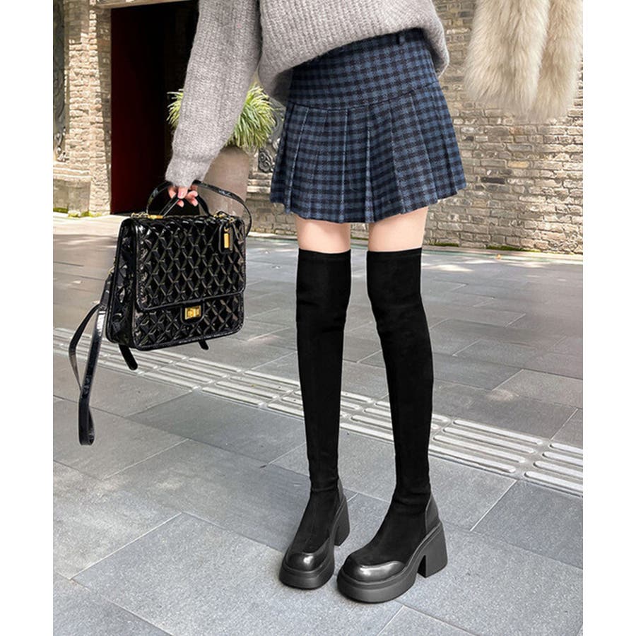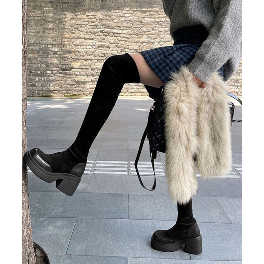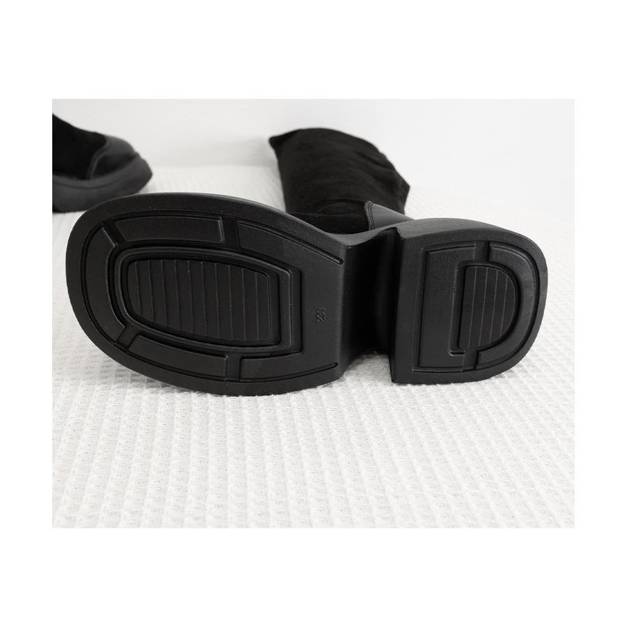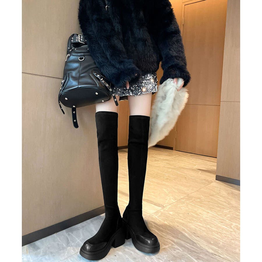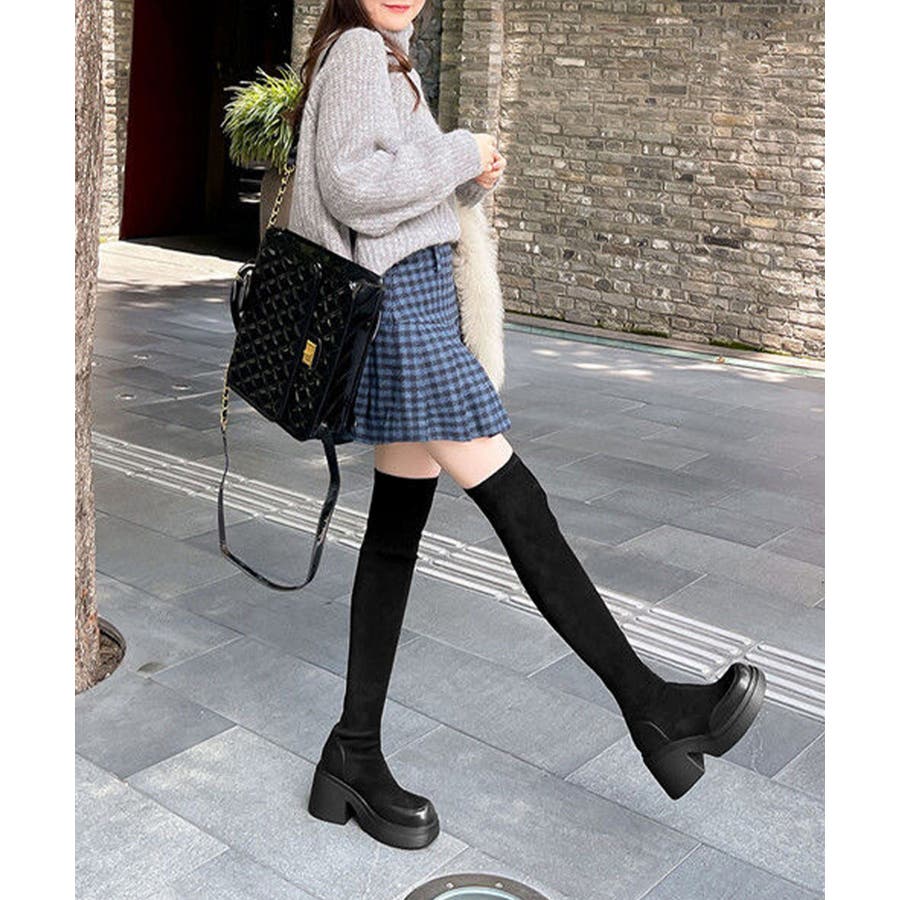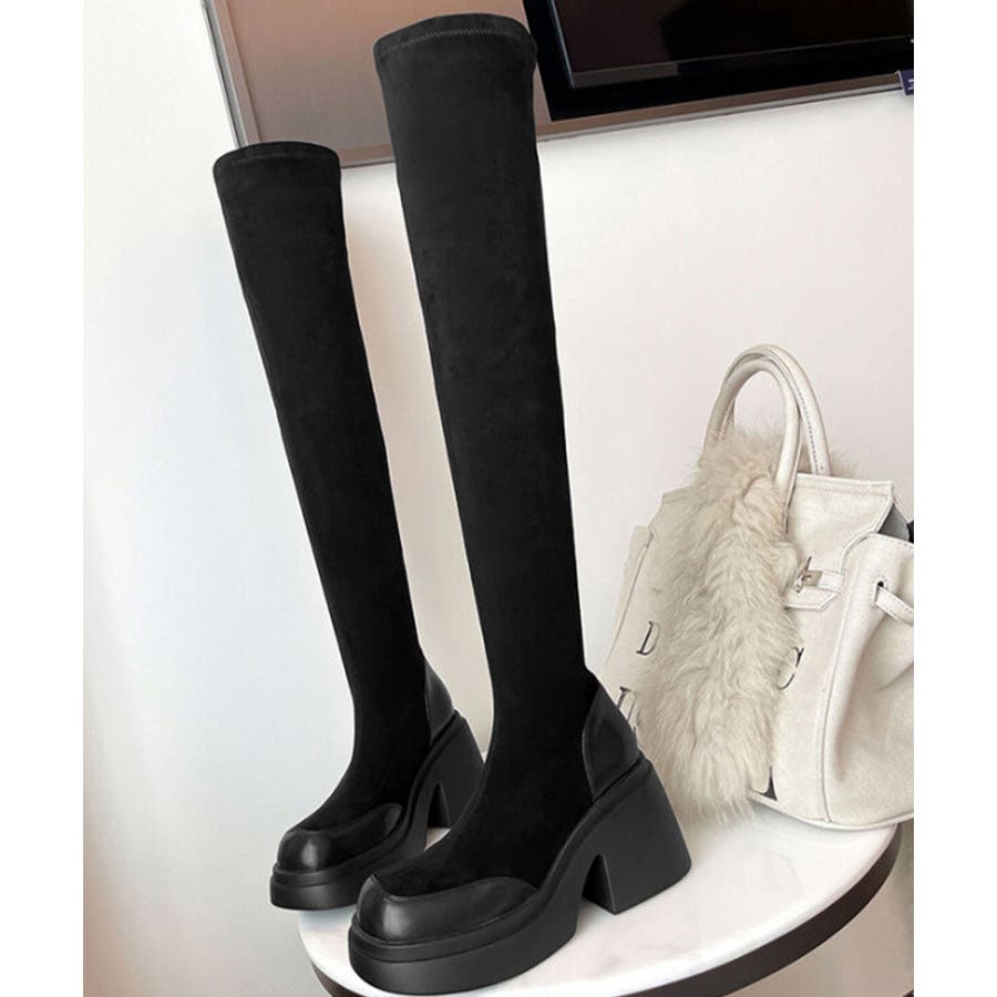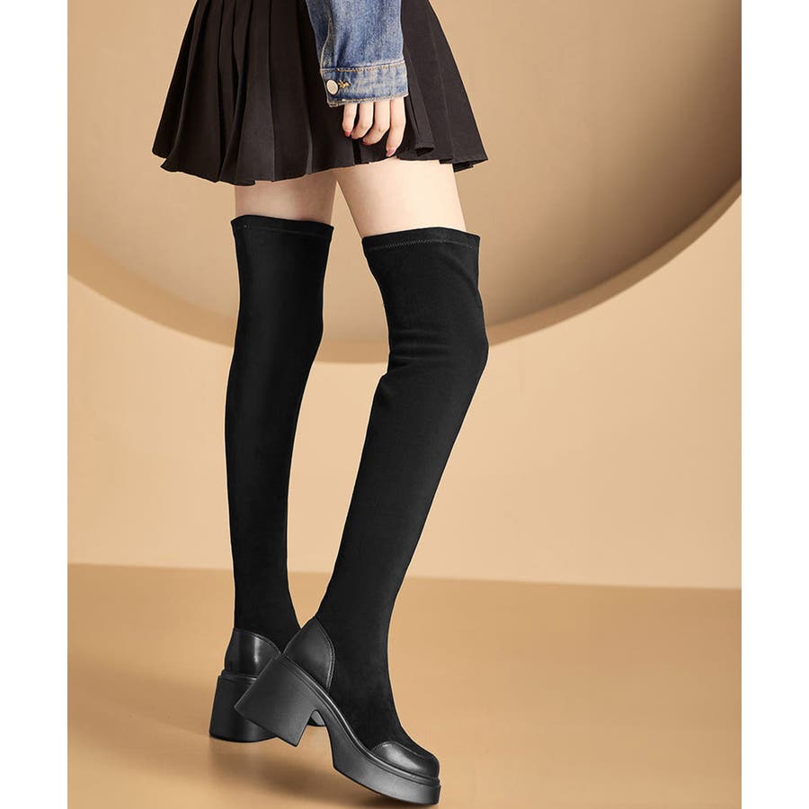 スクエアトゥ 厚底 ジョッキーブーツ 履きやすい膝上ブーツ 美脚脚長ストレッチブーツ大人きれいめ 太ヒールフィットブーツ