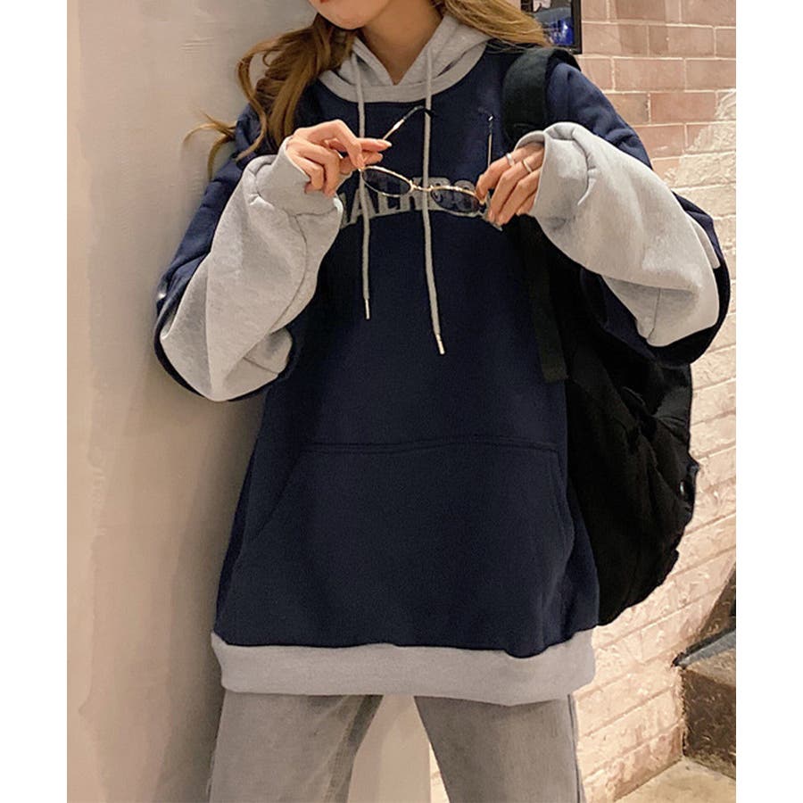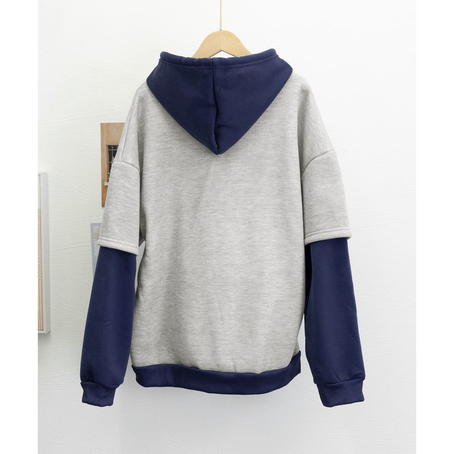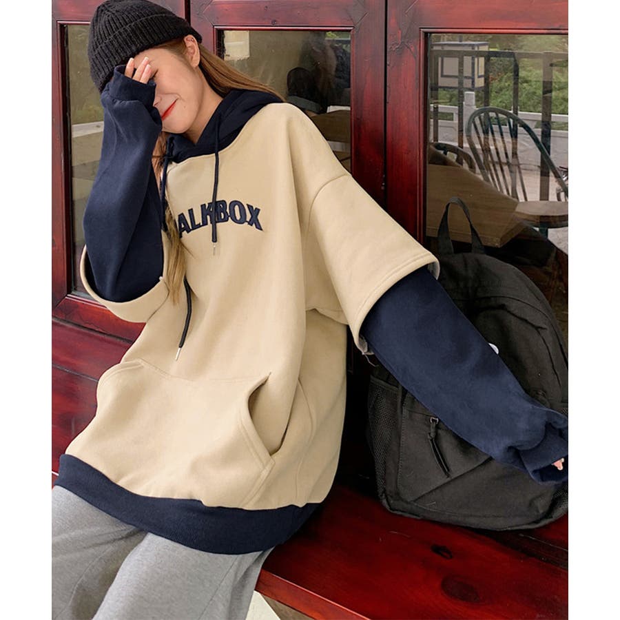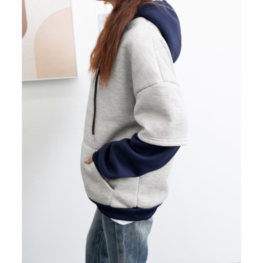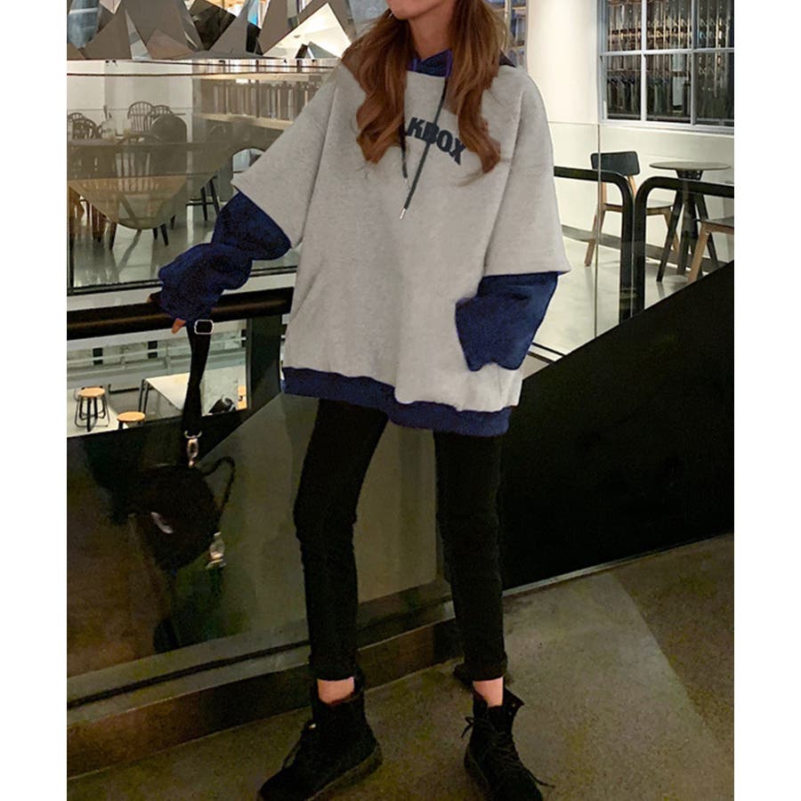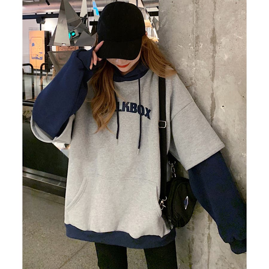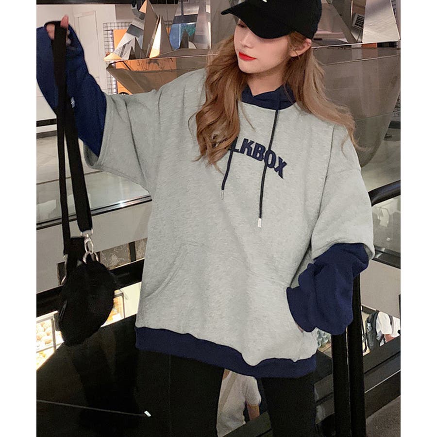 体型カバー 秋冬服 長袖ビッグパーカー 切り替え トップス