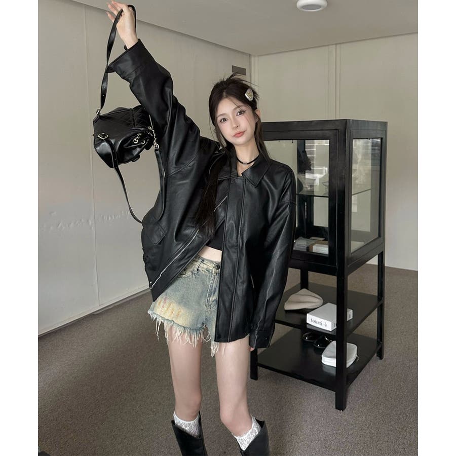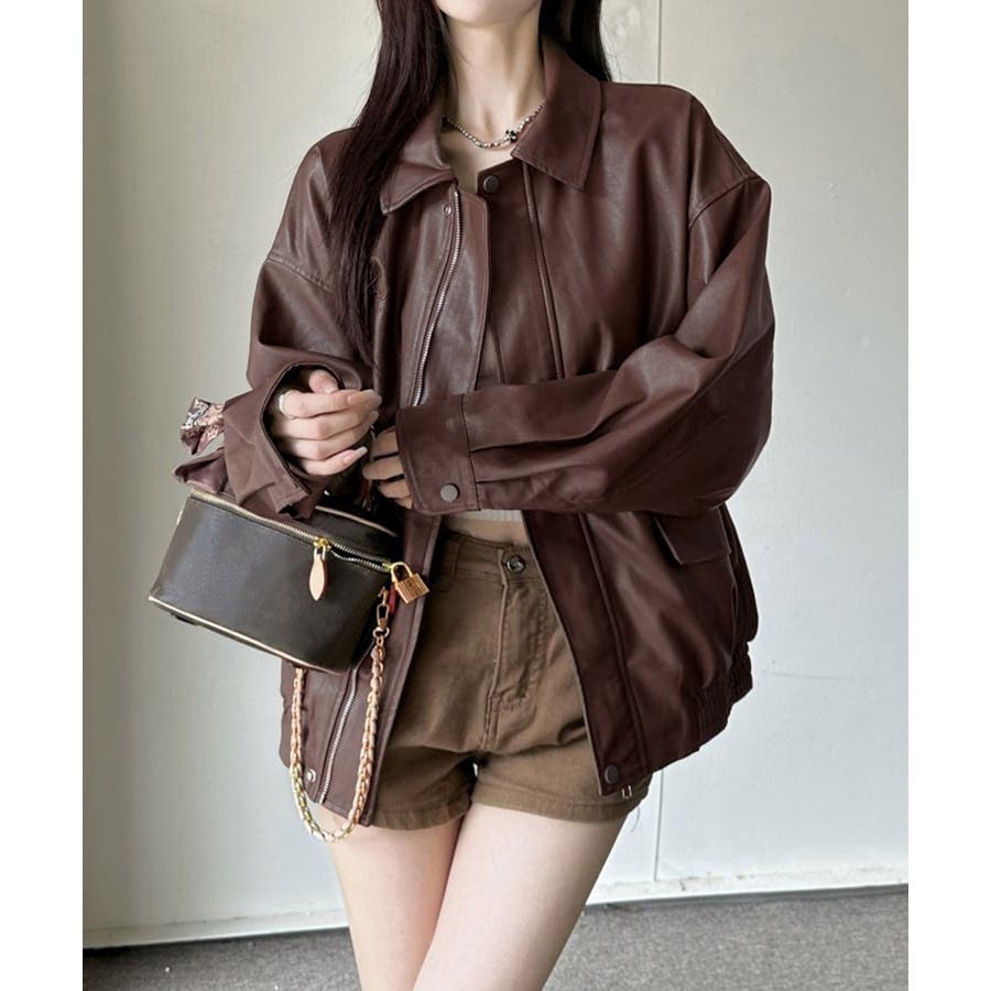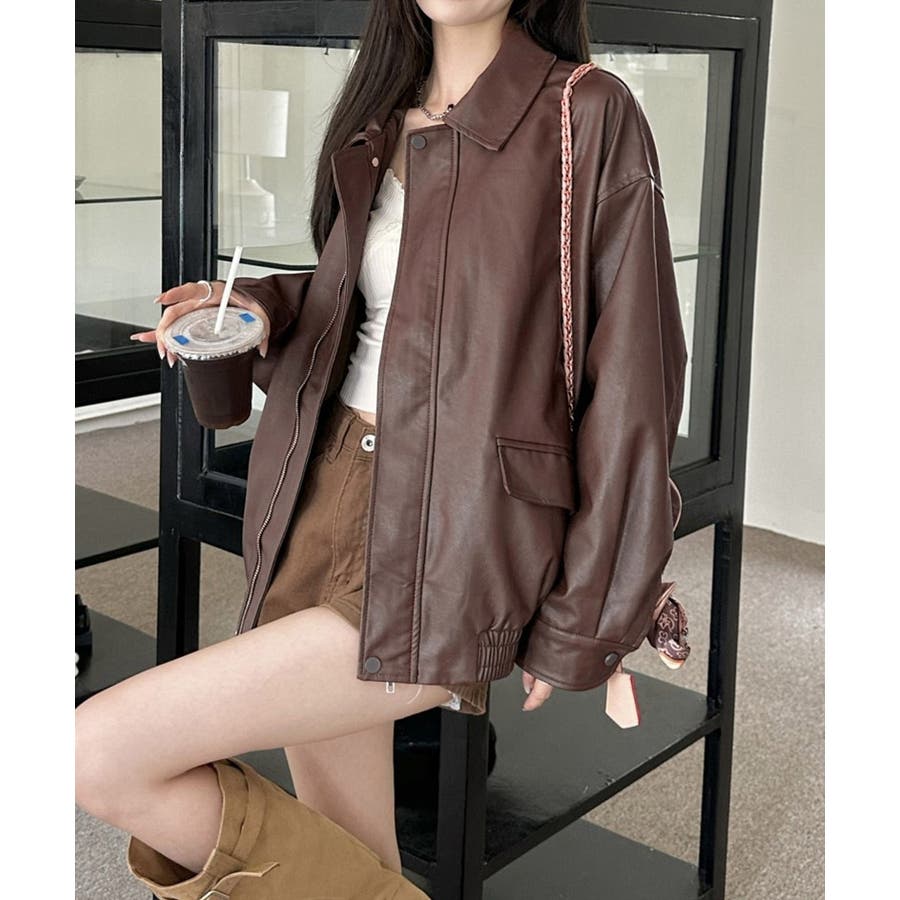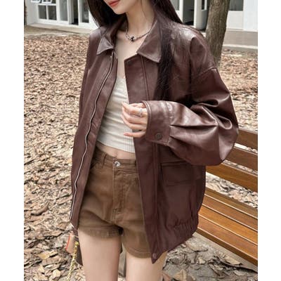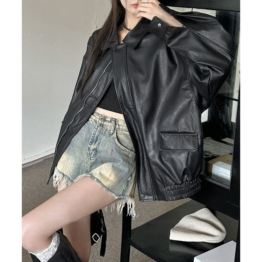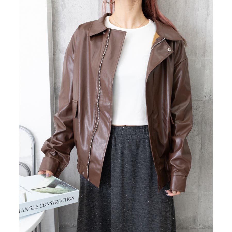 トレンド感たっぷりのレディースドロップショルダージップアップPUレザージャケット。