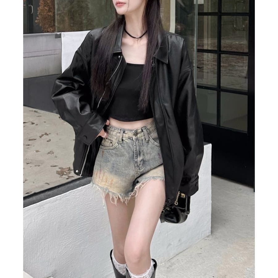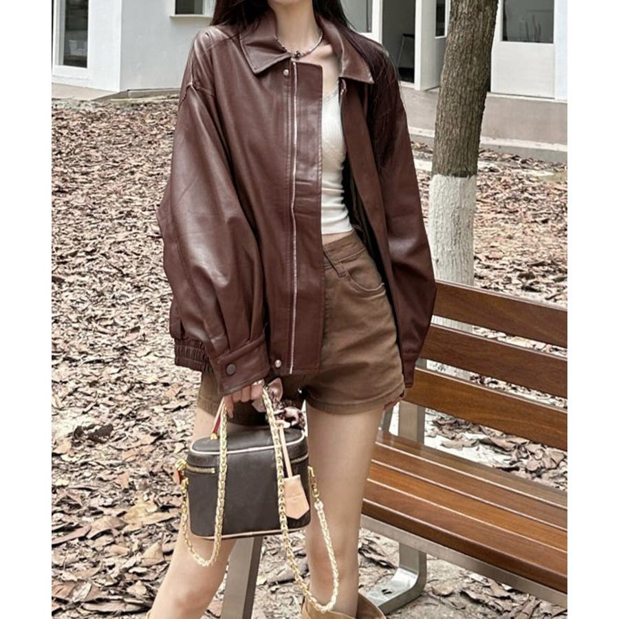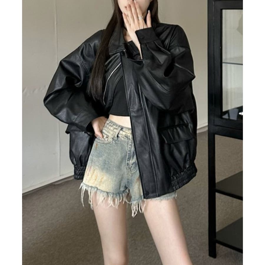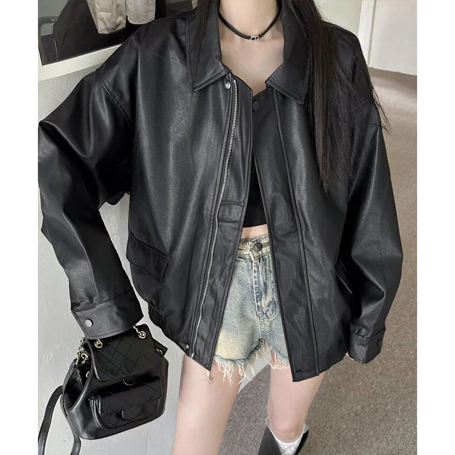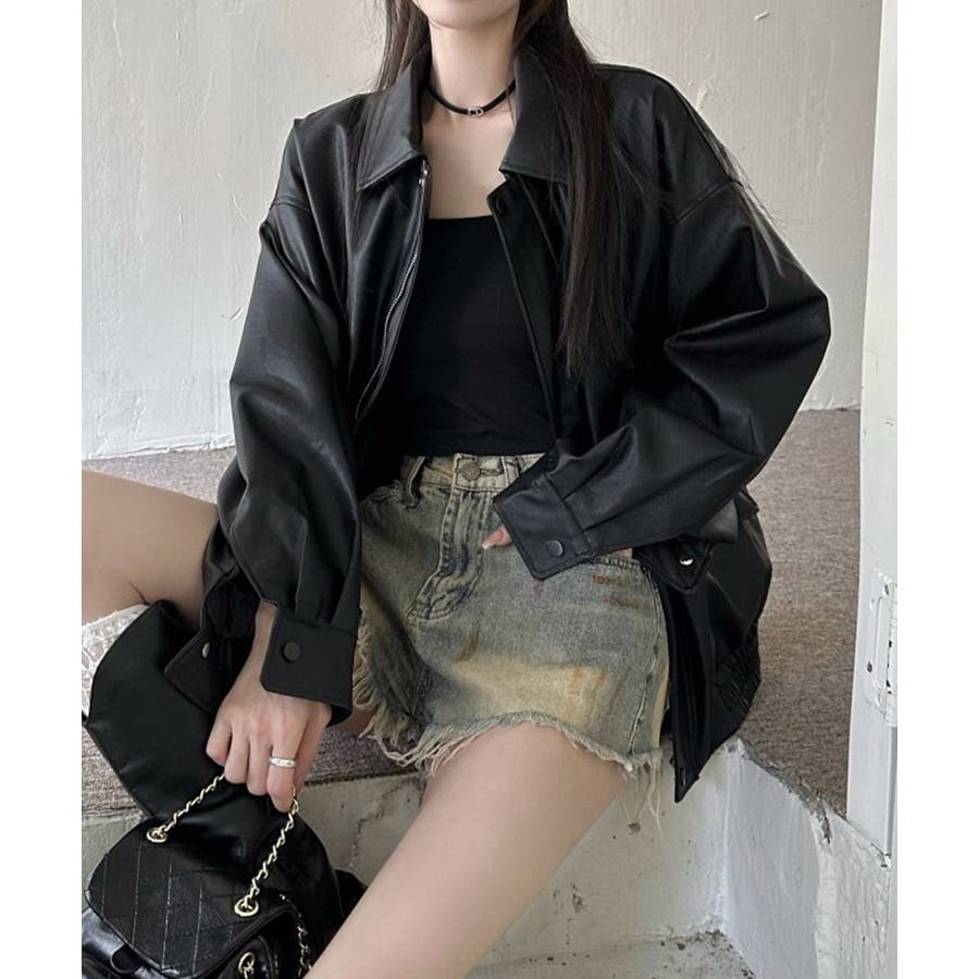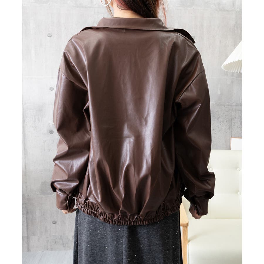 トレンド感たっぷりのレディースドロップショルダージップアップPUレザージャケット。