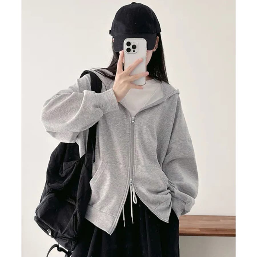 フード付きの上下開きファスナースウェットアウター。