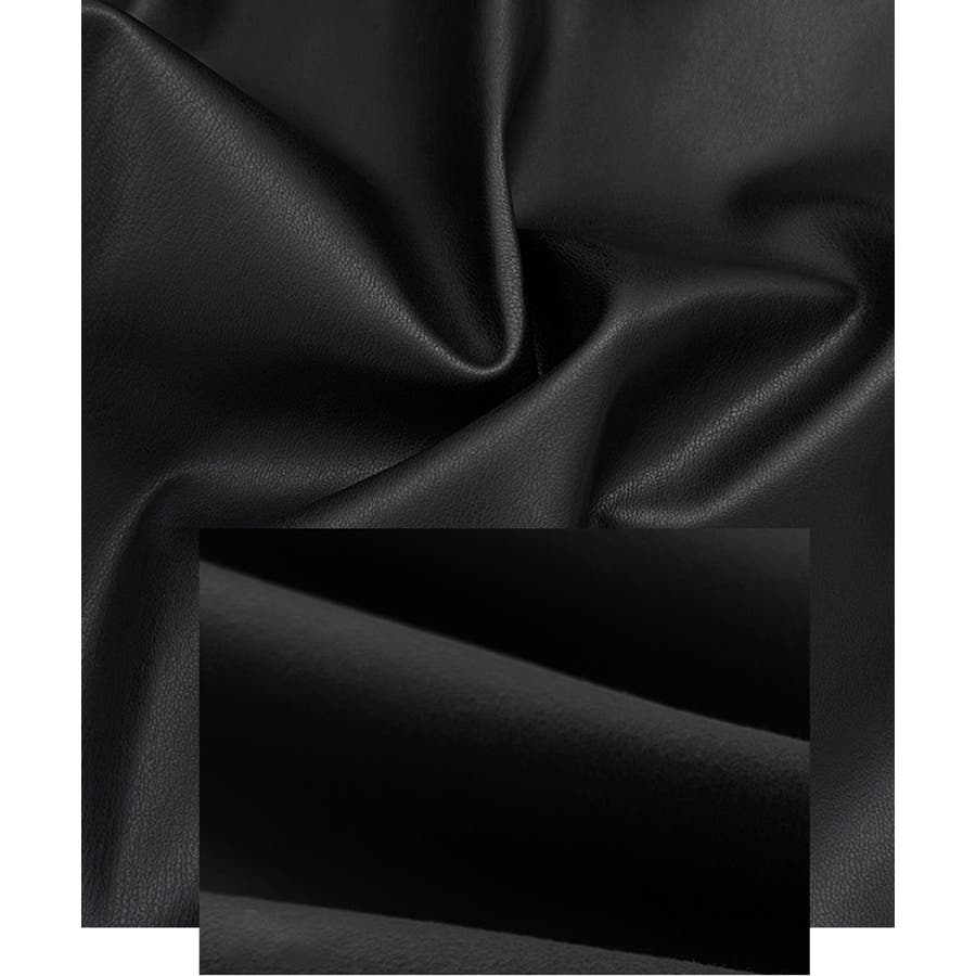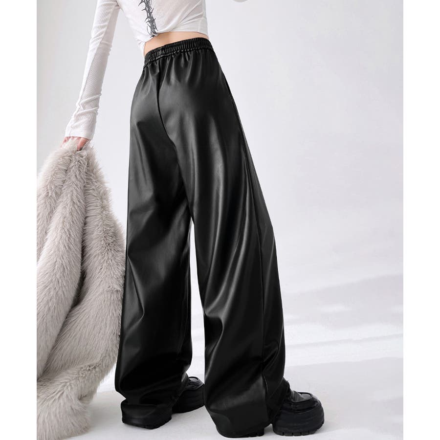 光沢のあるPUレザー素材で仕上げたストレートシルエットのレディースパンツ。