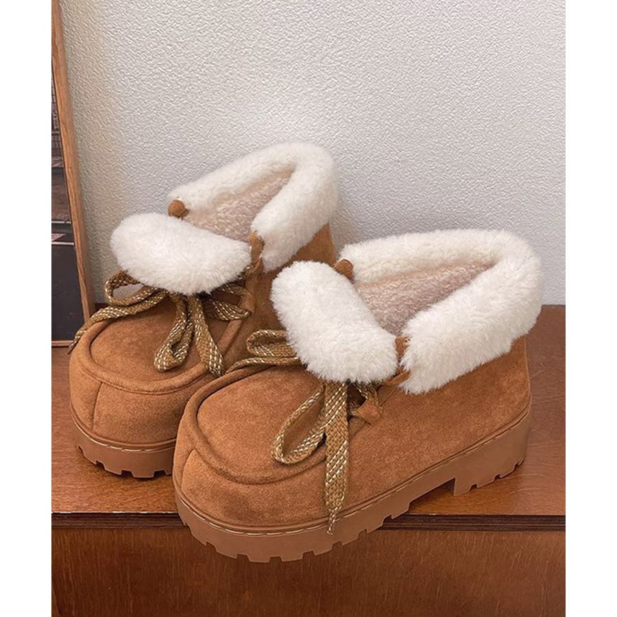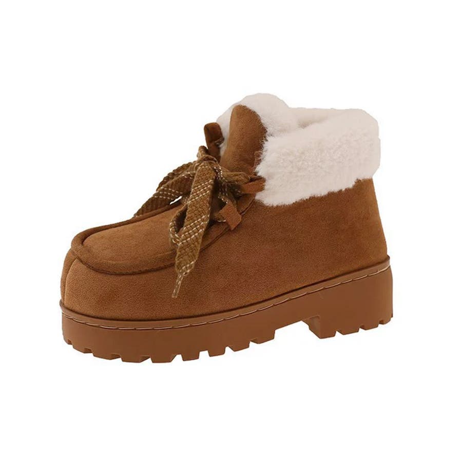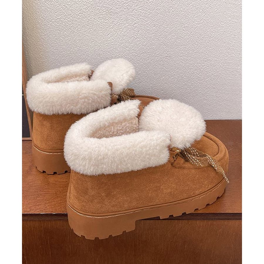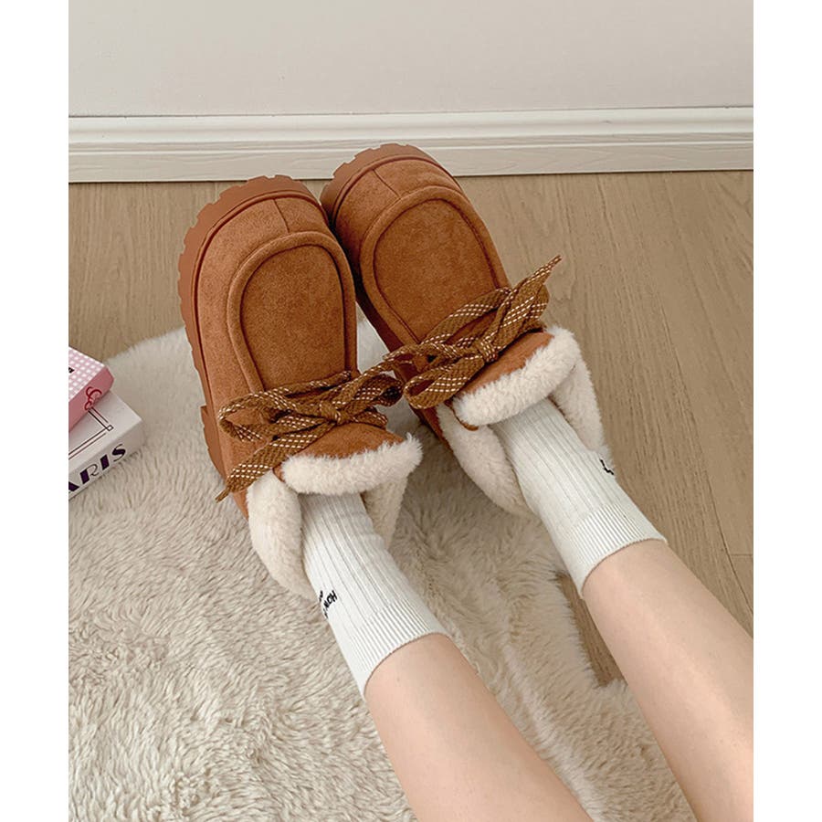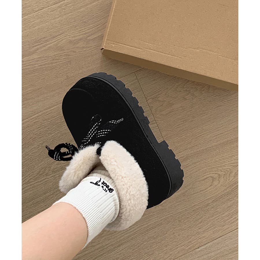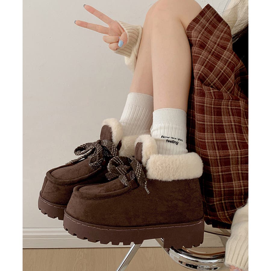 足元に季節のぬくもりを添える、ふわふわボア仕様の厚底レースアップショートブーツ。
