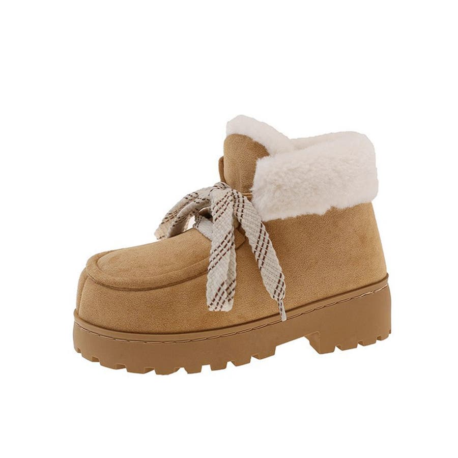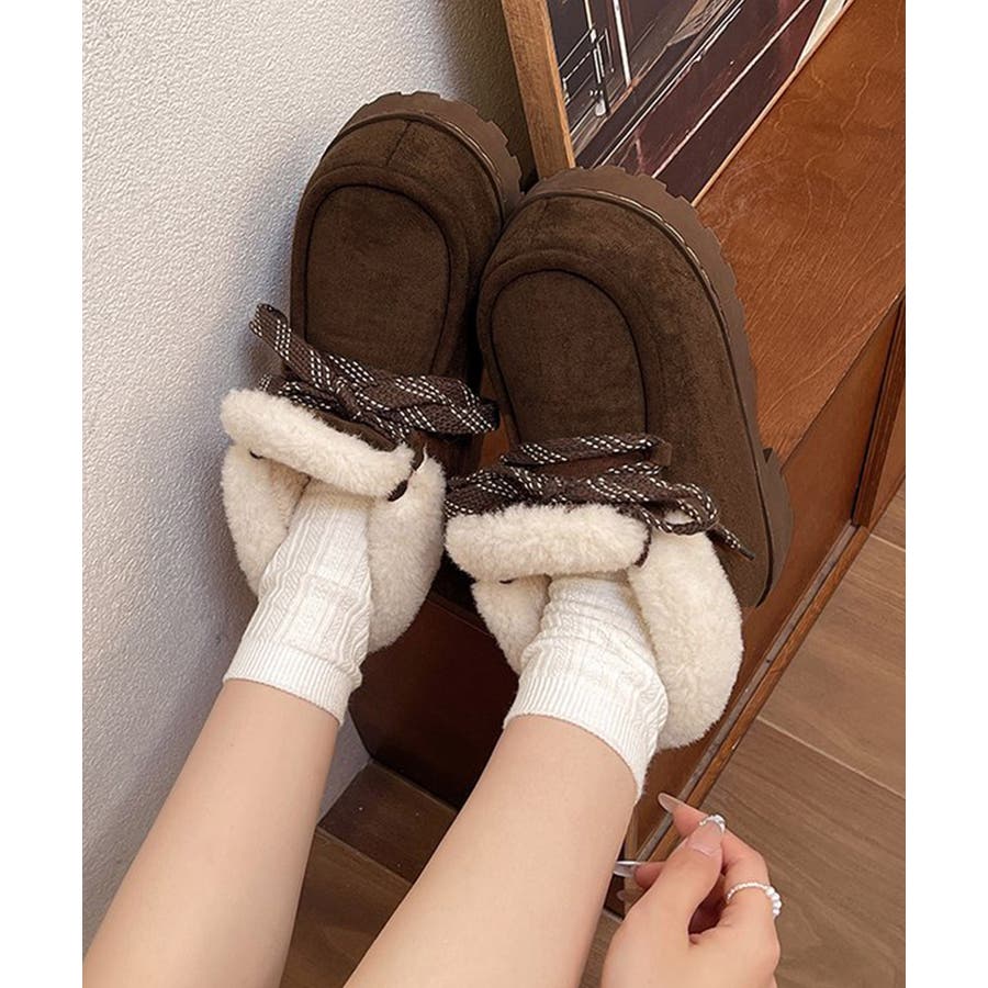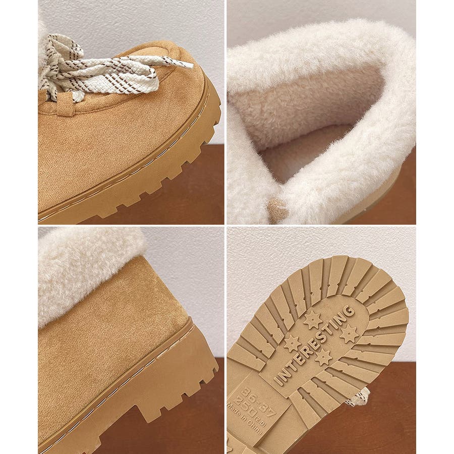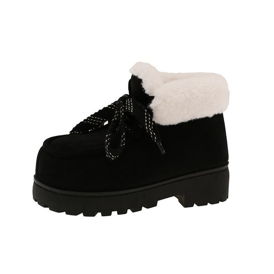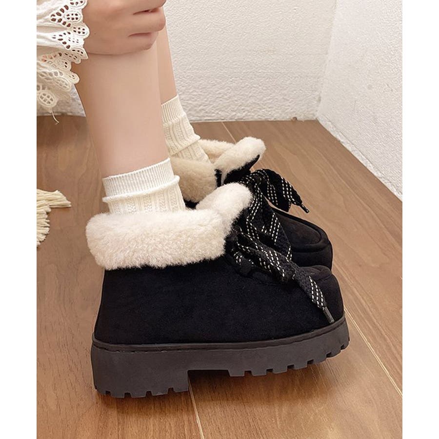 足元に季節のぬくもりを添える、ふわふわボア仕様の厚底レースアップショートブーツ。