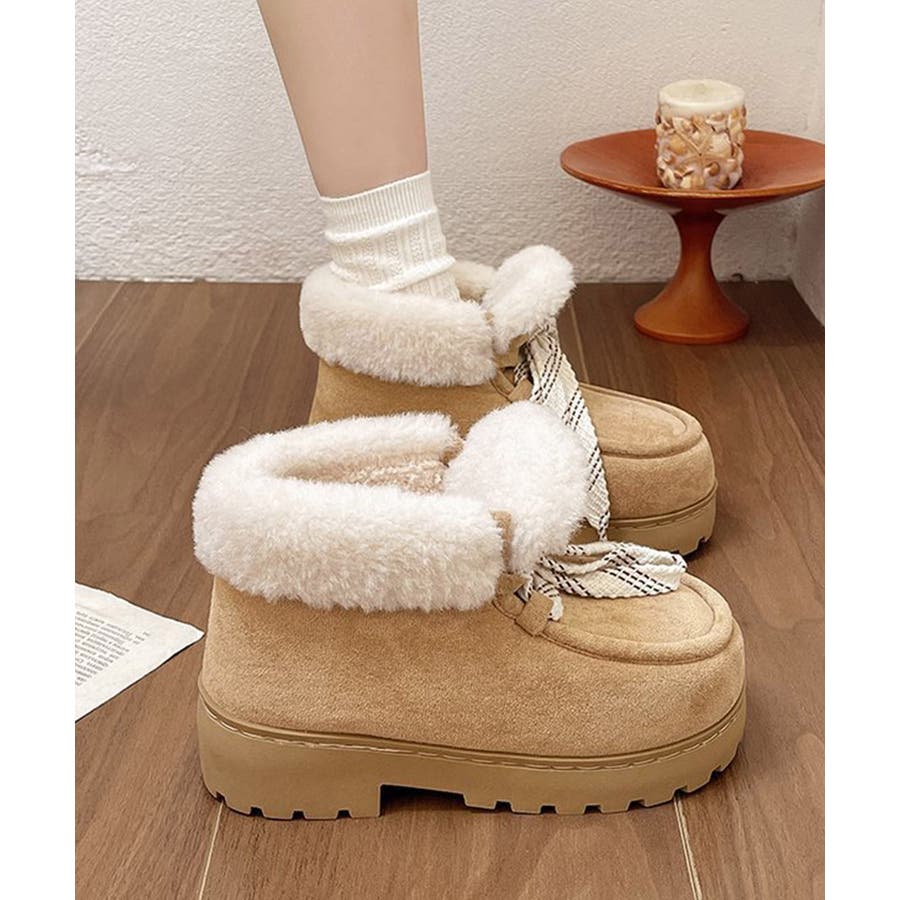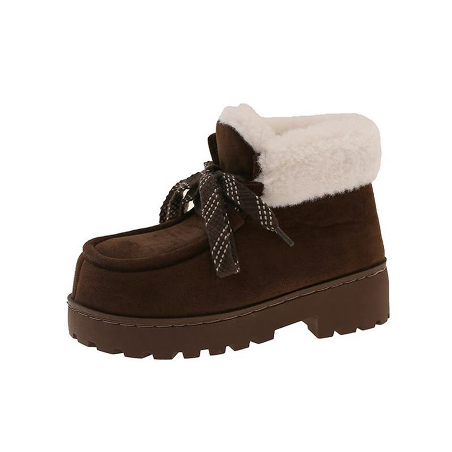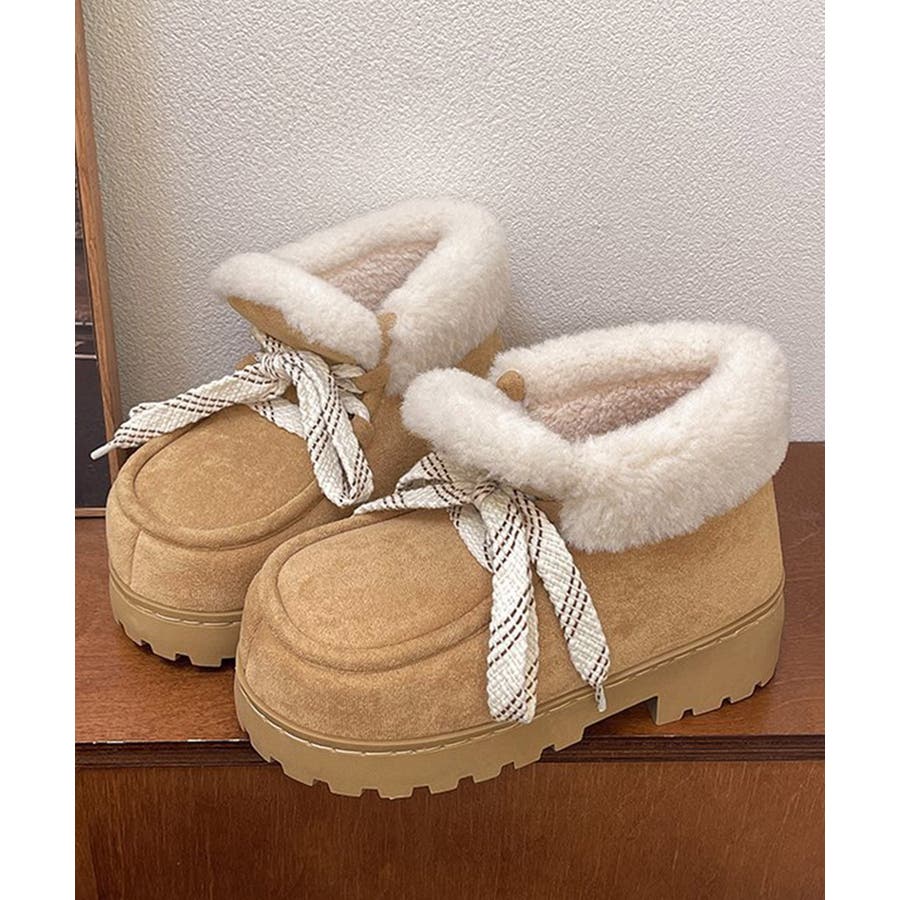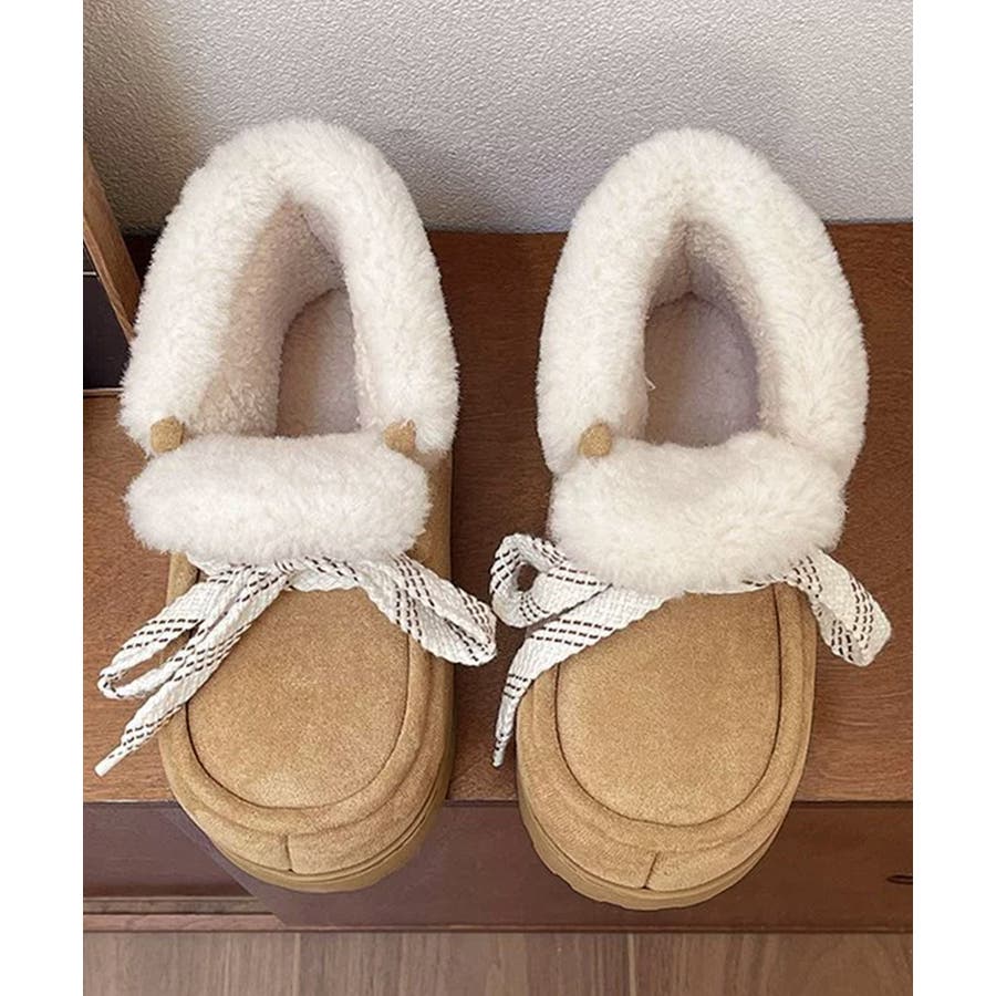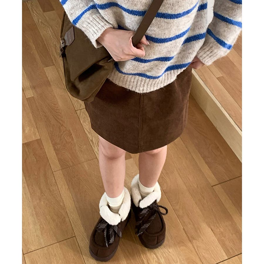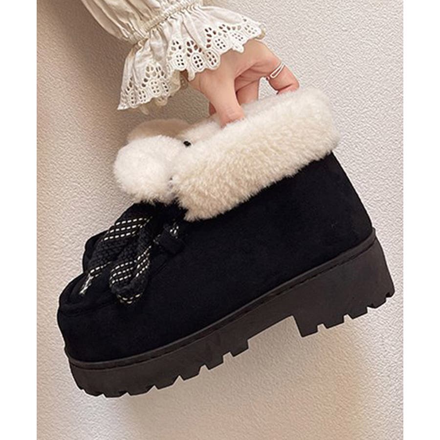 足元に季節のぬくもりを添える、ふわふわボア仕様の厚底レースアップショートブーツ。