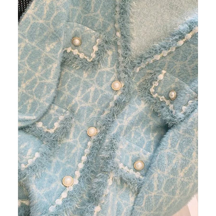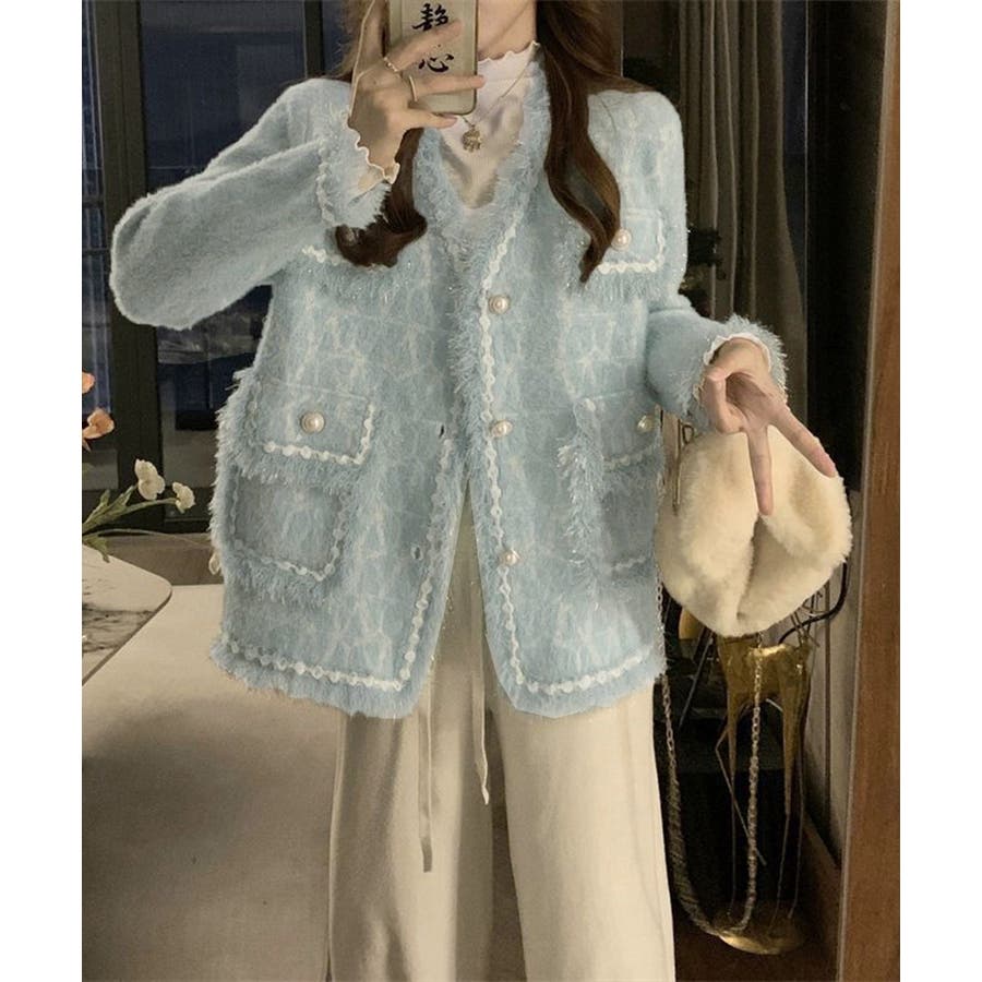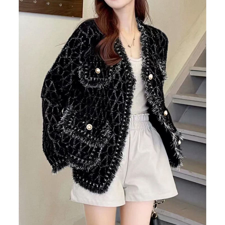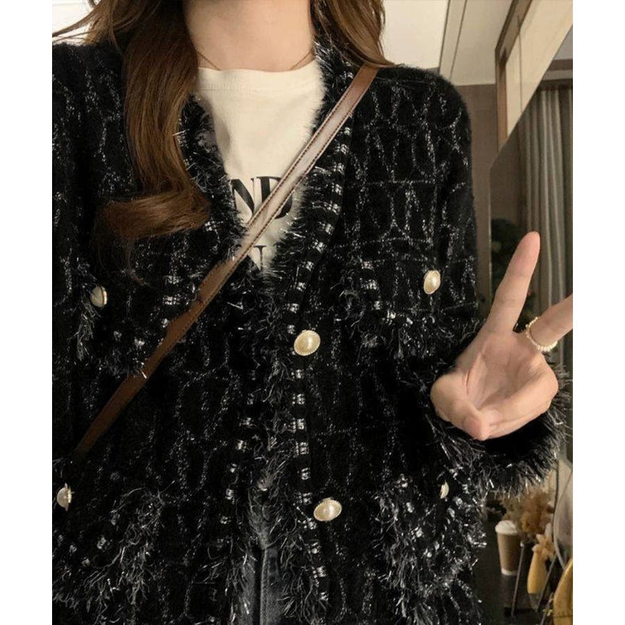 韓国風のツイード調デザインが映える、今期秋冬新作のレディースフリンジニットカーディガン。