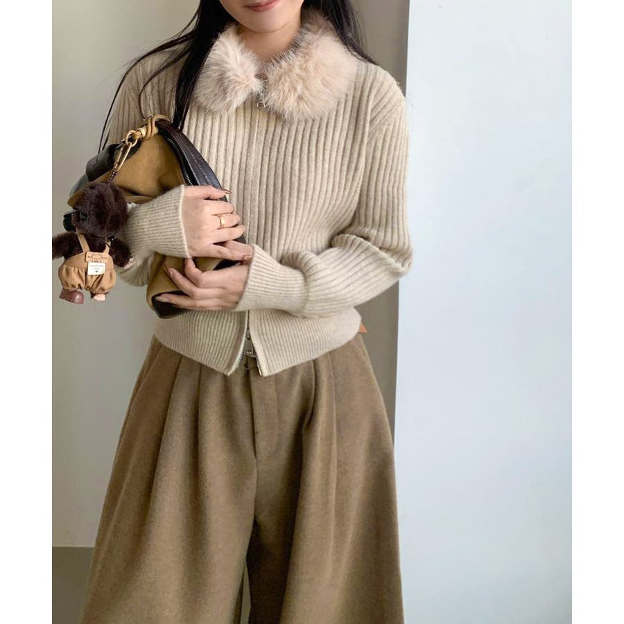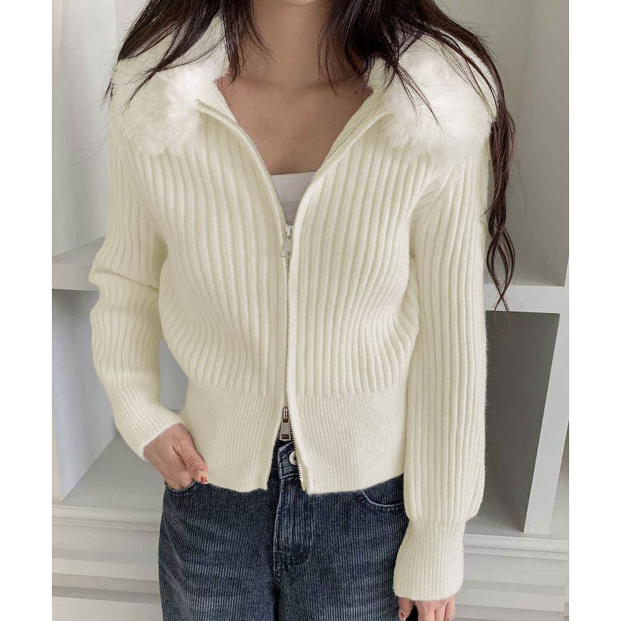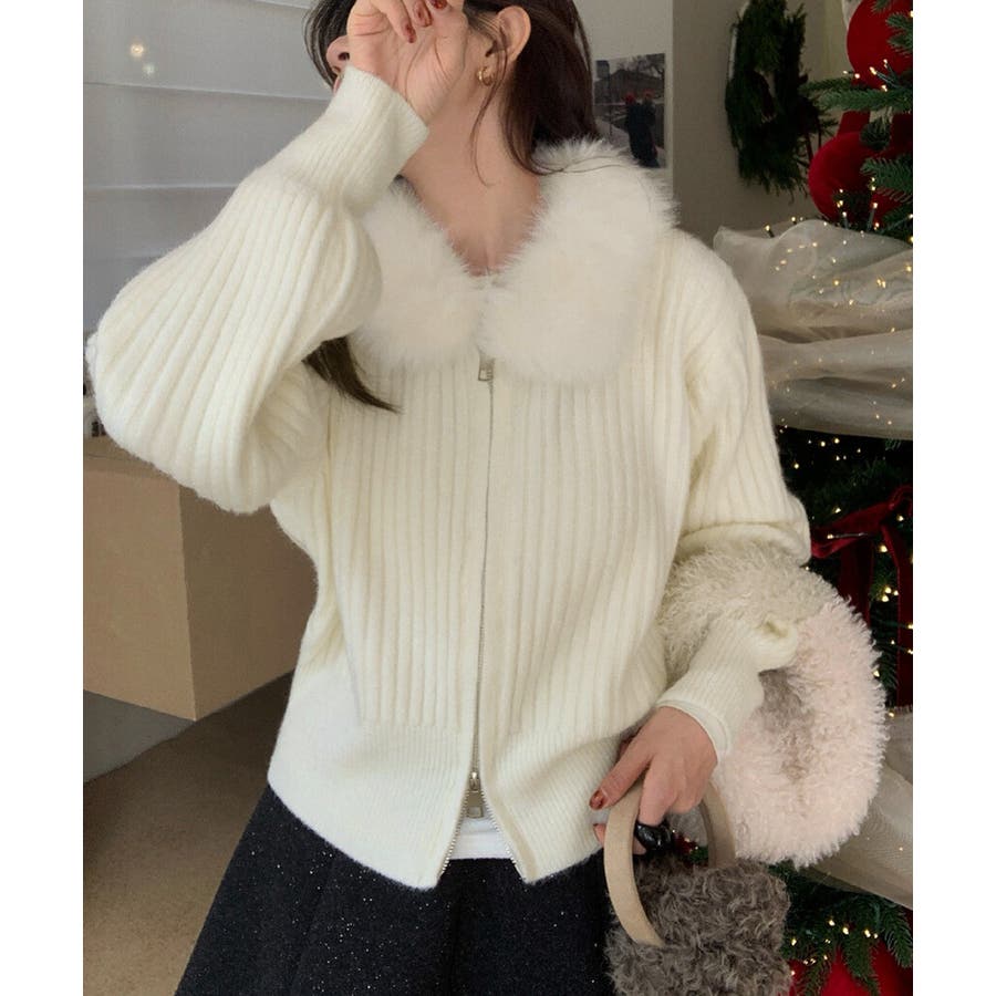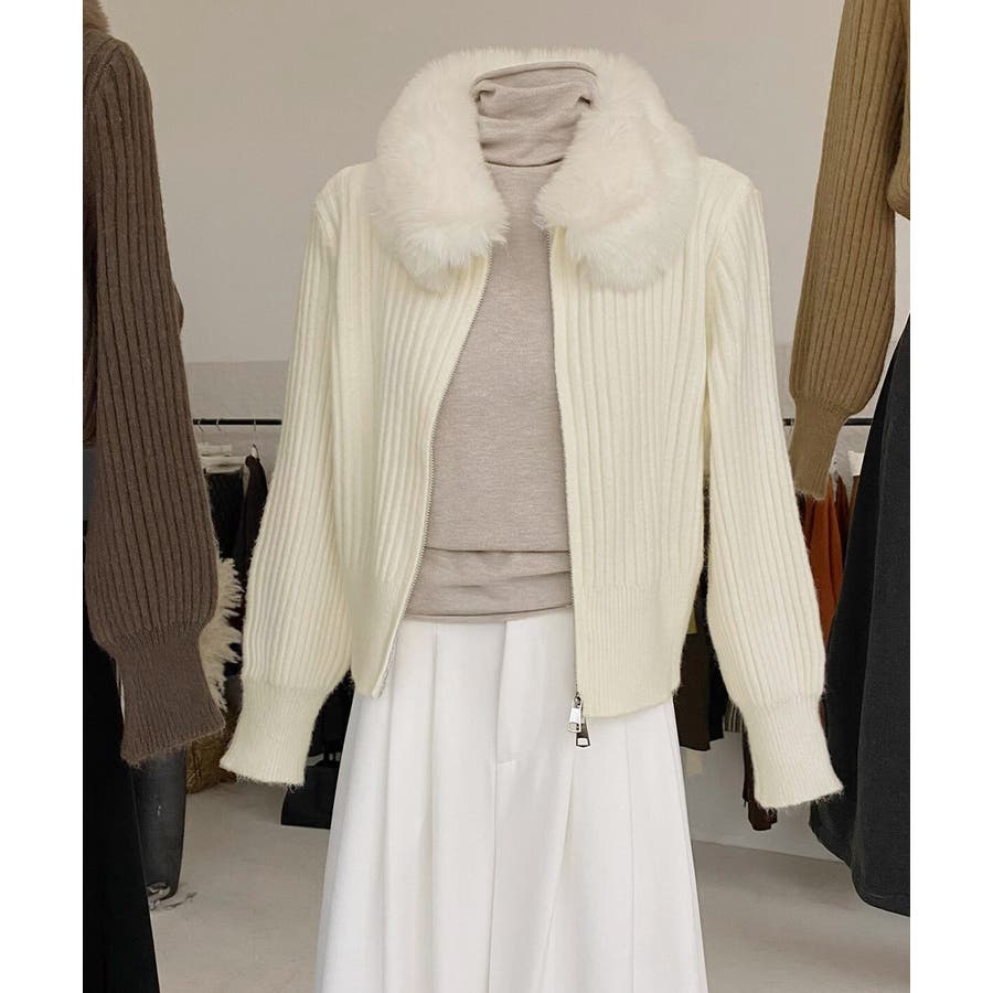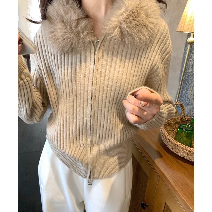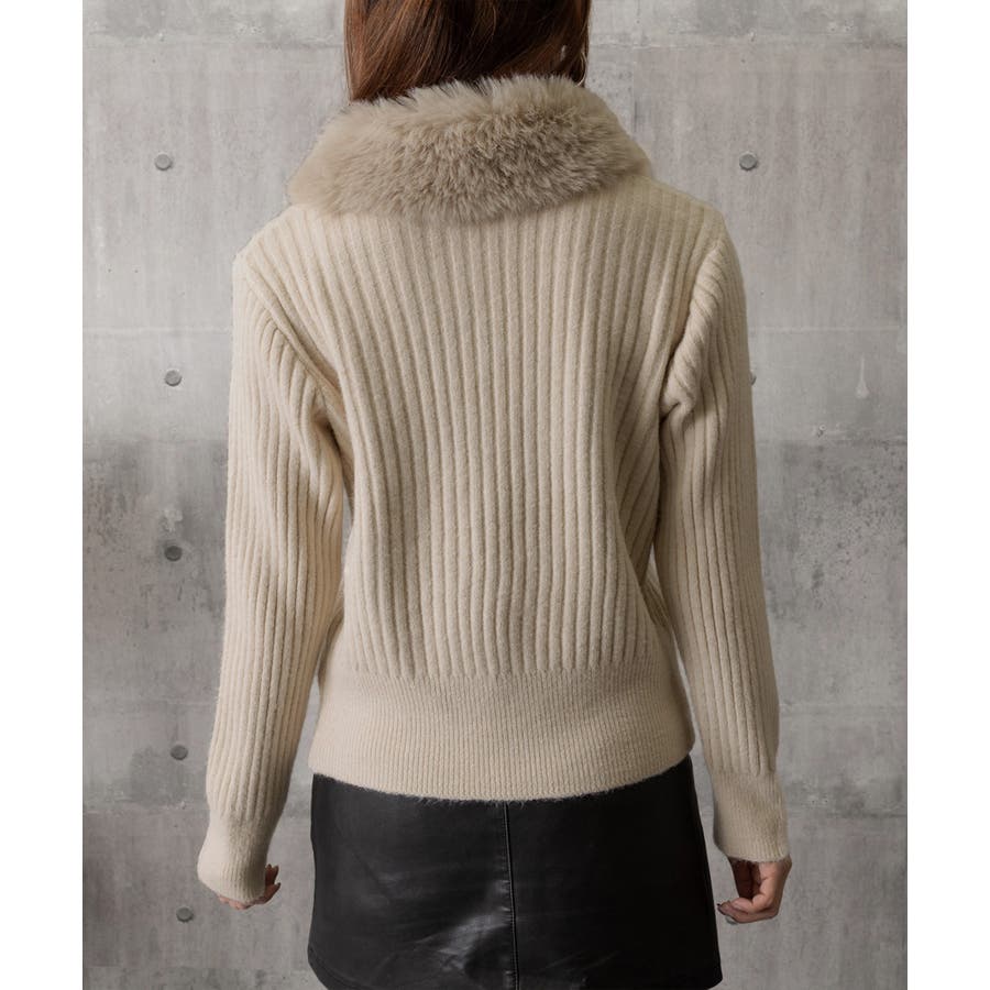 上品な雰囲気をまとえる、ふわふわのフェイクファーカラーが印象的なリブニットカーディガン。