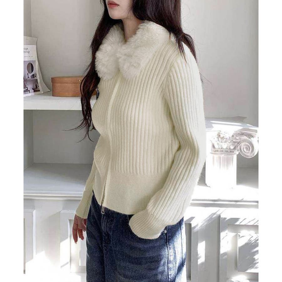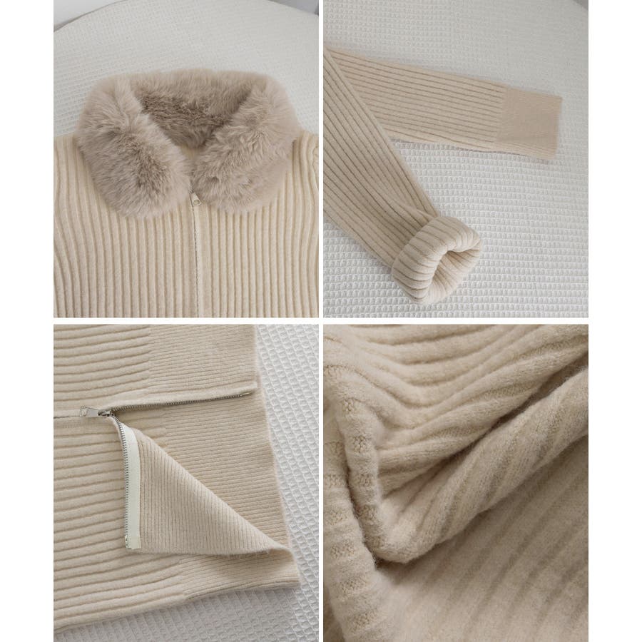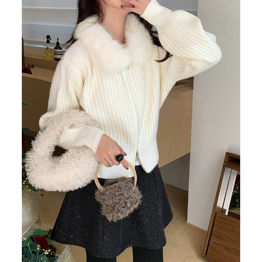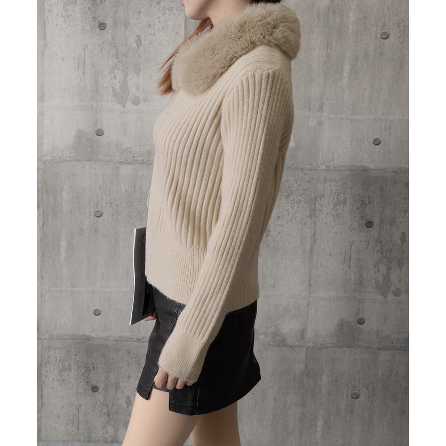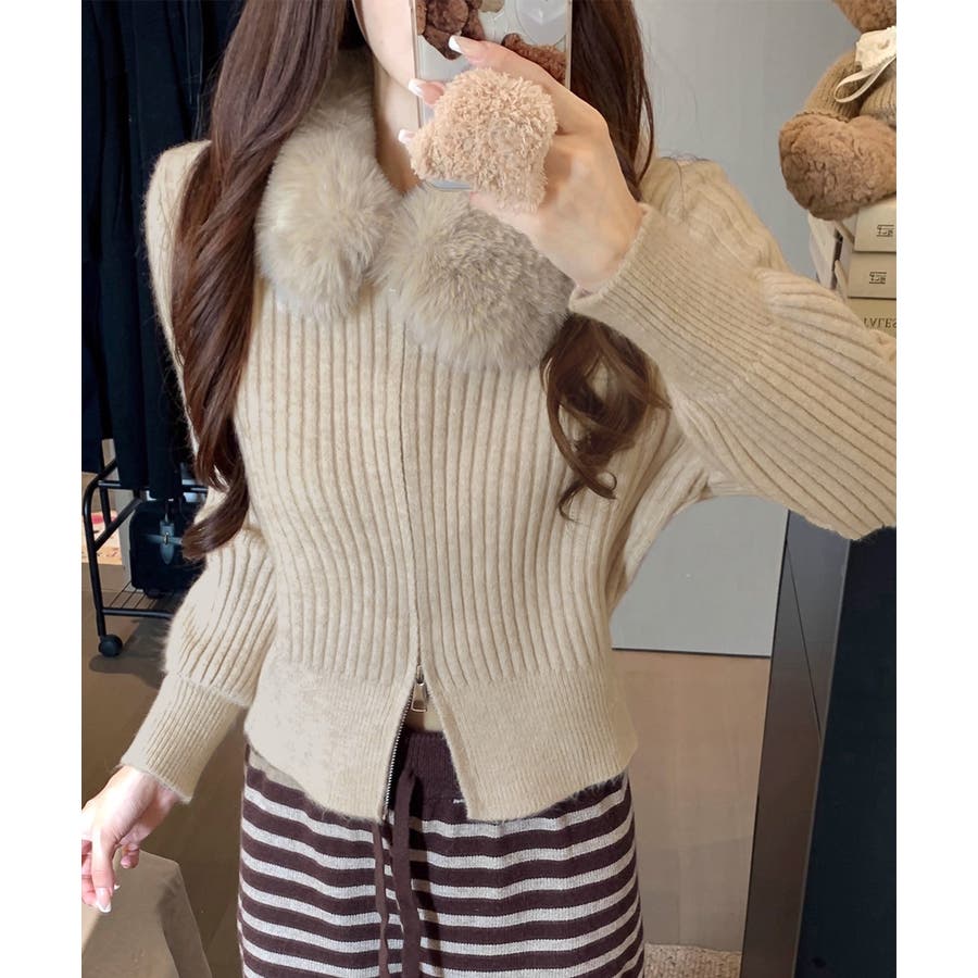 上品な雰囲気をまとえる、ふわふわのフェイクファーカラーが印象的なリブニットカーディガン。