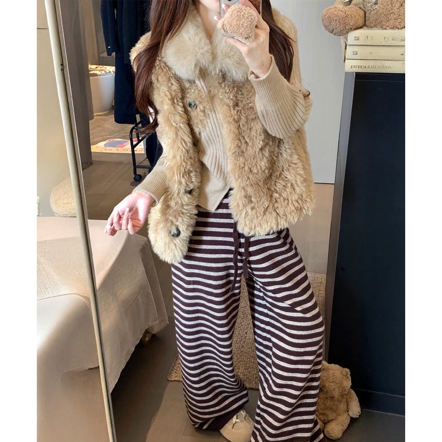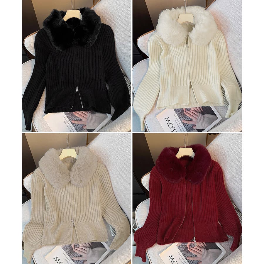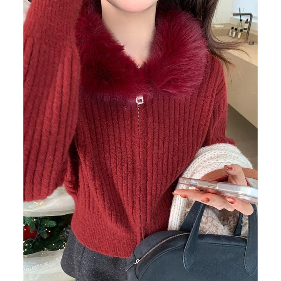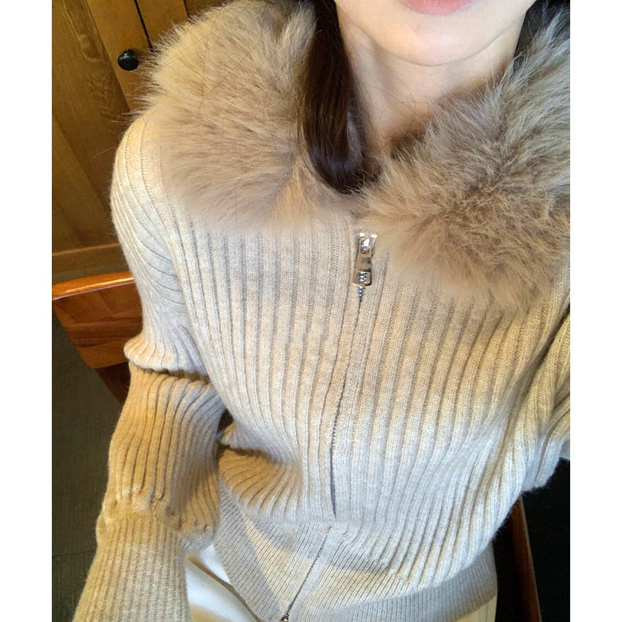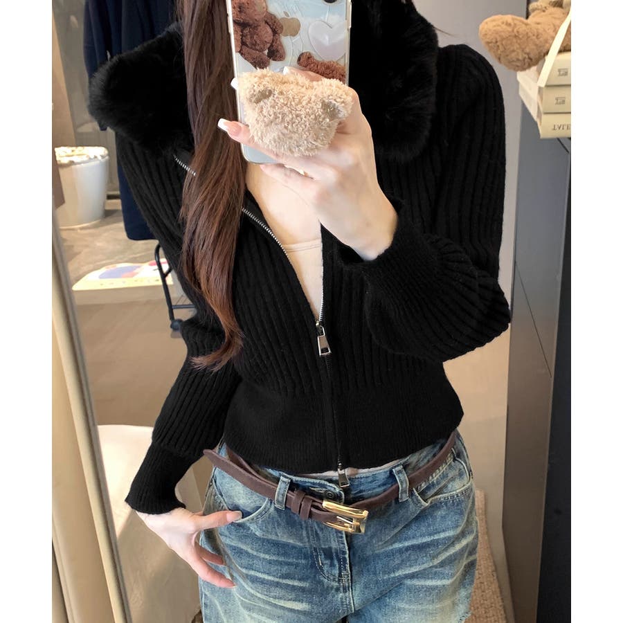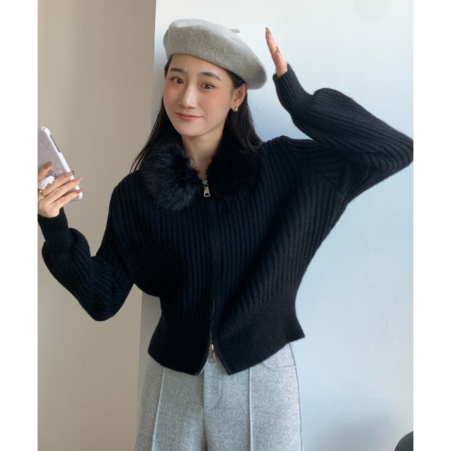 上品な雰囲気をまとえる、ふわふわのフェイクファーカラーが印象的なリブニットカーディガン。