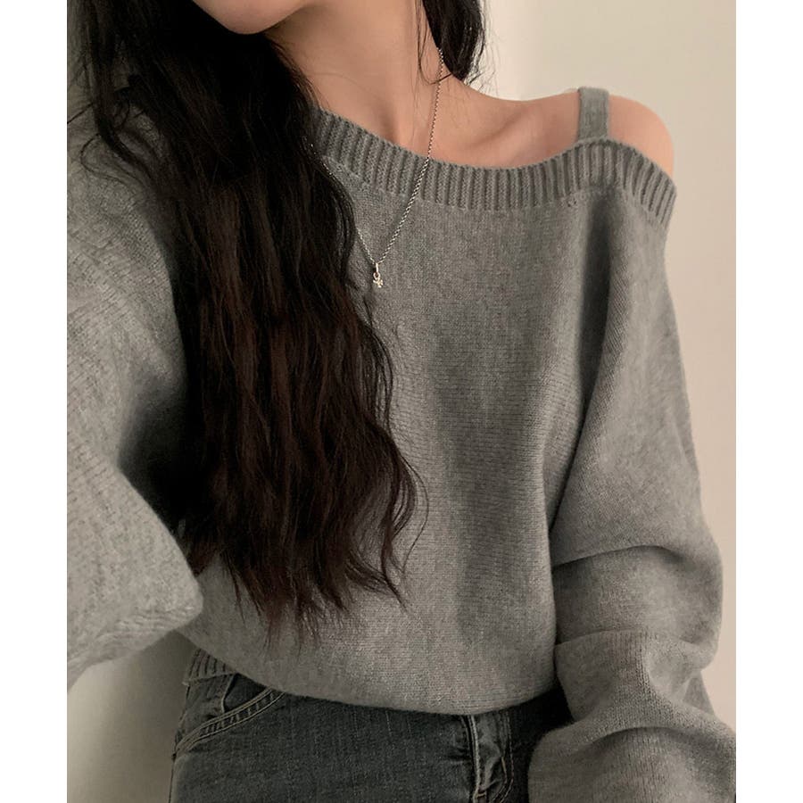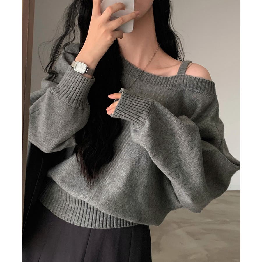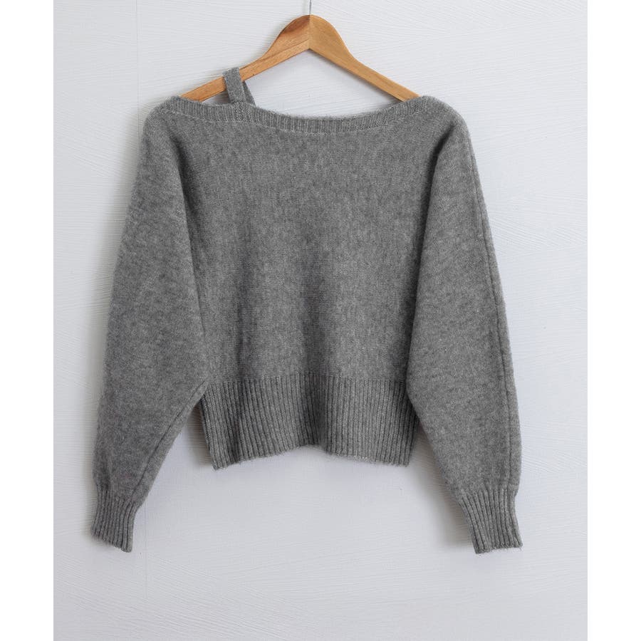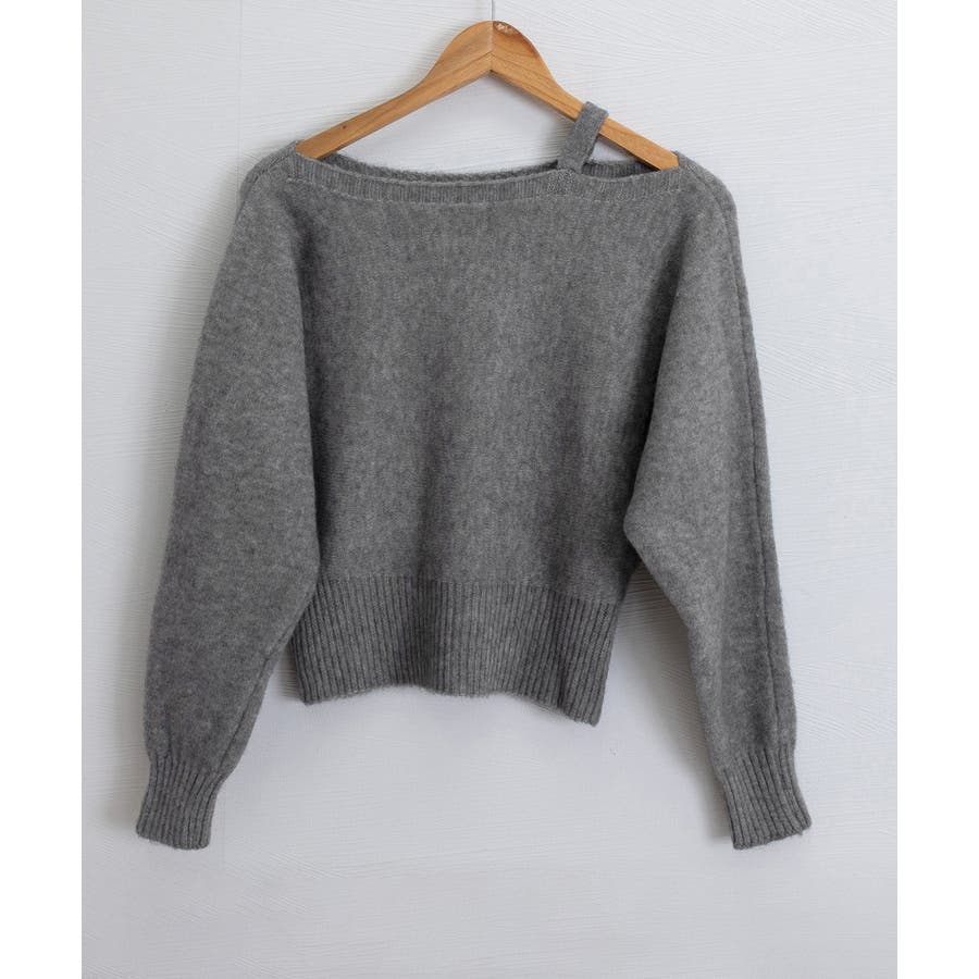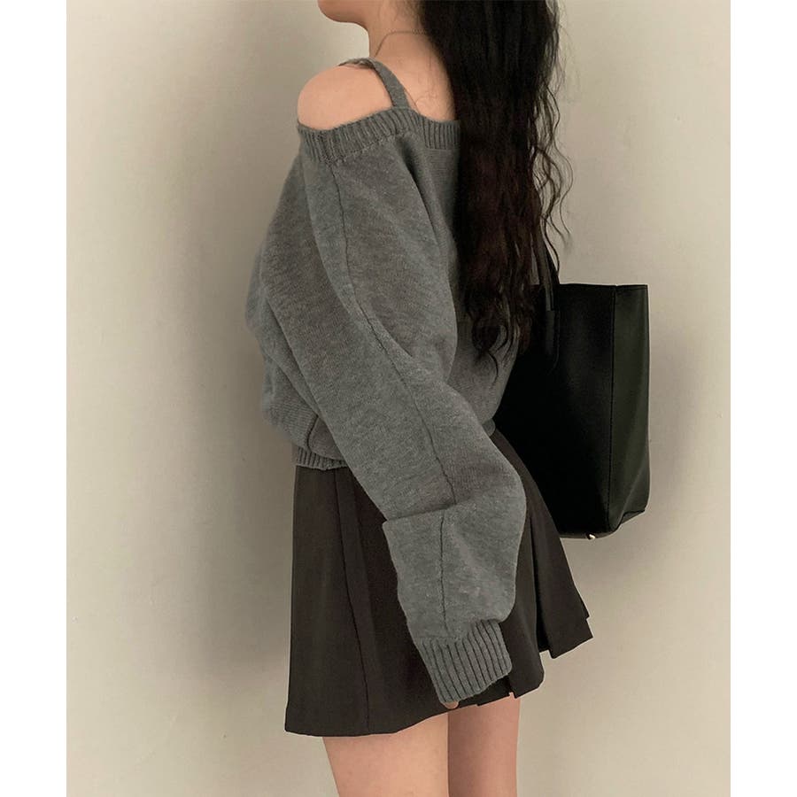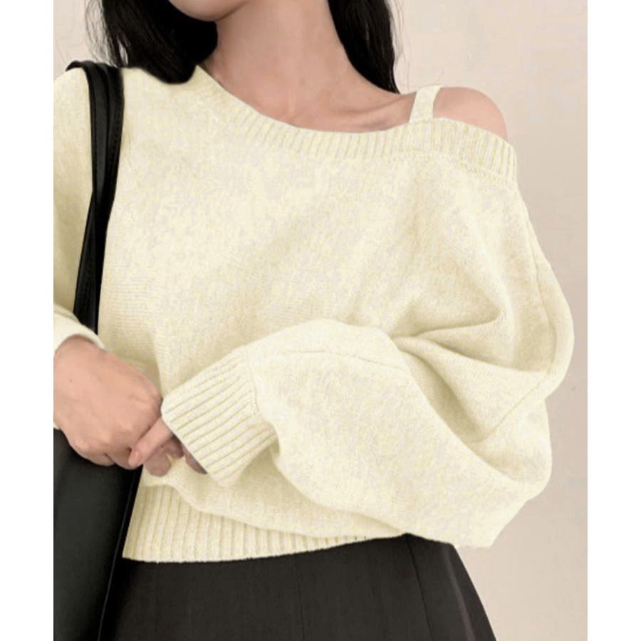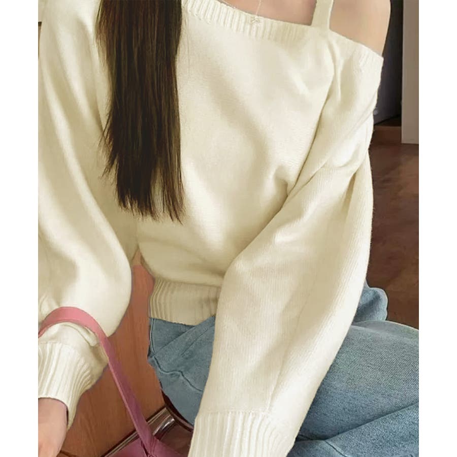ストラップ付きのオフショルダーニットトップス。