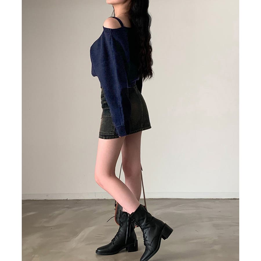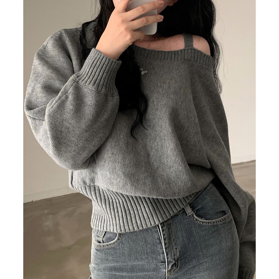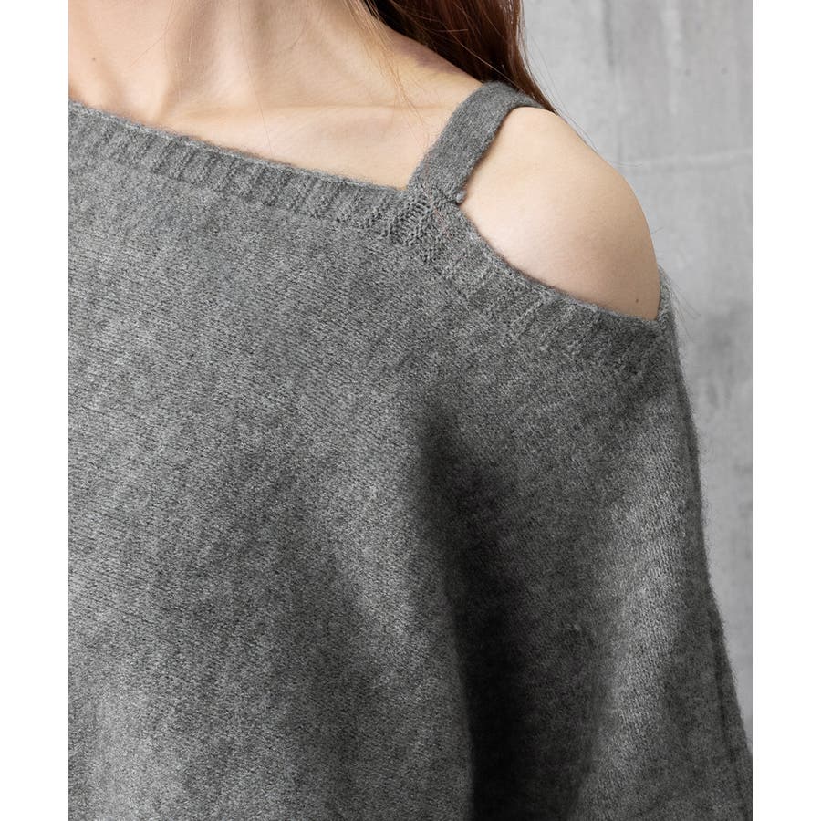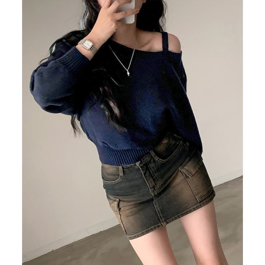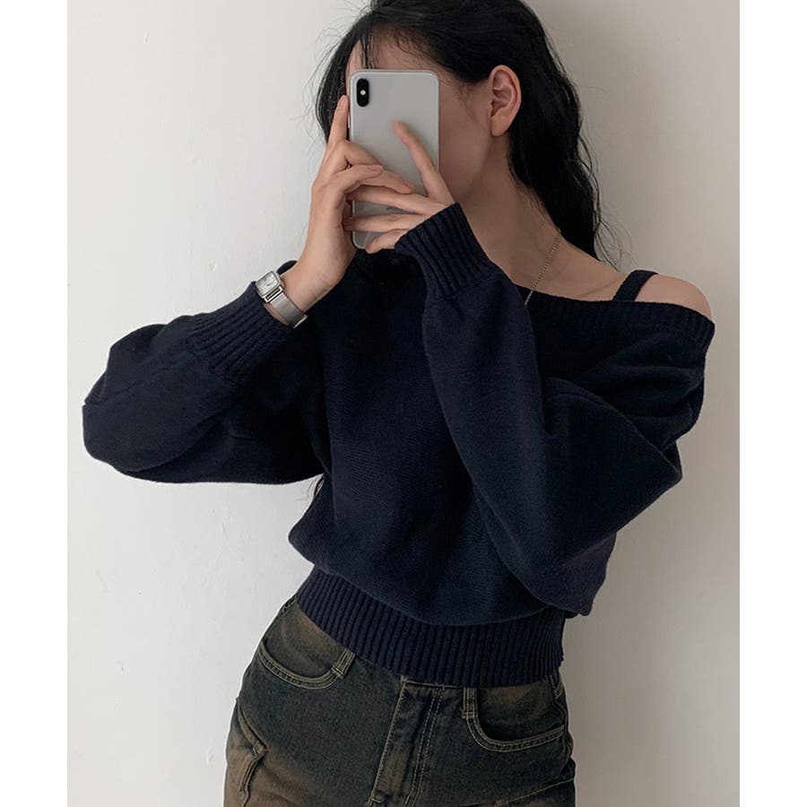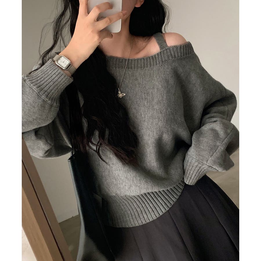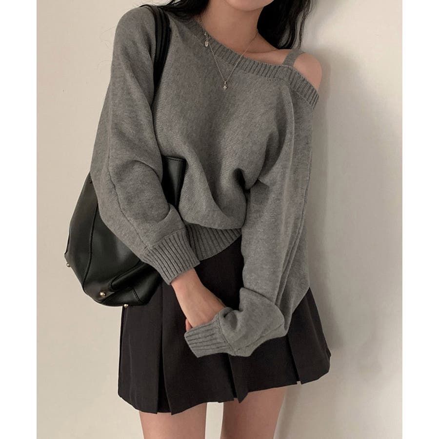 ストラップ付きのオフショルダーニットトップス。
