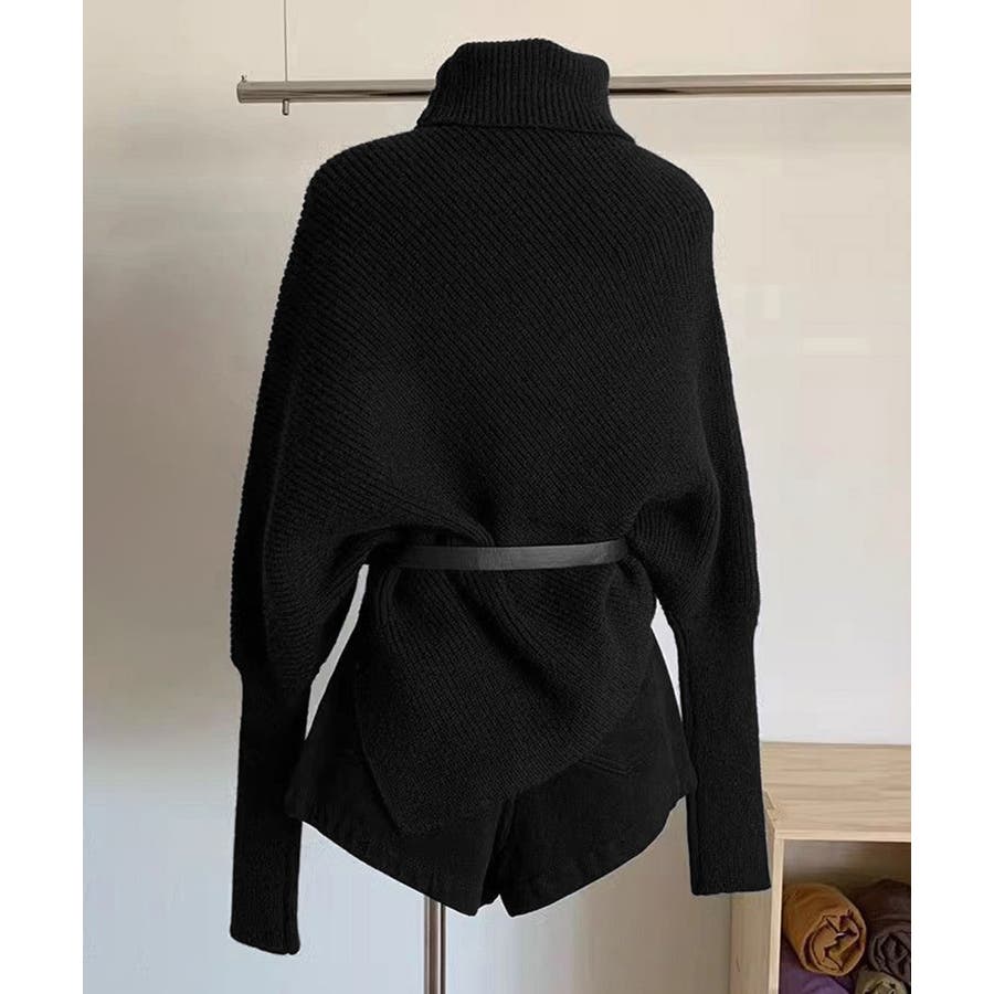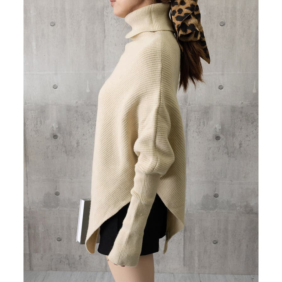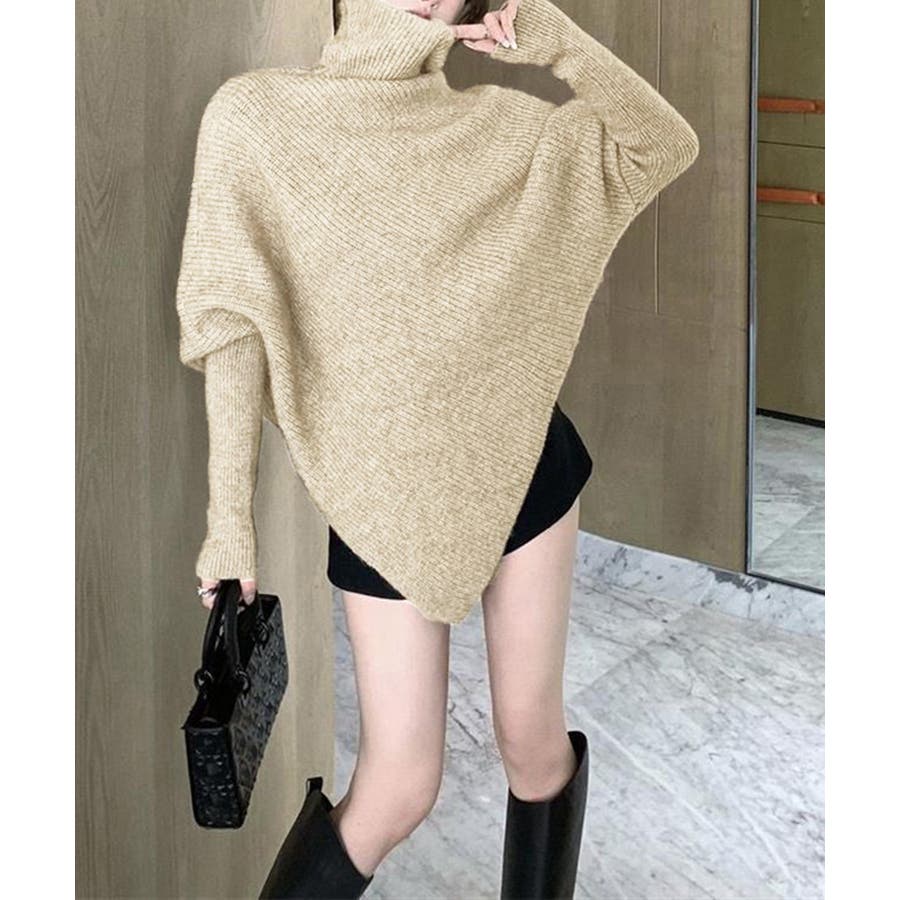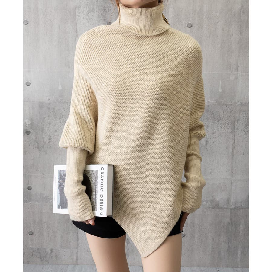 ハイネックとアシンメトリーなデザインが目を引くバットウィングスリーブニットセーター。