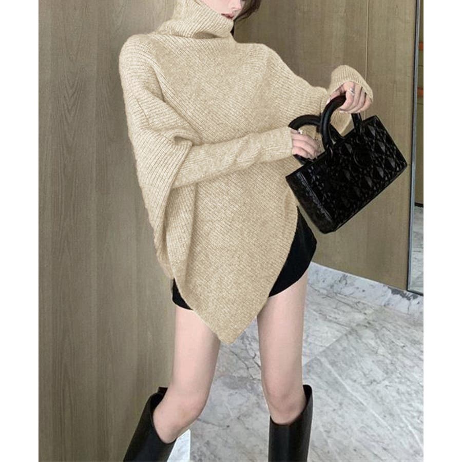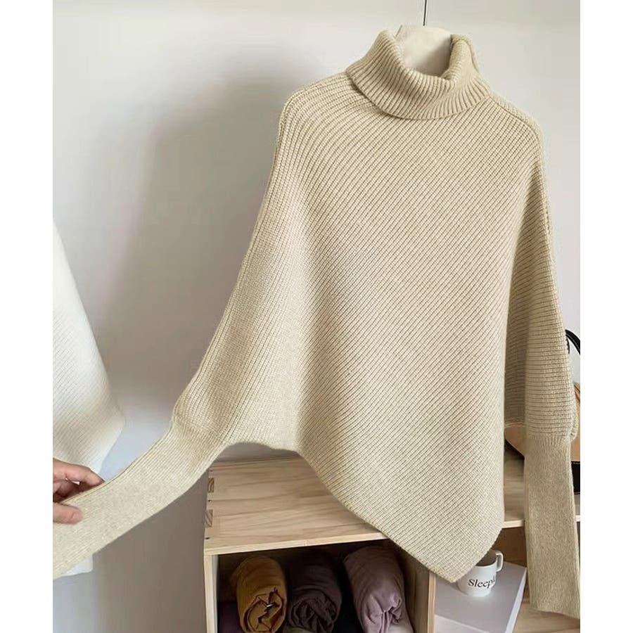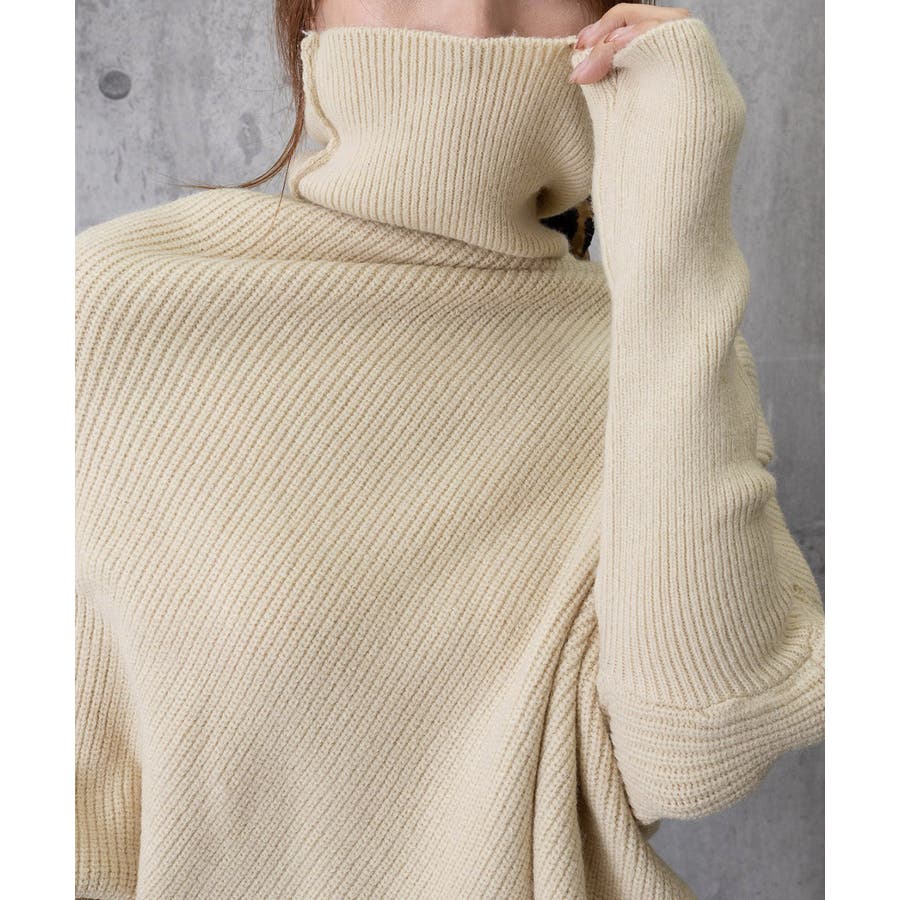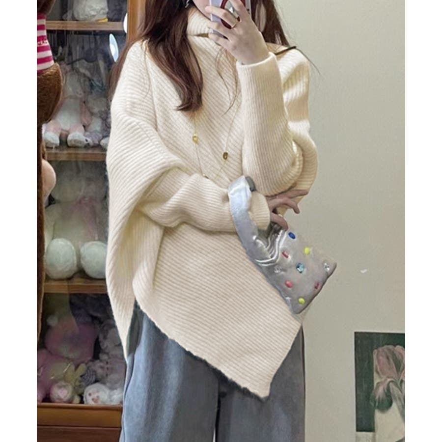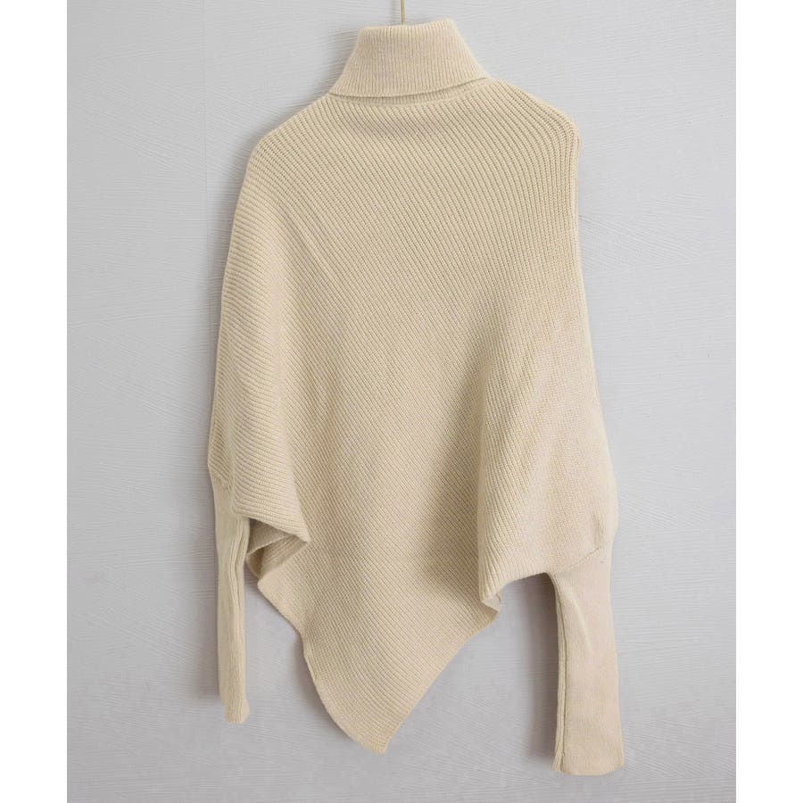 ハイネックとアシンメトリーなデザインが目を引くバットウィングスリーブニットセーター。