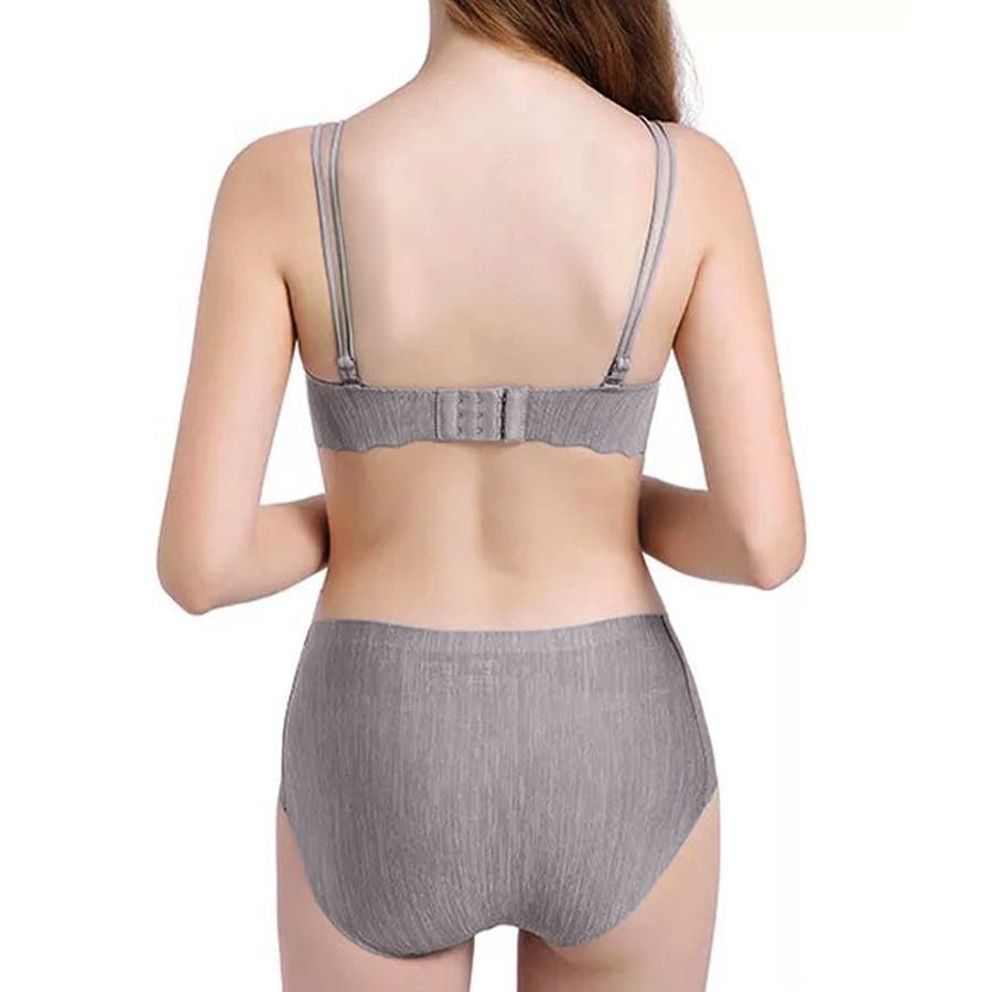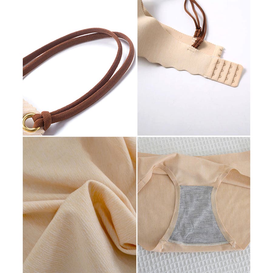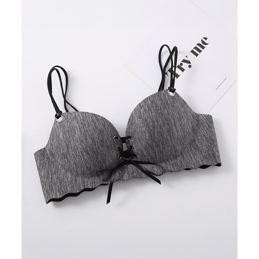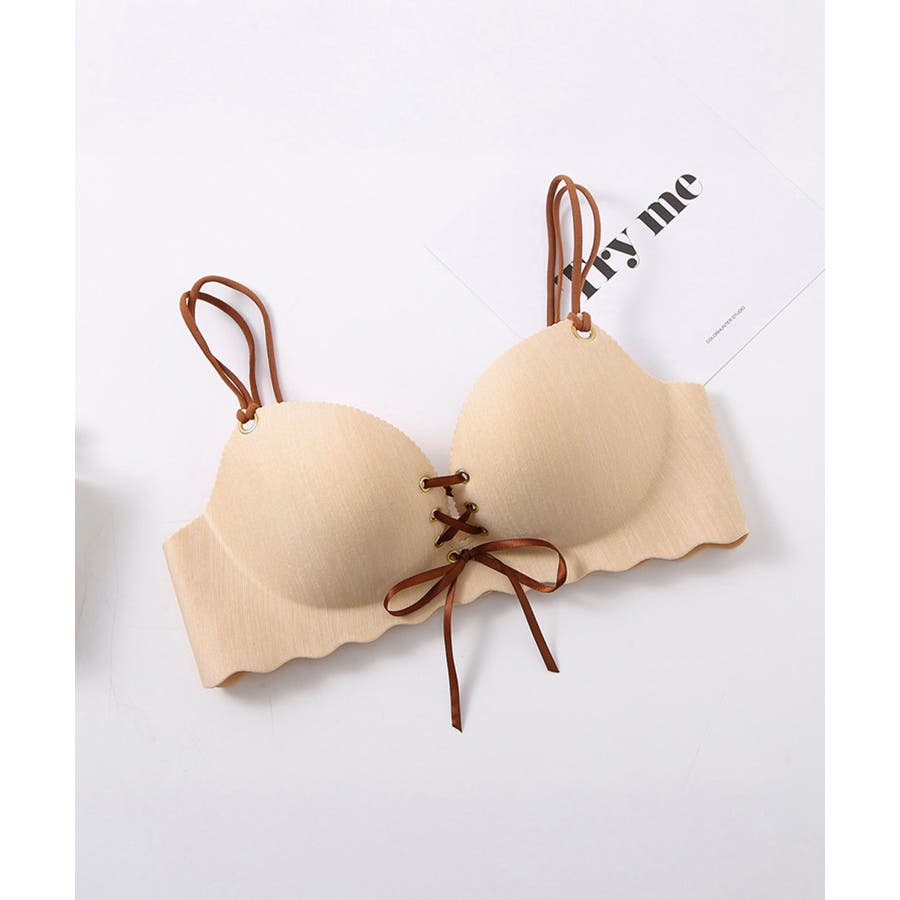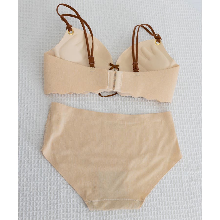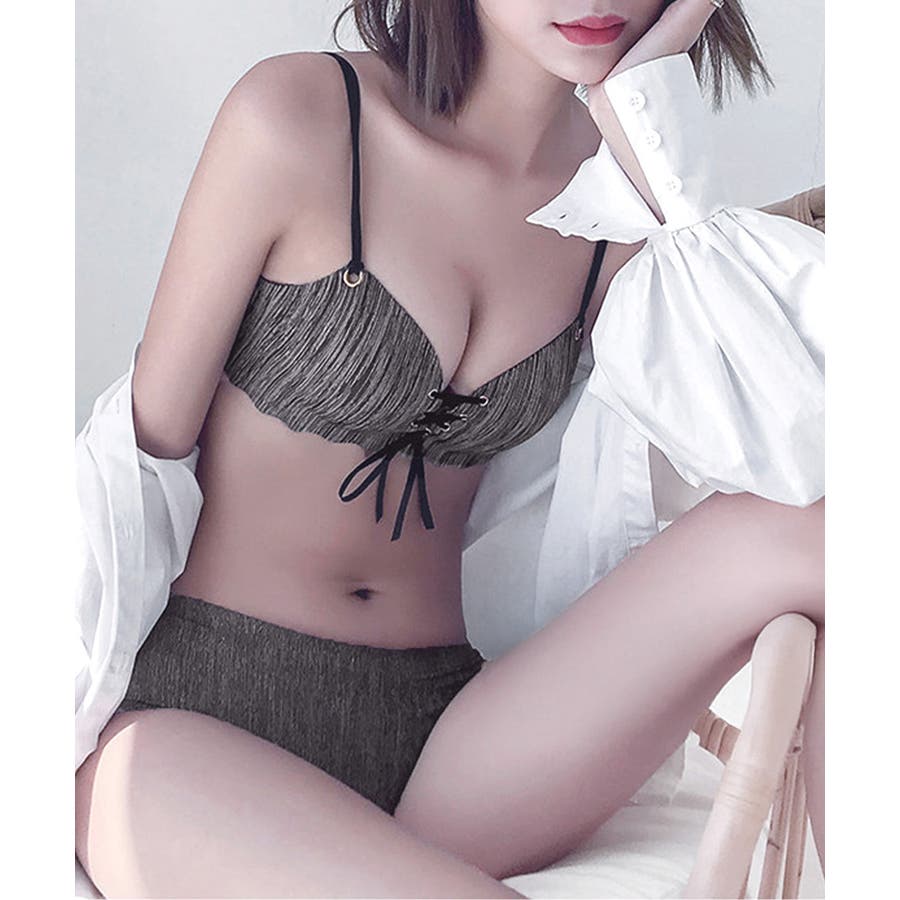 大人っぽくカジュアルなデザインのノンワイヤーブラショーツセット。ブラジャーはレースアップ仕様で、ぎゅっと結ぶことでバストを引き寄せる。