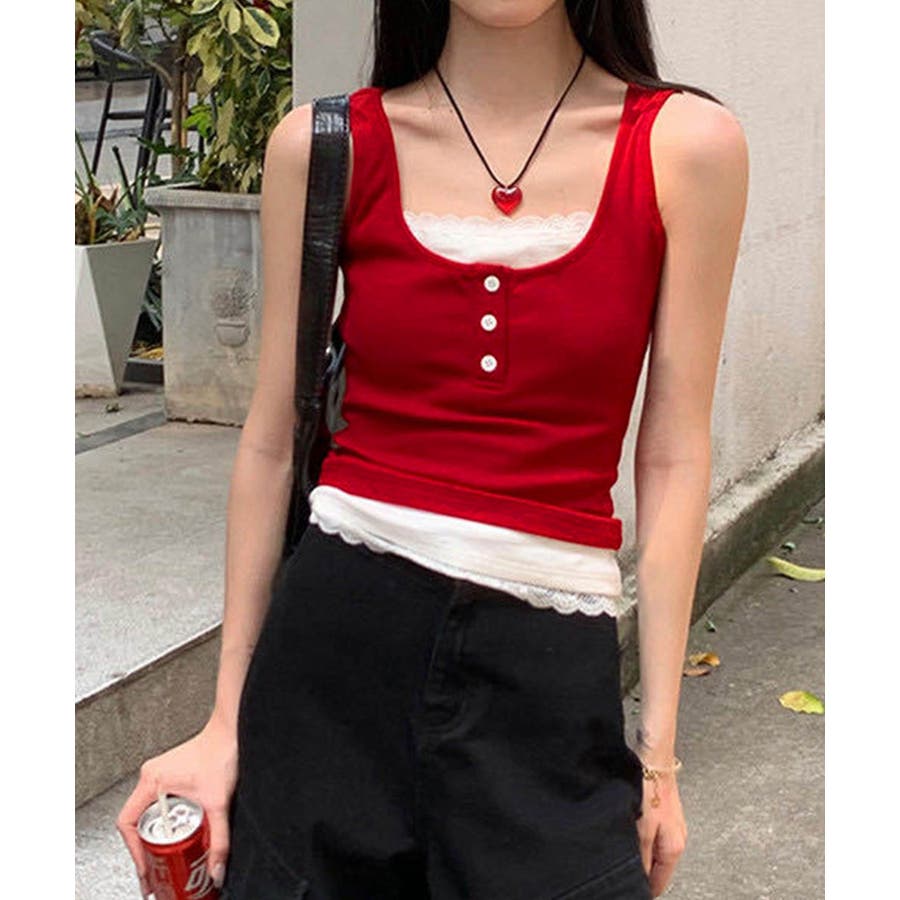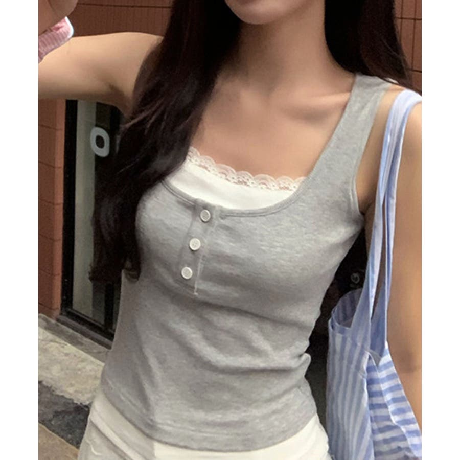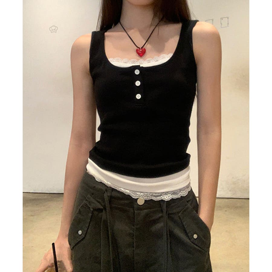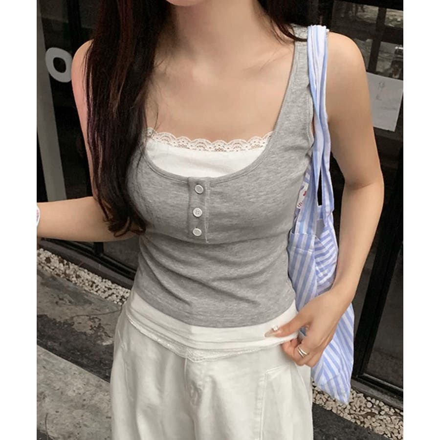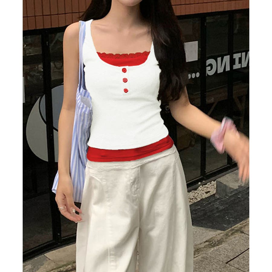 レースインナーを重ねたように見える、配色レイヤード風デザインのタンクトップ。