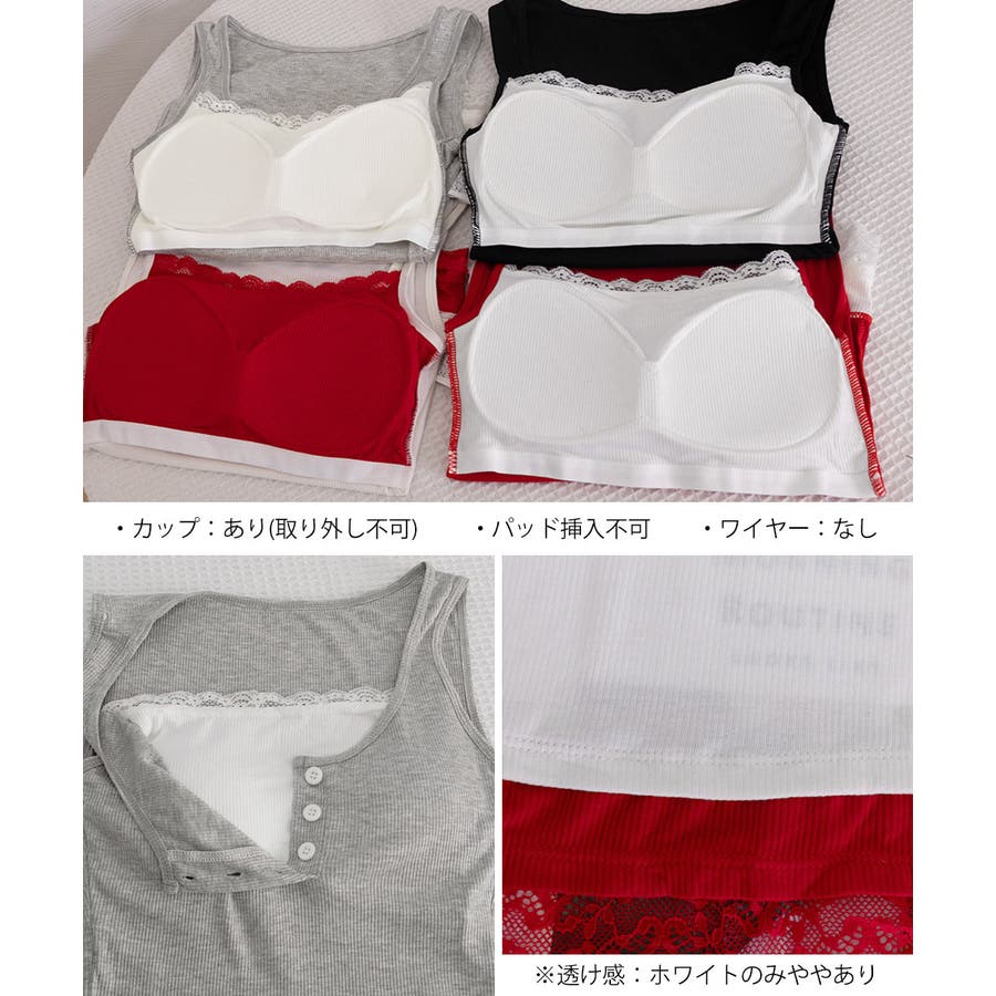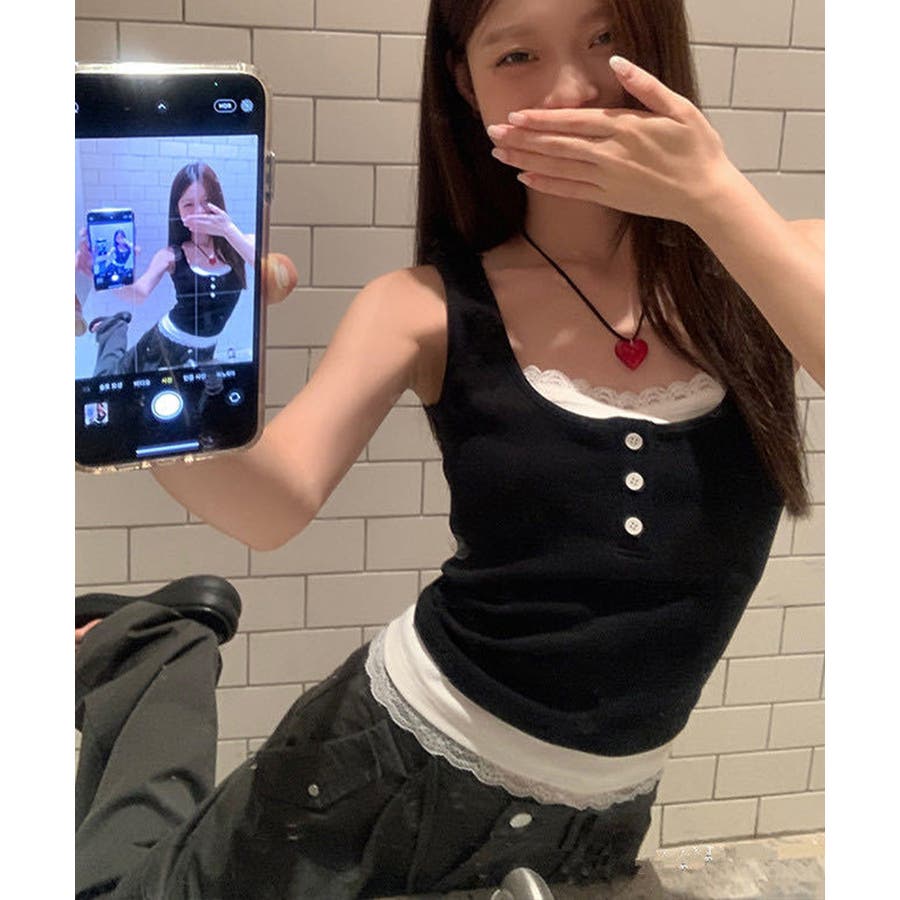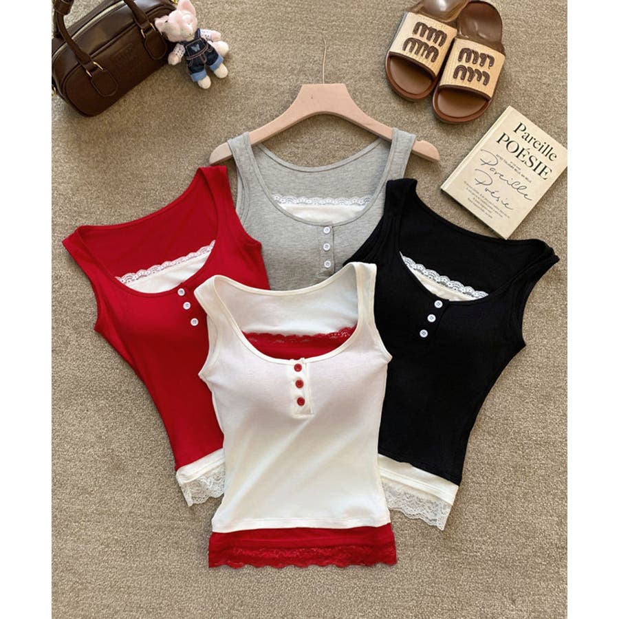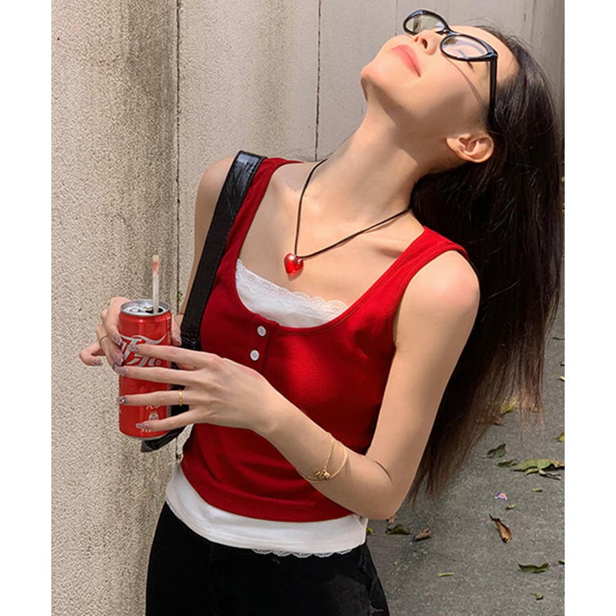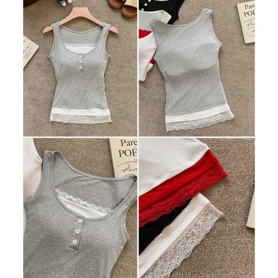 レースインナーを重ねたように見える、配色レイヤード風デザインのタンクトップ。