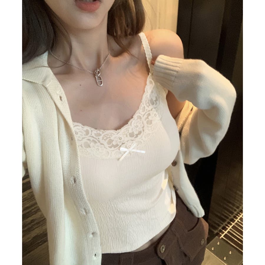 胸元にレースと小さなリボンがアクセントになった、シワ感素材のレディースキャミソール。