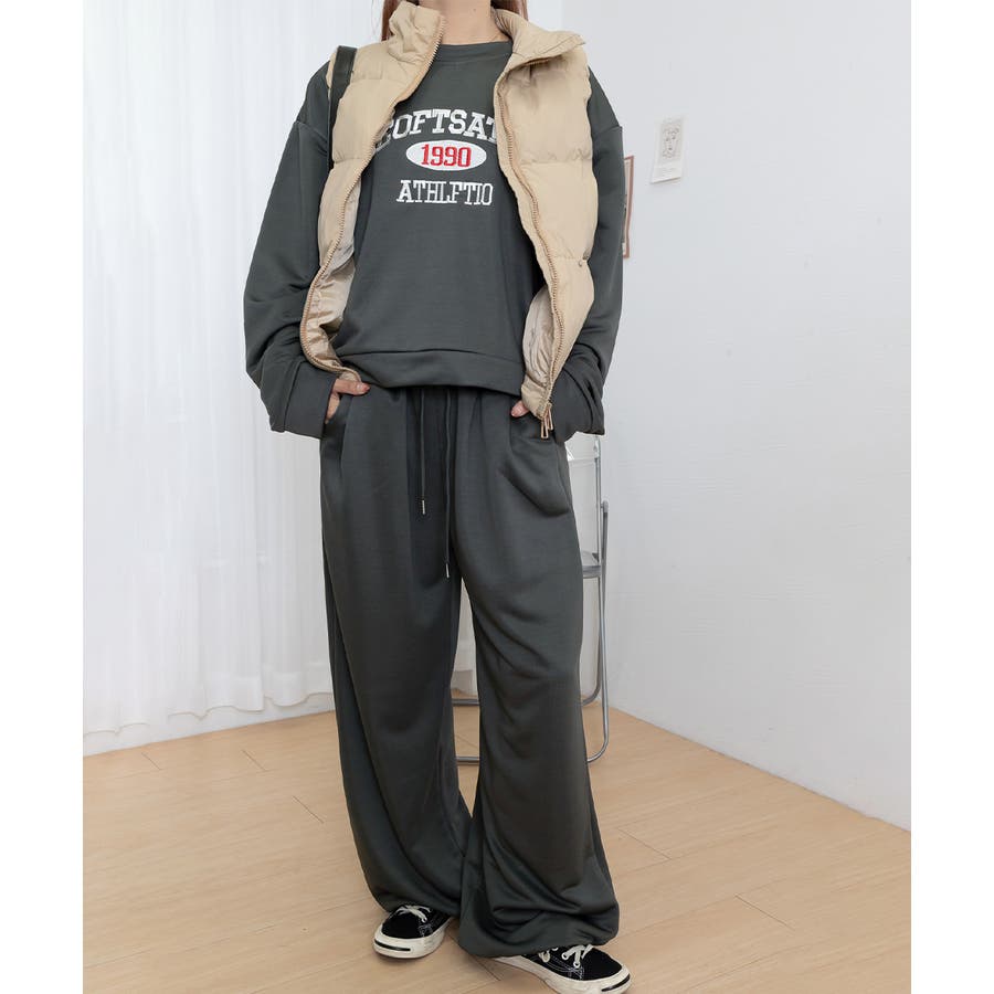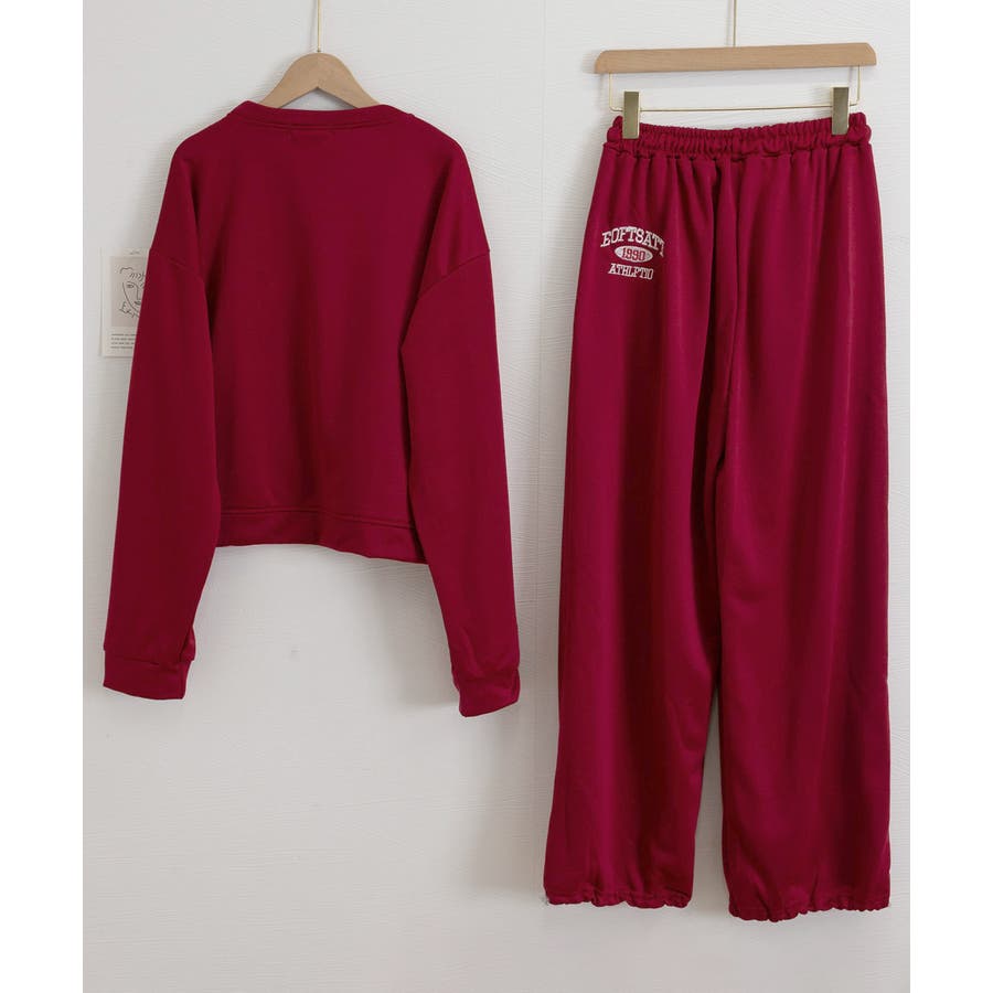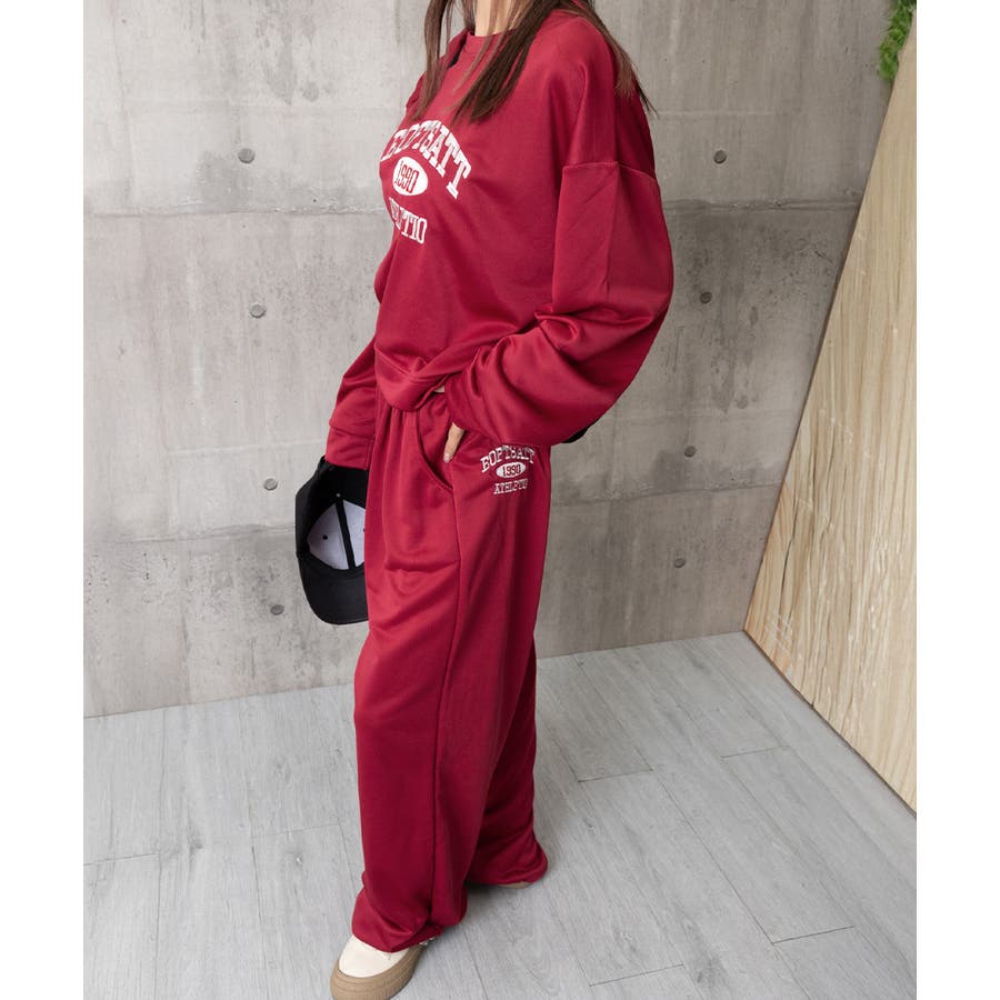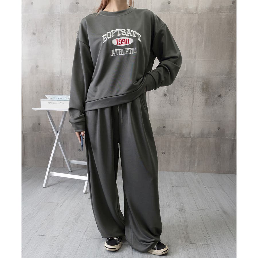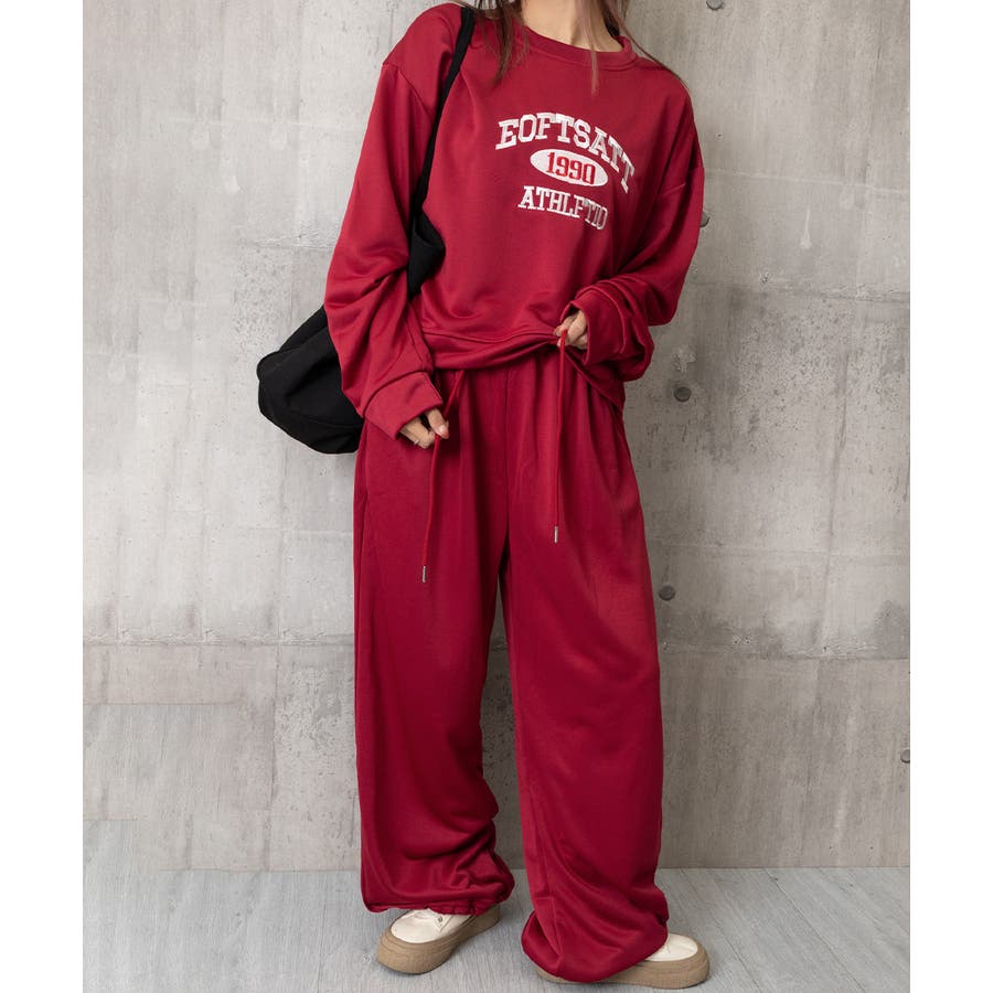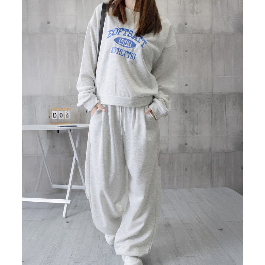 カレッジロゴが目を惹くスウェットトップスとワイドパンツのレディースセットアップ。