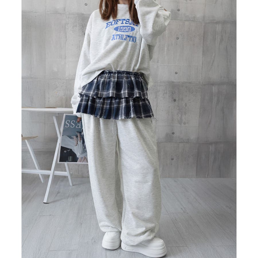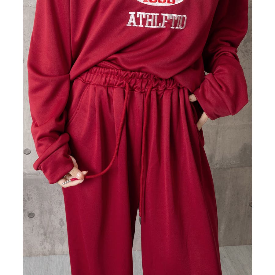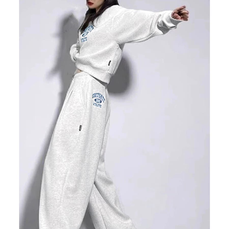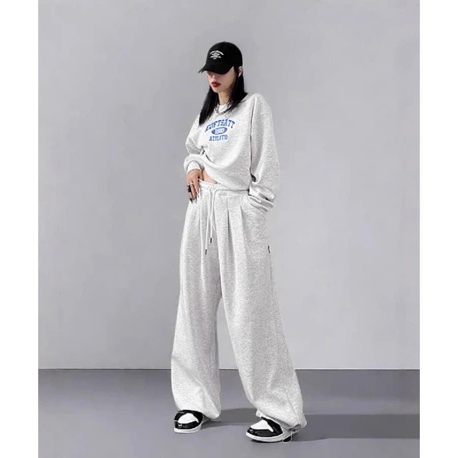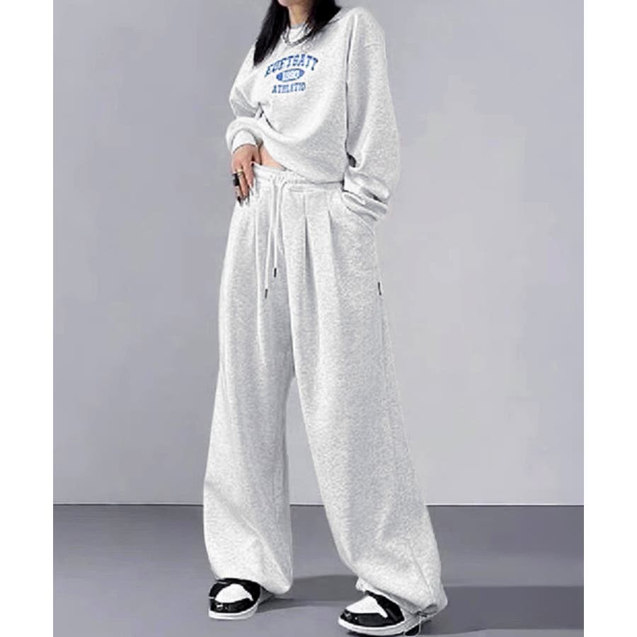 カレッジロゴが目を惹くスウェットトップスとワイドパンツのレディースセットアップ。