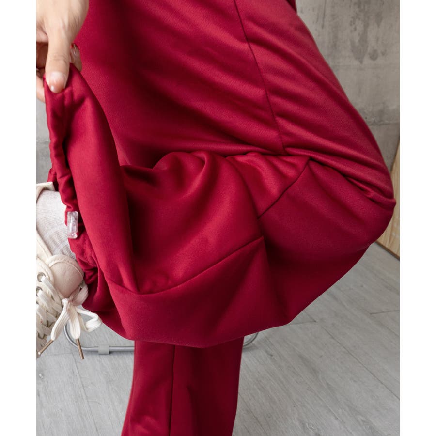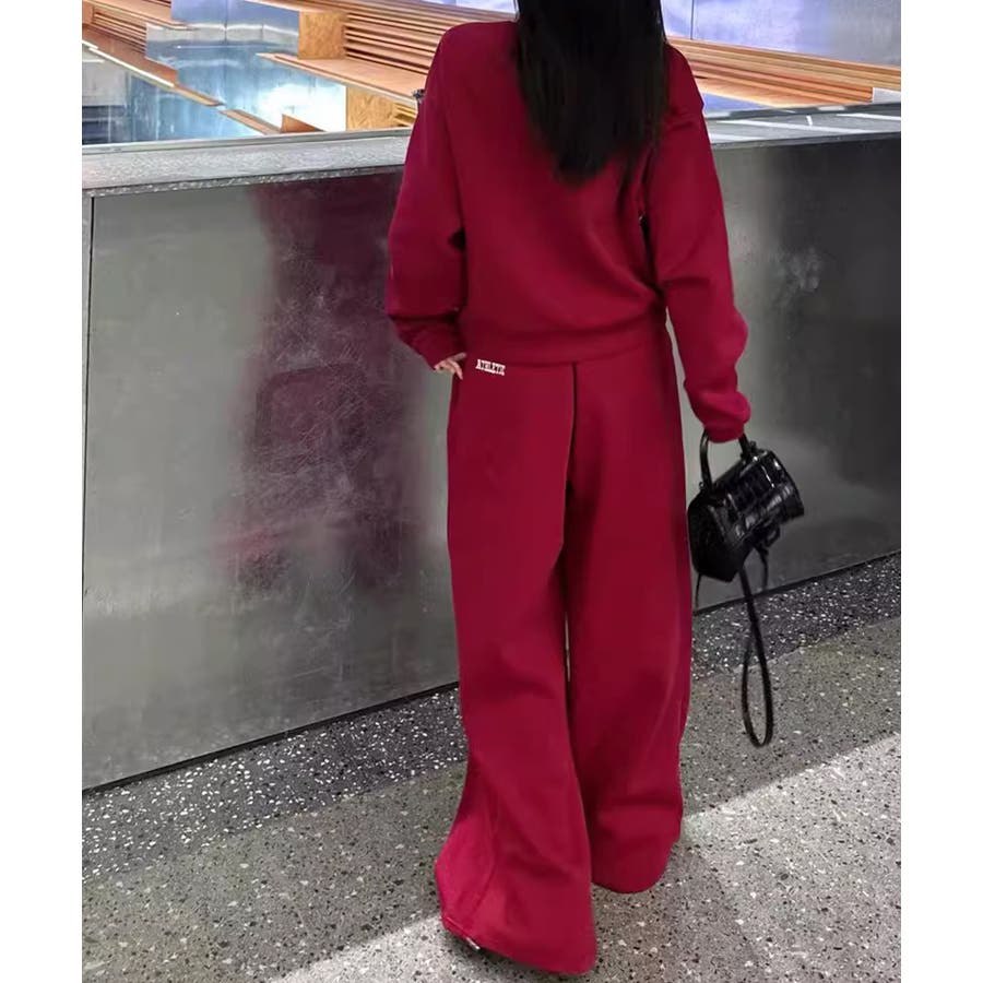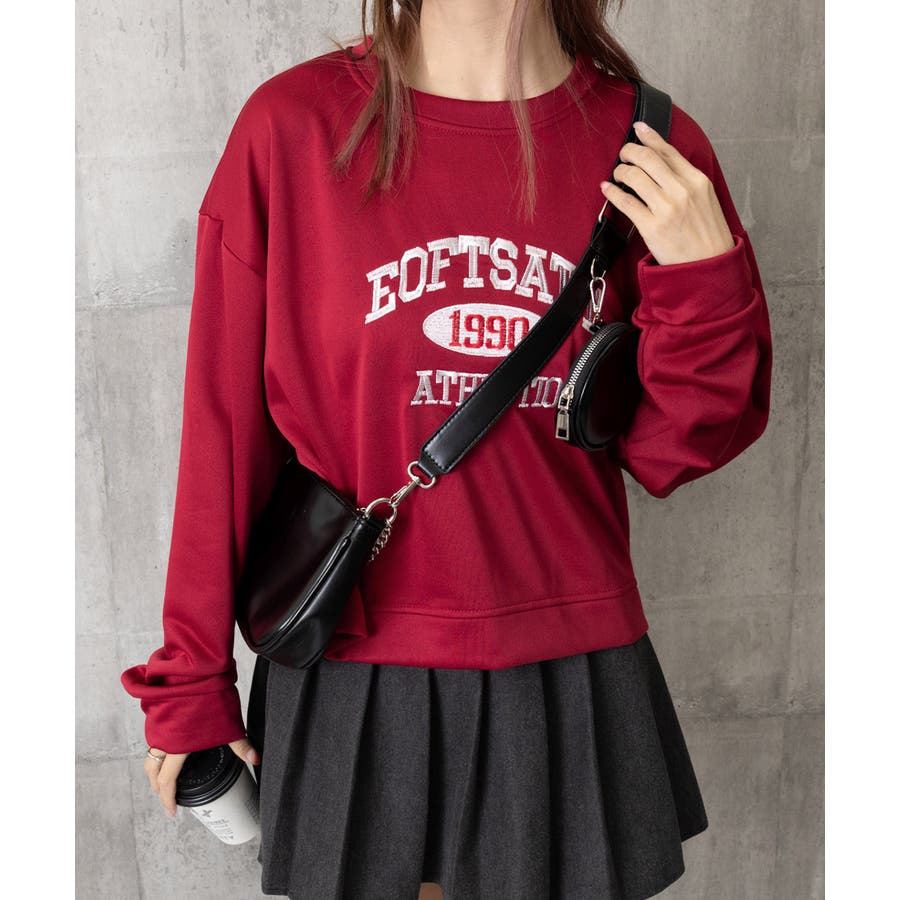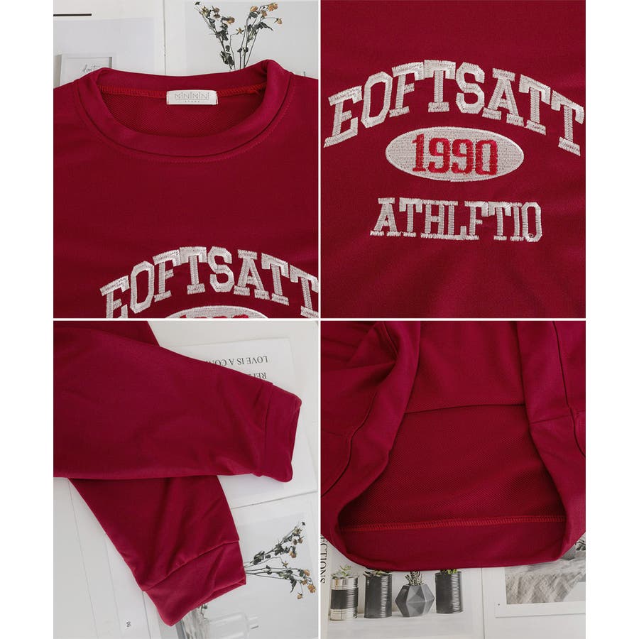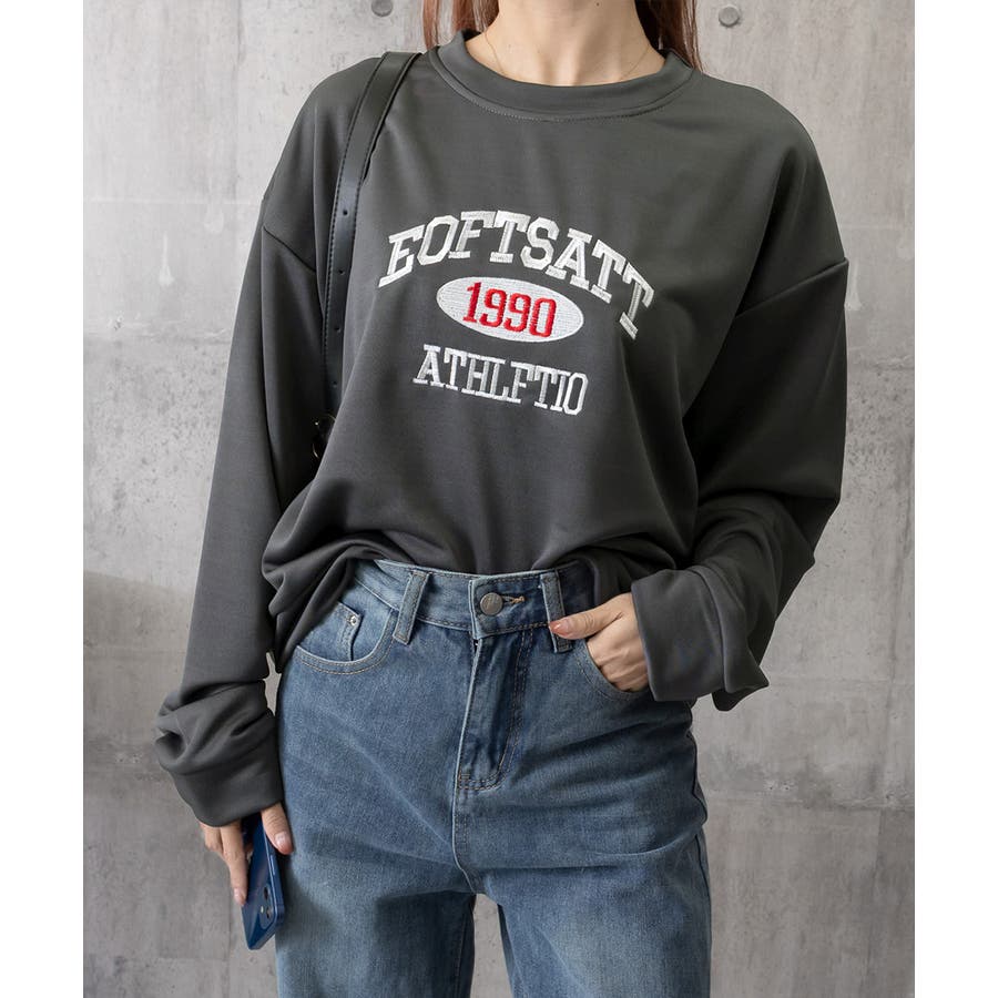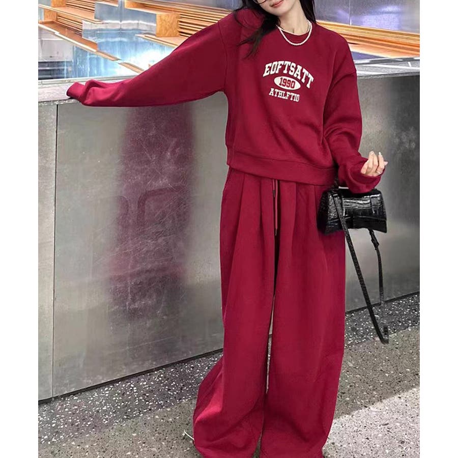 カレッジロゴが目を惹くスウェットトップスとワイドパンツのレディースセットアップ。